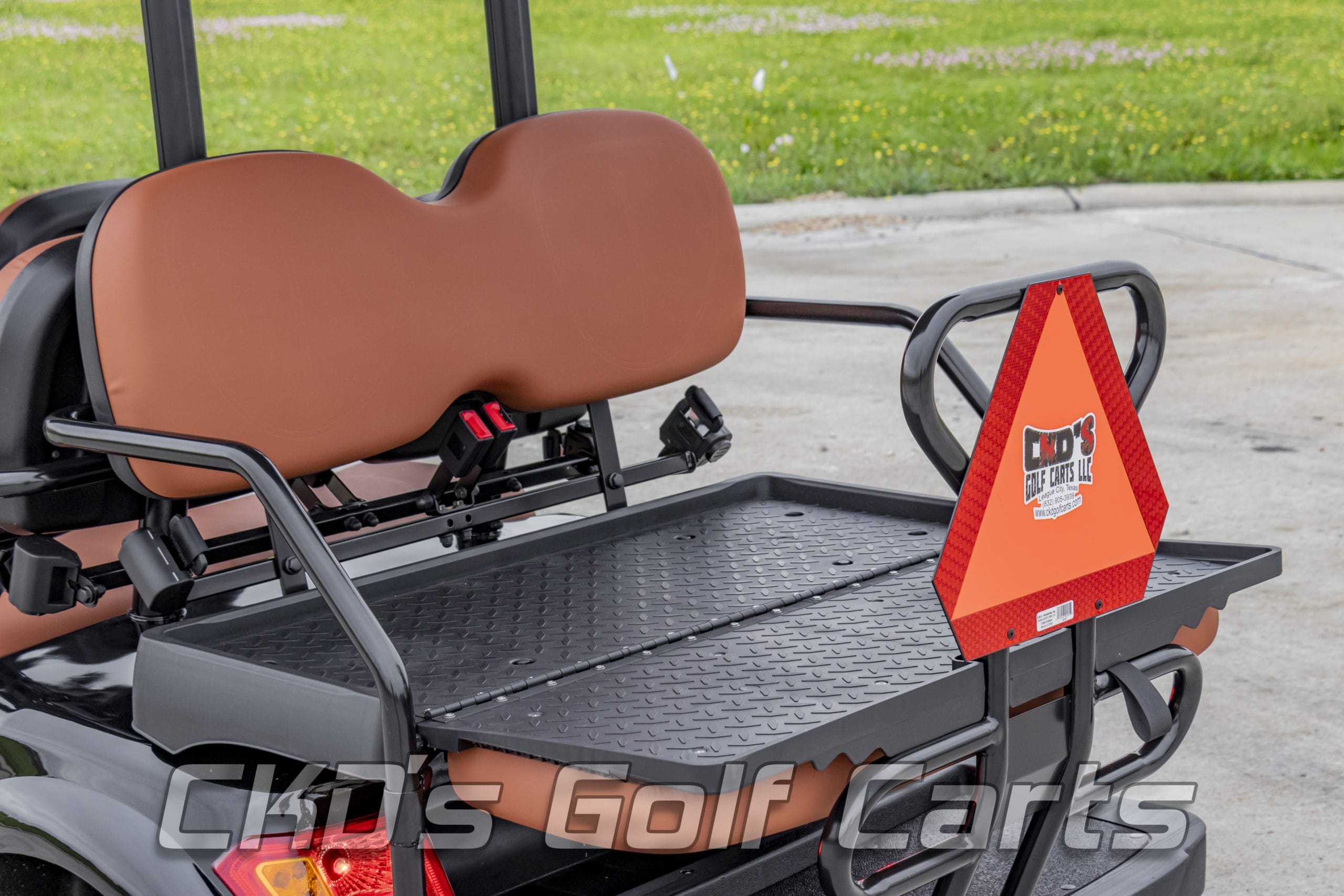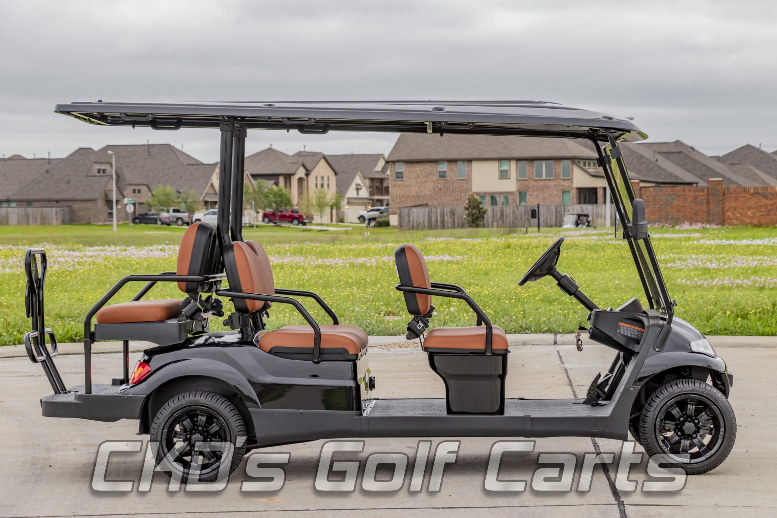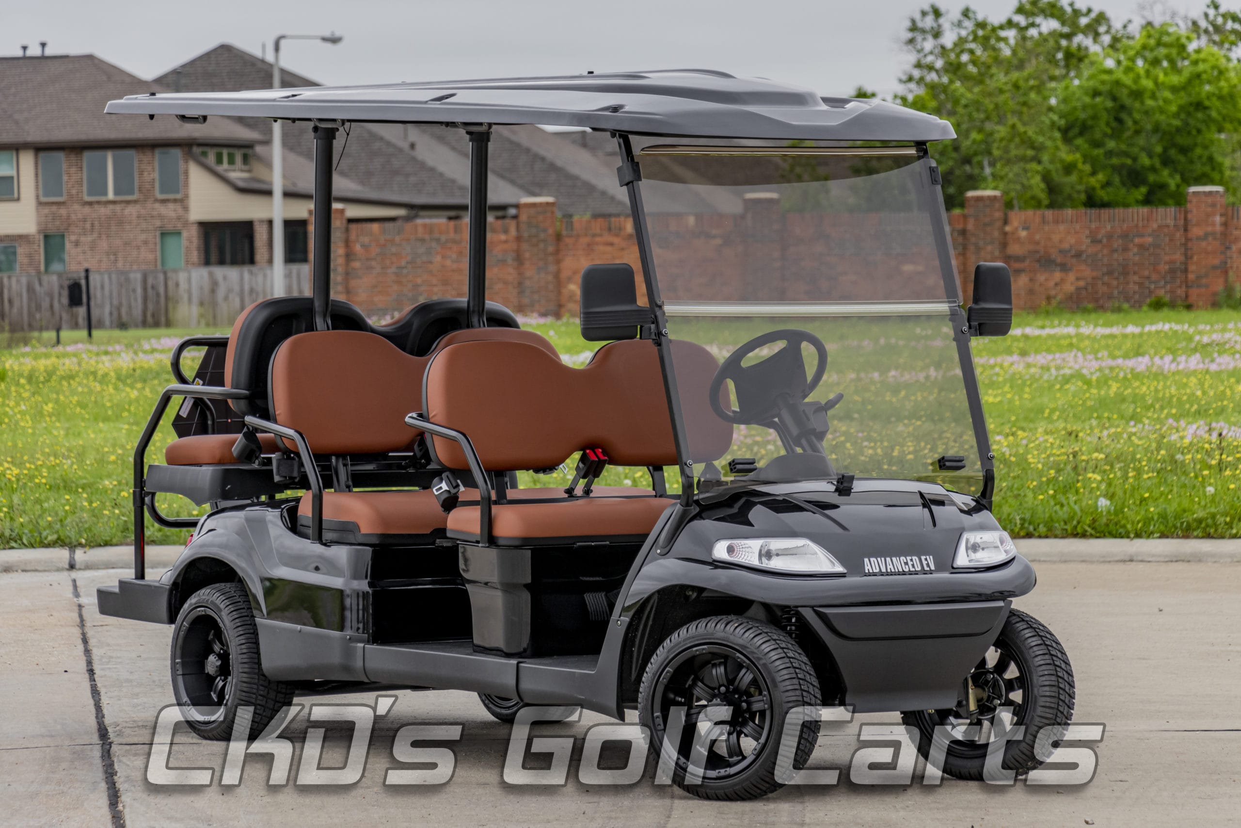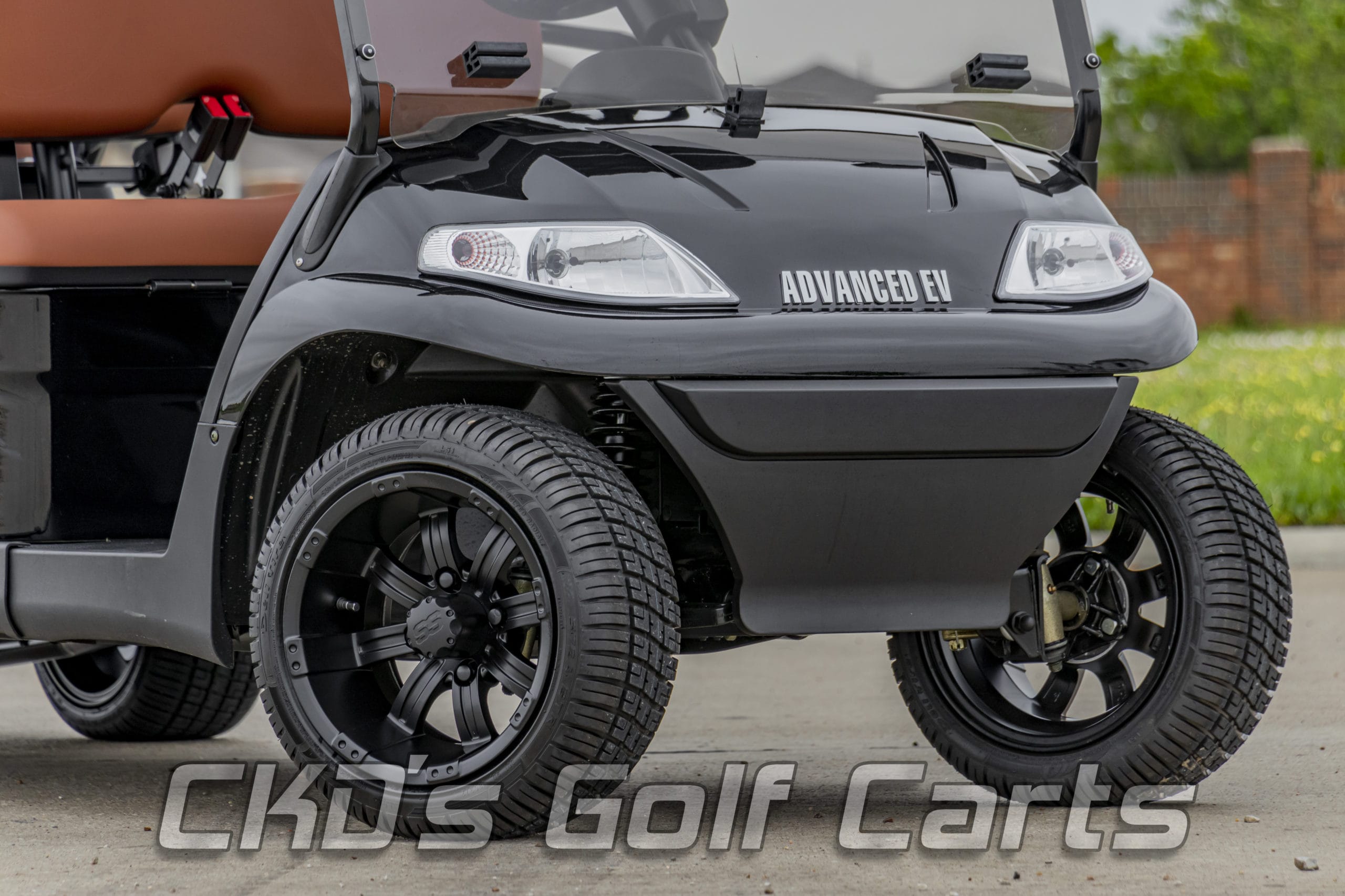 Brand new Black Metallic on Saddle Brown seats 2021 Advanced EV 4+2 six-passenger non-lifted golf cart and neighborhood cruiser. 48 volt AC drive with new US Batteries, Toyota 350 amp AC controller & 4kW 5.5 hp motor, onboard charging system, powder-coated frame and chassis, 4-wheel coil spring over shock suspension, color-matched long top with grab handles, rear flip seat with safety/grab bar, (can add swinging cup holders). Ultimate Light Kit (includes headlights, taillights, brake lights, turn signals, emergency flashers, and a horn), digital speedometer, digital odometer, digital state of charge meter, dual USB outlets, side-mounted rearview mirrors, (6) retractable seat belts, 48 to 12-volt reducer, 12″ custom matte black Tempest wheels with low profile tires, tinted folding windshield and SMV sign. This cart comes with a limited 2-year warranty!