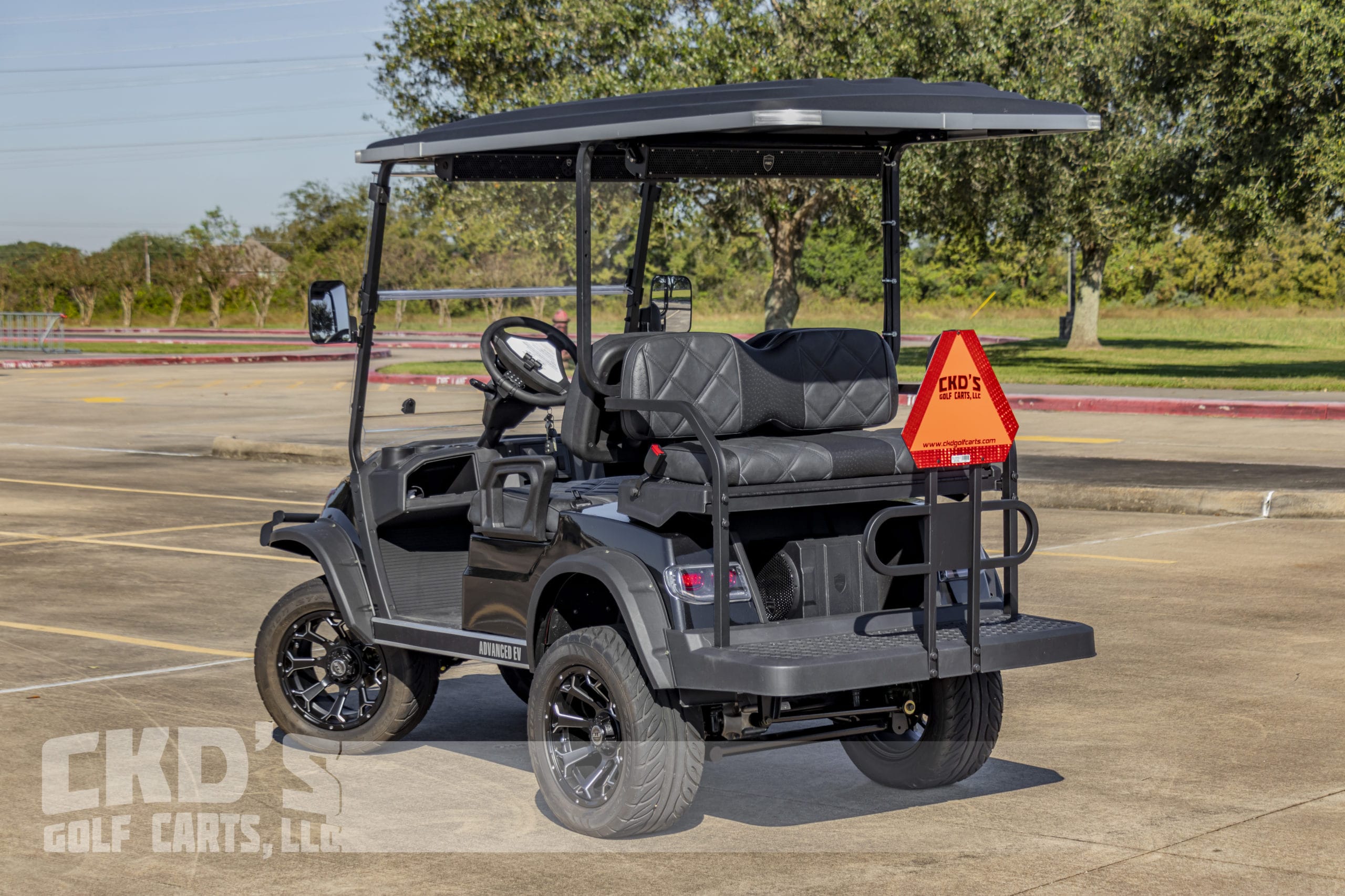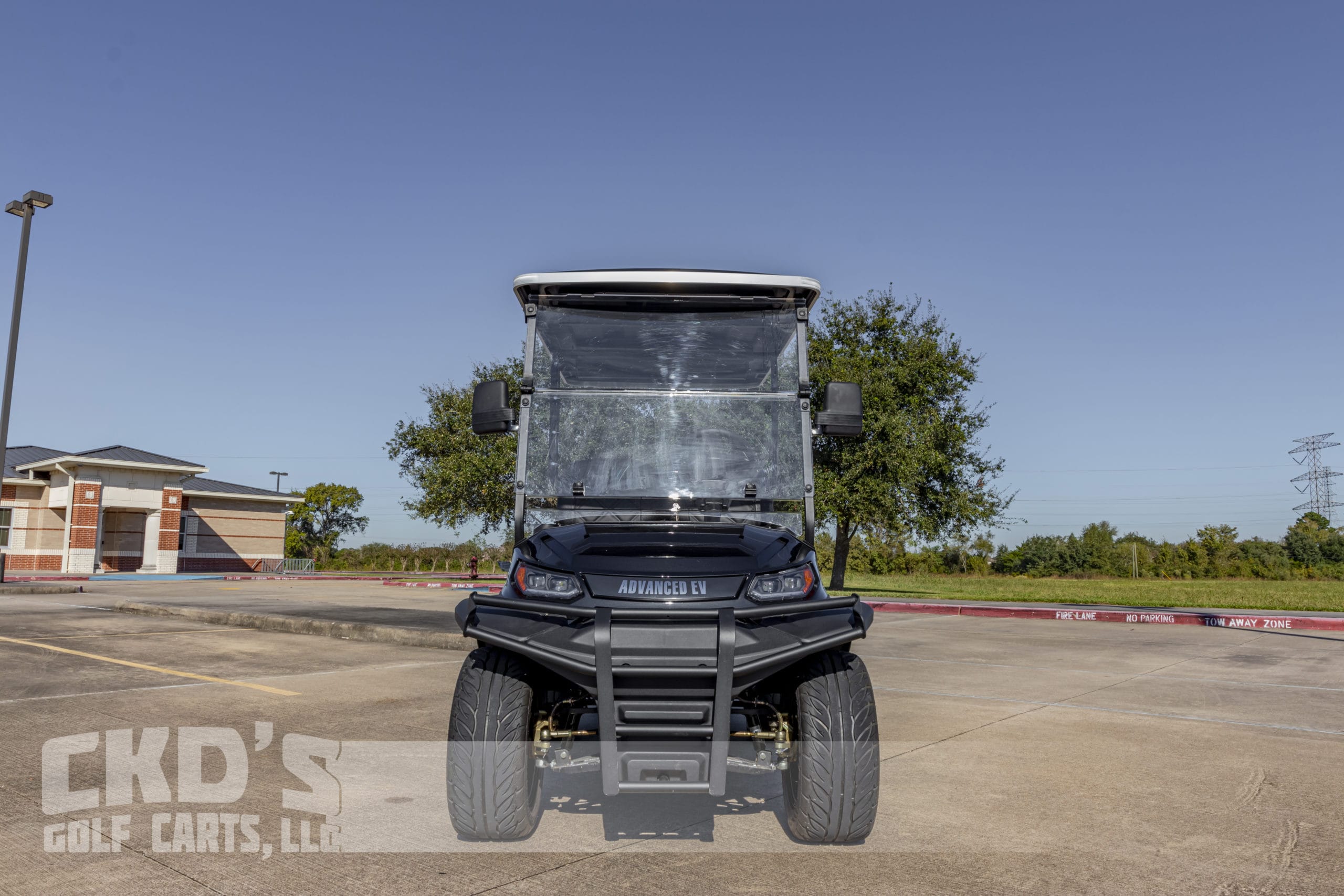 Brand New Special Edition Jet Black 2021 Advanced EV 2+2 four-passenger lifted golf cart and neighborhood cruiser. 48 volt AC drive with new Trojan Batteries, Toyota 350 amp AC controller & 4kW 5.5 hp motor, onboard charging system, powder-coated frame and chassis, 4-wheel coil spring over shock suspension, black long top with grab handles, rear flip seat with safety/grab bar and can add swinging cup holders. Ultimate LED Light Kit (includes headlights, taillights, brake lights, tum signals, emergency flashers, and a horn), digital speedometer, digital odometer, digital state of charge meter, dual USB outlets, side-mounted rearview mirrors, custom black and grey double diamond-stitched seat upholstery with Ostrich inserts, (4) retractable seat belts, 48 to 12-volt reducer, custom 14″ black and Machined GTW Raven Wheels with 23″ Fusion GTR DOT rated Street Tires, fender flares, brush guard bumper, folding windshield, Wetsounds Stealth 10 Ultra HD paired with the Wetsounds Stealth 10 Surge and Wetsounds AS-8 powered subwoofer and SMV sign. This cart comes with a limited 2-year warranty!