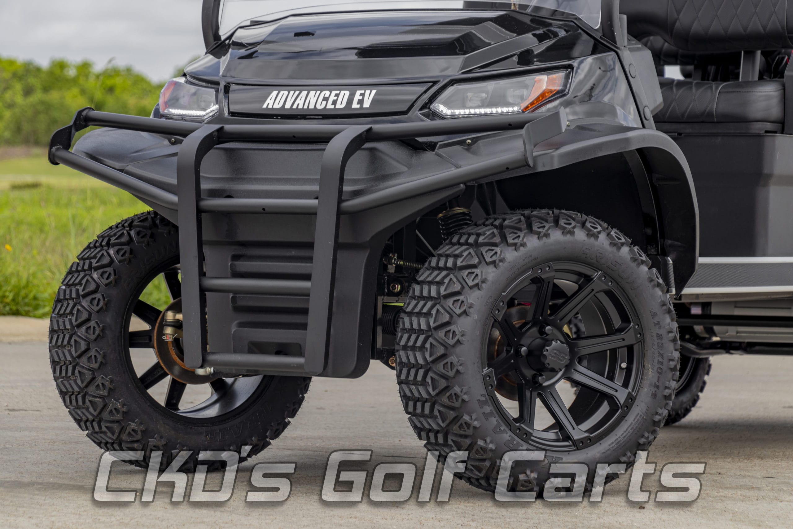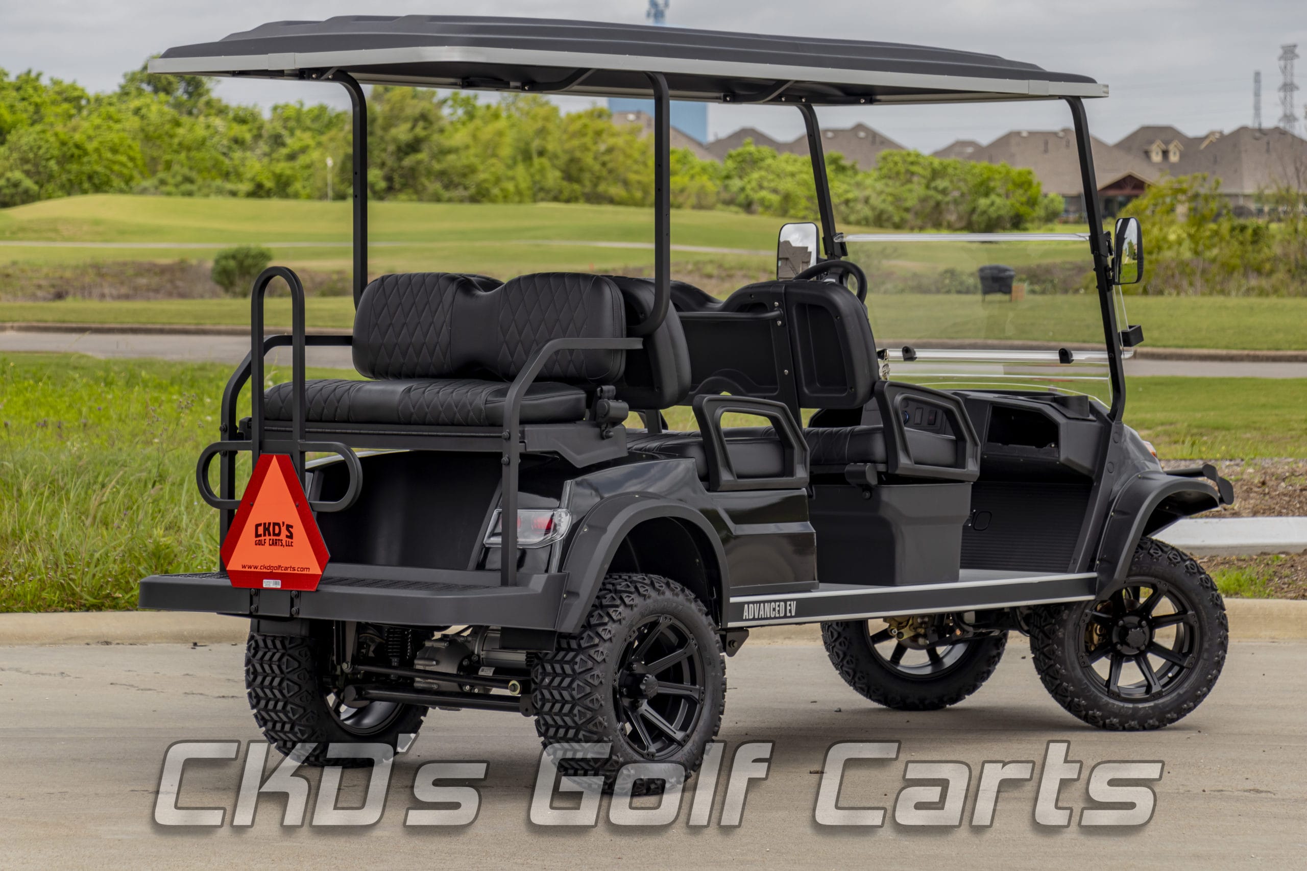 Brand New 2021 Jet Black with Black seats, 2021 Advanced EV Advent 4+2 six-passenger lifted golf cart and neighborhood cruiser. 48 volt AC drive with new US Batteries, 350 amp AC controller, 4kW 5.5 hp motor, onboard charging system, powder-coated frame and chassis, 4-wheel disc brakes, independent front suspension, coil spring over shock rear suspension, color-matched long top with grab handles, rear flip seat with grab bar and can add swinging cup holders, Ultimate Light Kit (includes headlights, taillights, brake lights, turn signals and a horn), digital speedometer, digital odometer, digital state of charge meter, side-mounted rearview mirrors, (6) retractable seat belts, 48 to 12-volt reducer, dual USB outlets, 14″ matte black Rampage wheels with 23 inch X-Trail tires, fender flares, brush guard bumper, folding windshield and SMV sign. This cart comes with a limited 2-year warranty!
