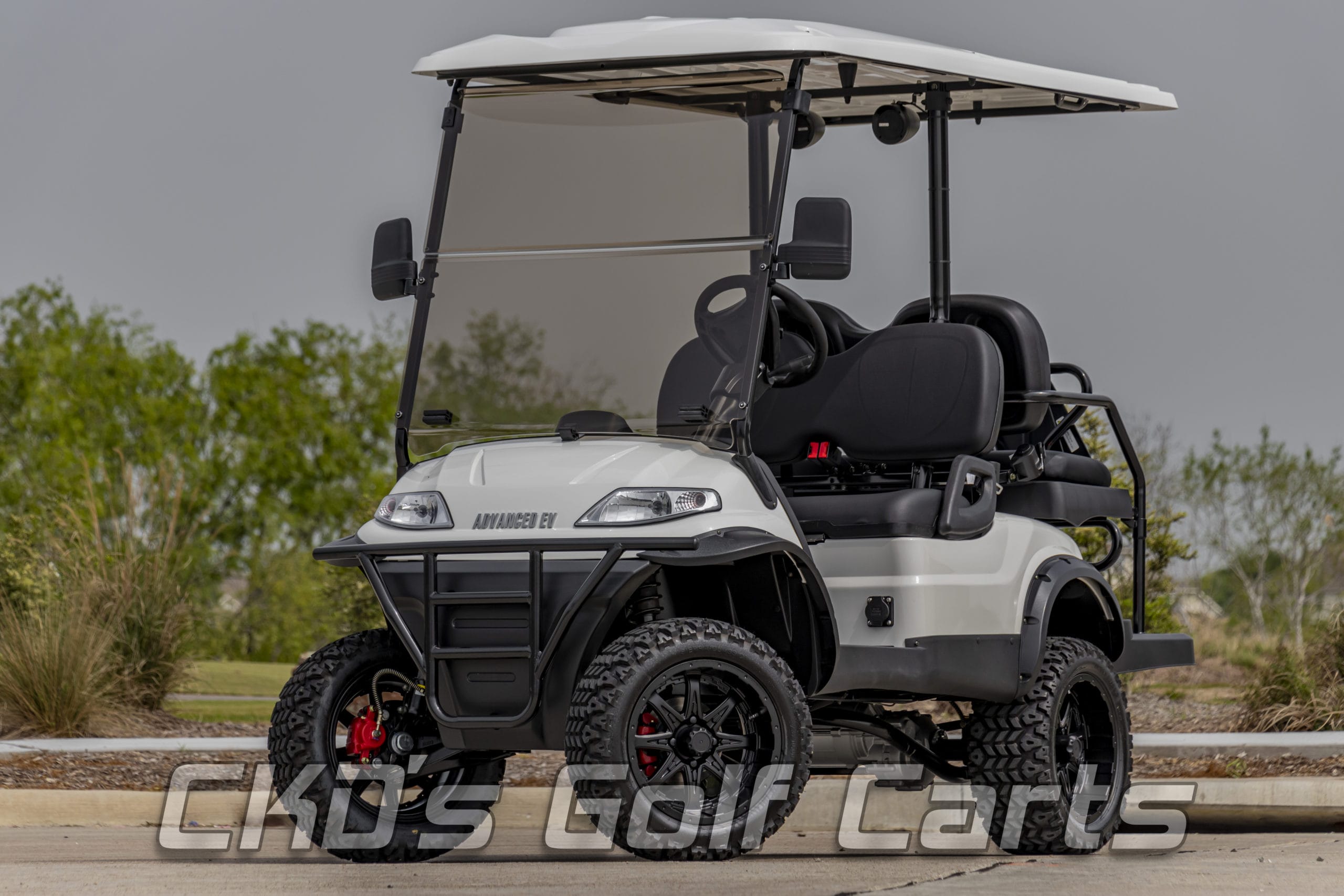 Brand New 2021 Glacier White with Black seats Advanced EV 2+2 four-passenger lifted golf cart and neighborhood cruiser. 48 volt AC drive with new US Batteries, Toyota 350 amp AC controller and 4kW 5.5 hp motor, onboard charging system, powder-coated frame and chassis, 4-wheel disc brakes, independent front suspension, coil spring over shock rear suspension, color-matched long top with grab handles, rear flip seat with grab bar and swinging cup holders, Ultimate Light Kit (includes headlights, taillights, brake lights, turn signals, emergency flashers, and a horn), digital speedometer, digital odometer, digital state of charge meter, side-mounted rearview mirrors, (6) retractable seat belts, 48 to 12-volt reducer, dual USB outlets, 14″ Matte Black Revenge wheels with 23×10-14 Sierra Classic tires, Memphis Audio Bluetooth system with 2 speakers, fender flares, brush guard bumper, tinted folding ‘magnetic latch’ windshield and SMV sign. This cart comes with a limited 2-year warranty!
