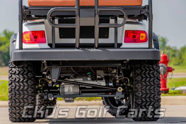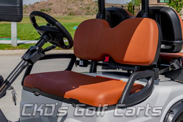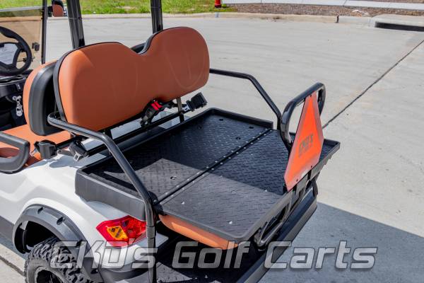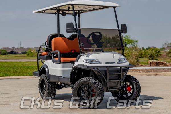 Brand New 2021 Glacier White with Saddle Brown seats Advanced EV 2+2 four-passenger lifted golf cart and neighborhood cruiser. 48 volt AC drive with new US Batteries, Toyota 350 amp AC controller and 4kW 5.5 hp motor, onboard charging system, powder-coated frame and chassis, 4-wheel disc brakes, independent front suspension, coil spring over shock rear suspension, color-matched long top with grab handles, rear flip seat with grab bar and swinging cup holders, Ultimate Light Kit (includes headlights, taillights, brake lights, turn signals, emergency flashers, and a horn), digital speedometer, digital odometer, digital state of charge meter, side-mounted rearview mirrors, (6) retractable seat belts, 48 to 12-volt reducer, dual USB outlets, 14″ Matte Black Revenge wheels with 23×10-14 Sierra Classic tires, Memphis Audio Bluetooth system with 2 speakers, fender flares, brush guard bumper, tinted folding ‘magnetic latch’ windshield and SMV sign. This cart comes with a limited 2 year warranty!