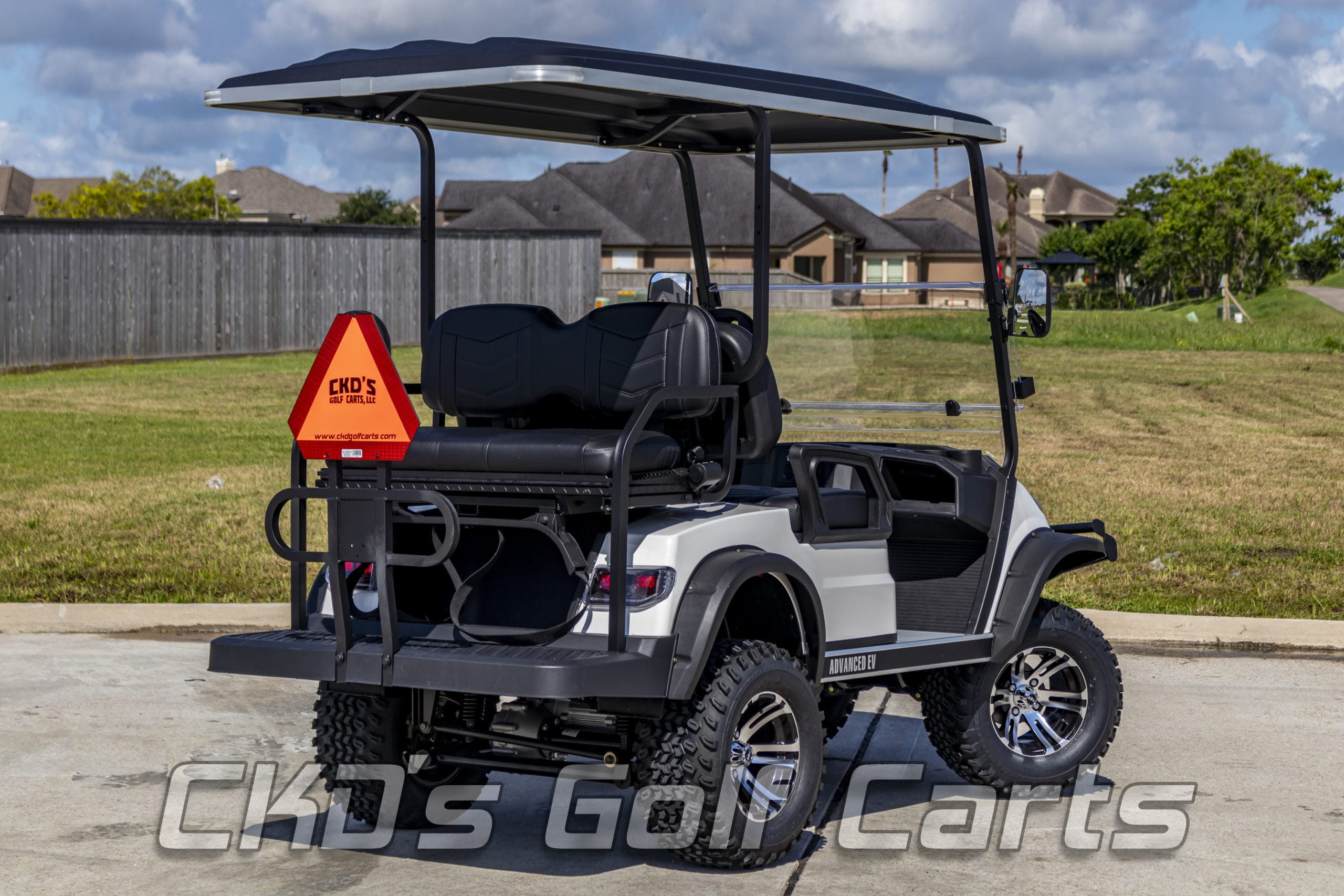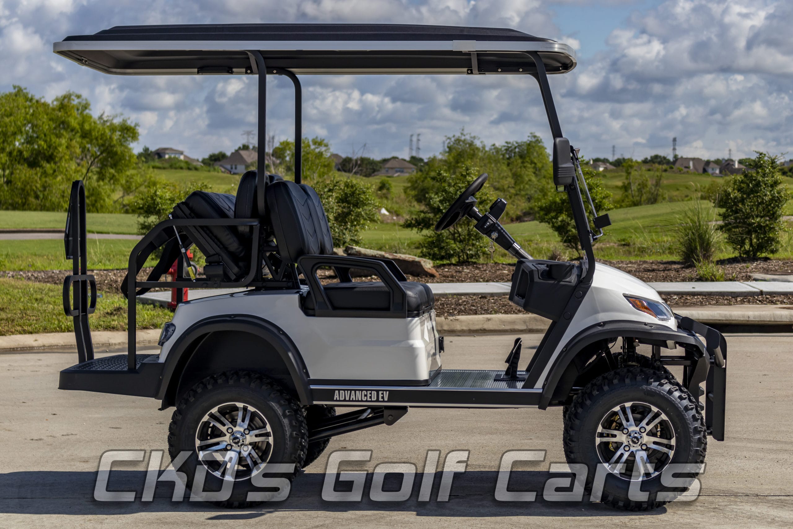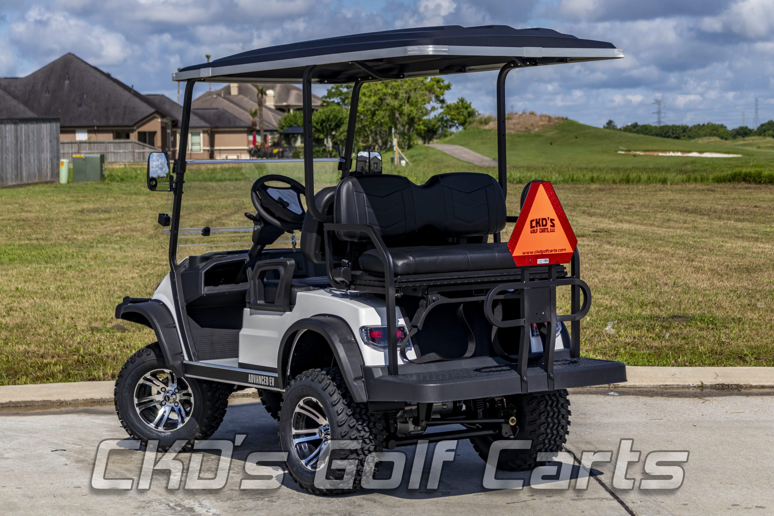 Brand New 2021 Glacier White Advanced EV Advent 2+2 four-passenger lifted Lithium Battery golf cart. 48 volt AC drive, new 105 Ah Lithium Battery. (There are many advantages to a lithium battery pack, several of which are: No maintenance required (no batteries to fill with water, no acid leaking onto the floor or smelling up the garage, extended run-time, super fast charge time (2 to 4 hours total), huge weight savings (almost 300 pounds!) and a 5-year battery pack warranty with an expected lifespan of 10 to 15 years!). 4-wheel disc brakes, independent front suspension, coil spring over shock rear suspension, rear flip seat, extended top with grab handles, digital instrumentation, retractable seat belts, side-mounted mirrors, 12-inch custom wheels with 23-inch tires, fender flares, brush guard bumper, on-board charger, custom black diamond-stitched seats, folding windshield, dual USB ports, Ultimate LED Light Kit (includes LED headlights, taillights, brake lights, emergency flashers, and horn) and more. Street legal in many communities!