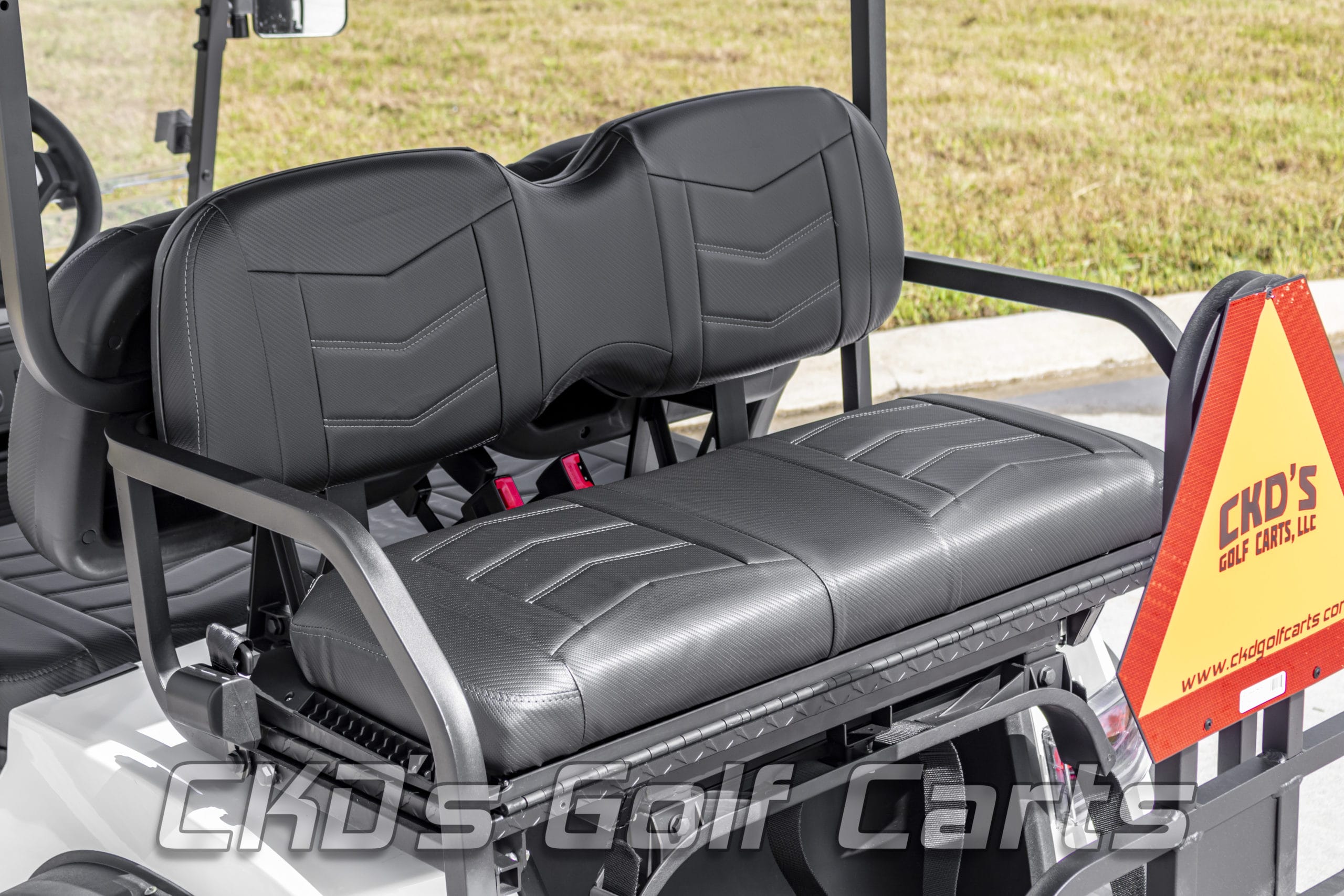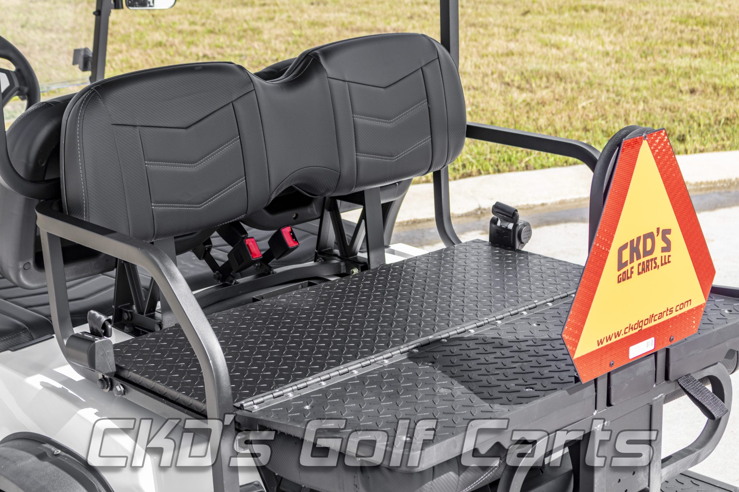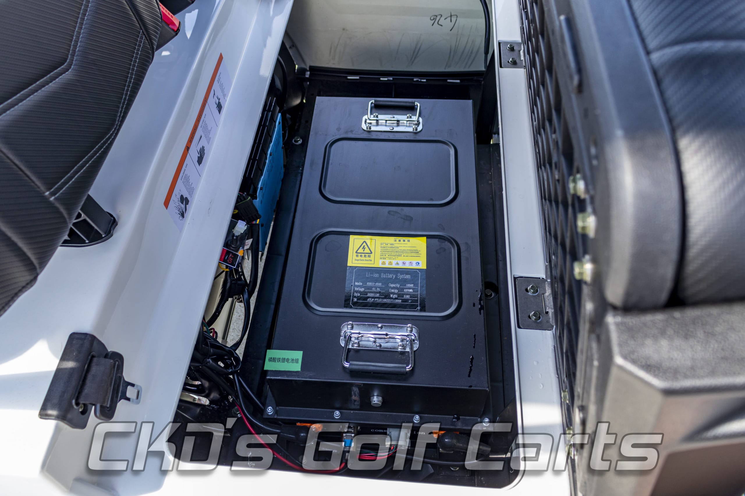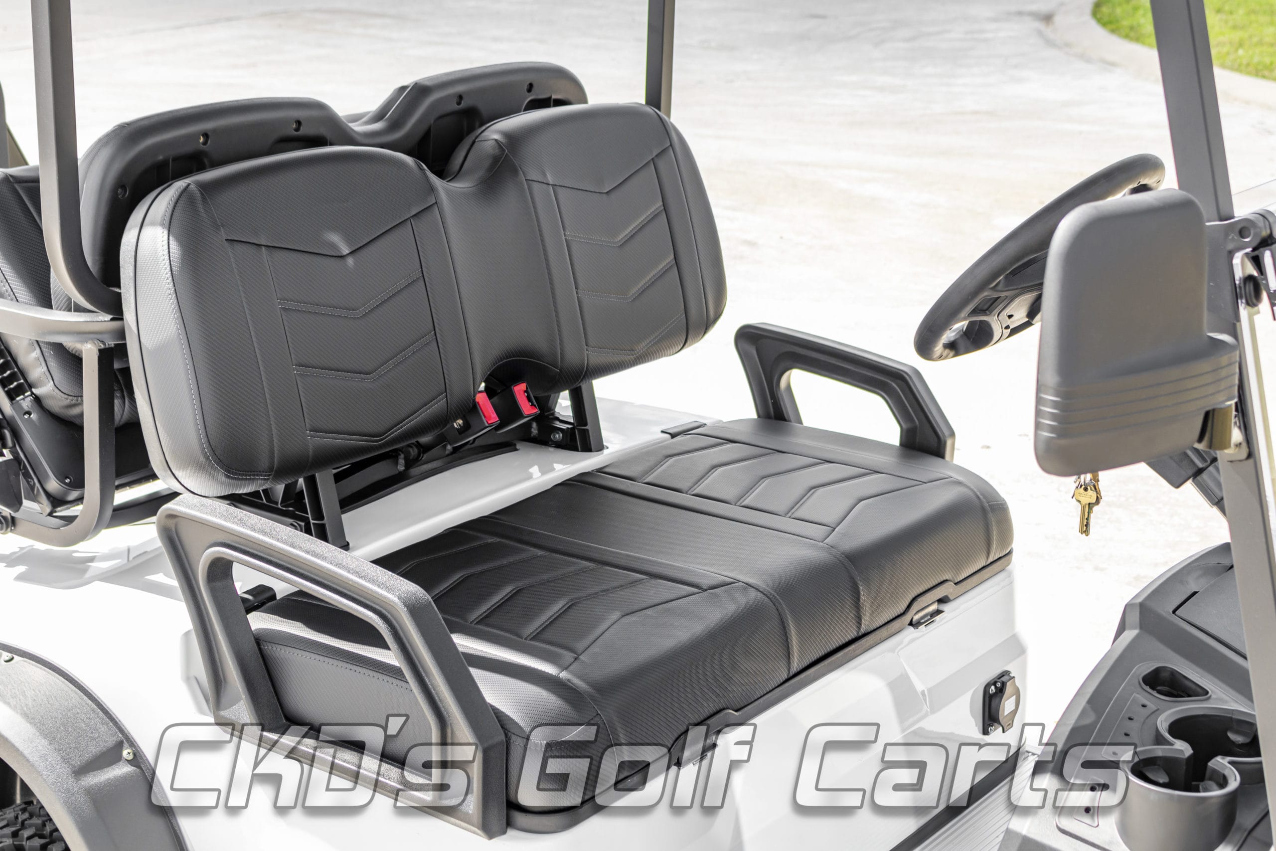Brand New 2021 Glacier White Advanced EV Advent 2+2 four-passenger lifted Lithium Battery golf cart. 48 volt AC drive, new 105 Ah Lithium Battery. (There are many advantages to a lithium battery pack, several of which are: No maintenance required (no batteries to fill with water, no acid leaking onto the floor or smelling up the garage, extended run-time, super fast charge time (2 to 4 hours total), huge weight savings (almost 300 pounds!) and a 5-year battery pack warranty with an expected lifespan of 10 to 15 years!). 4-wheel disc brakes, independent front suspension, coil spring over shock rear suspension, rear flip seat, extended top with grab handles, digital instrumentation, retractable seat belts, side-mounted mirrors, 12-inch custom wheels with 23-inch tires, fender flares, brush guard bumper, on-board charger, custom black diamond-stitched seats, folding windshield, dual USB ports, Ultimate LED Light Kit (includes LED headlights, taillights, brake lights, emergency flashers, and horn) and more. Street legal in many communities!