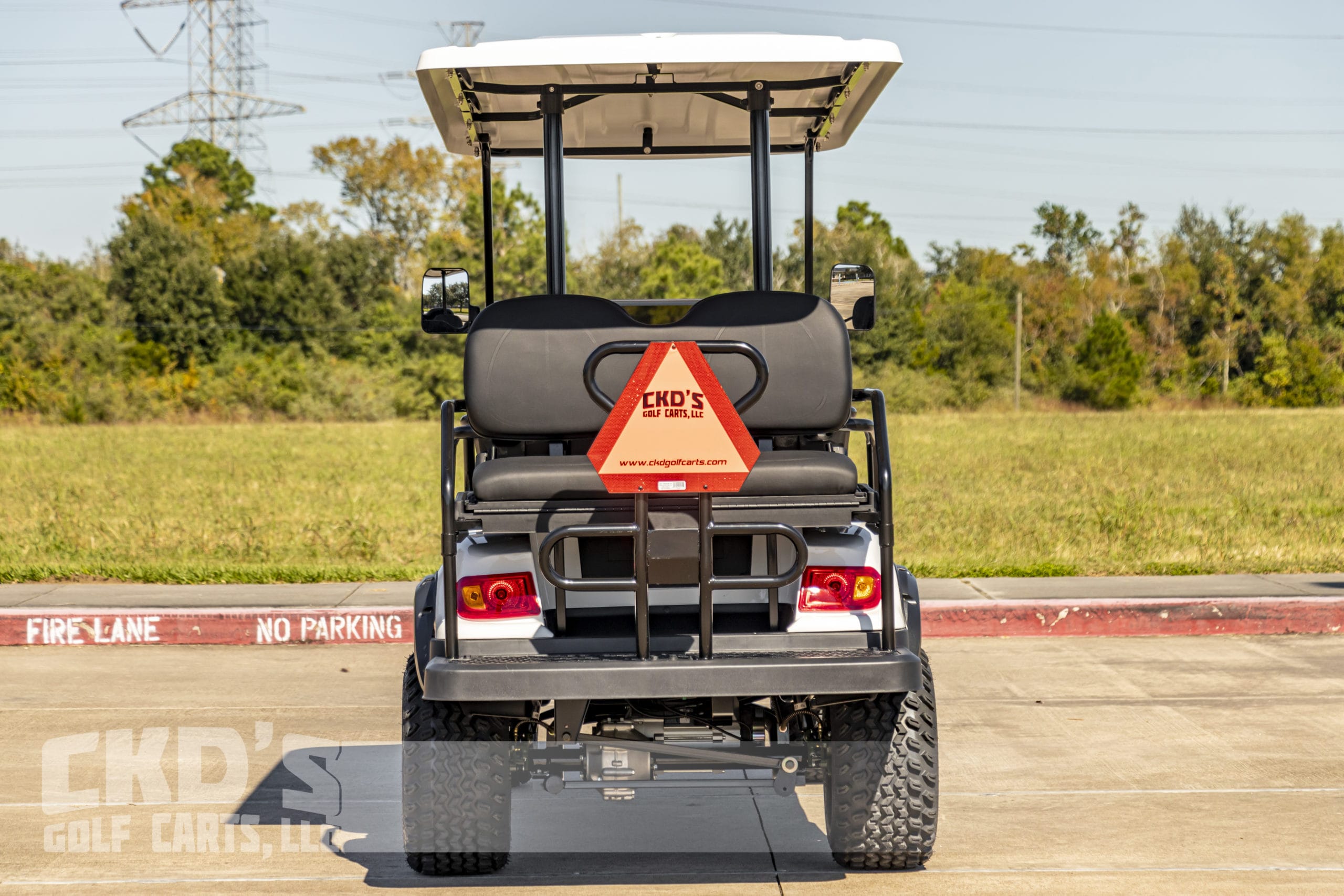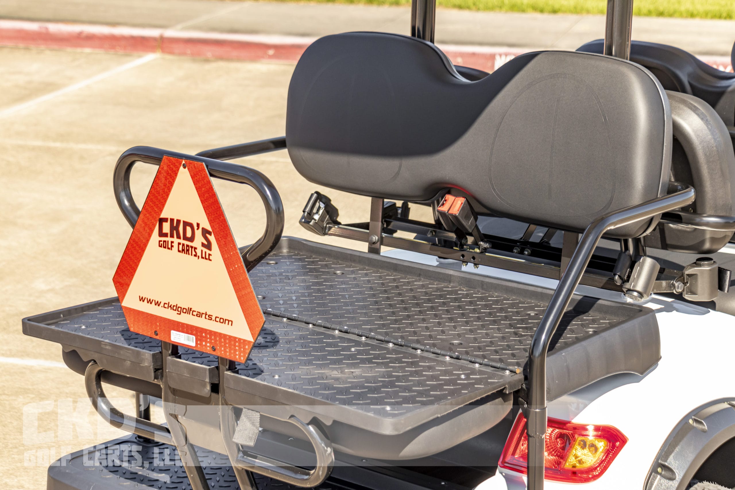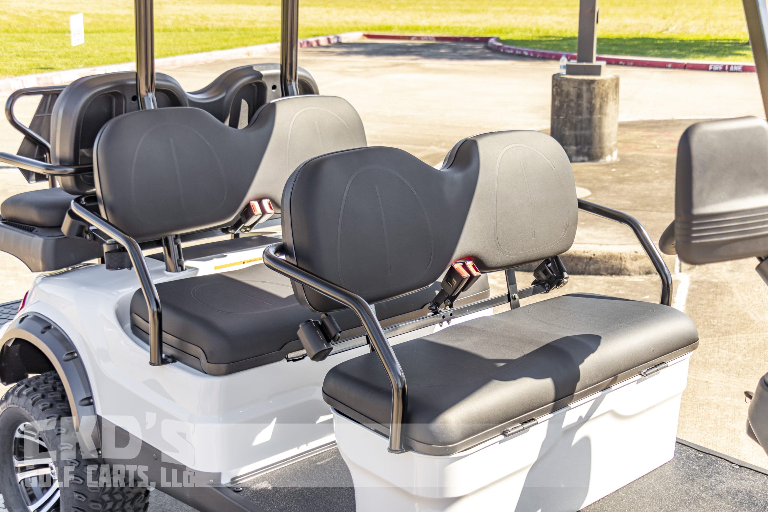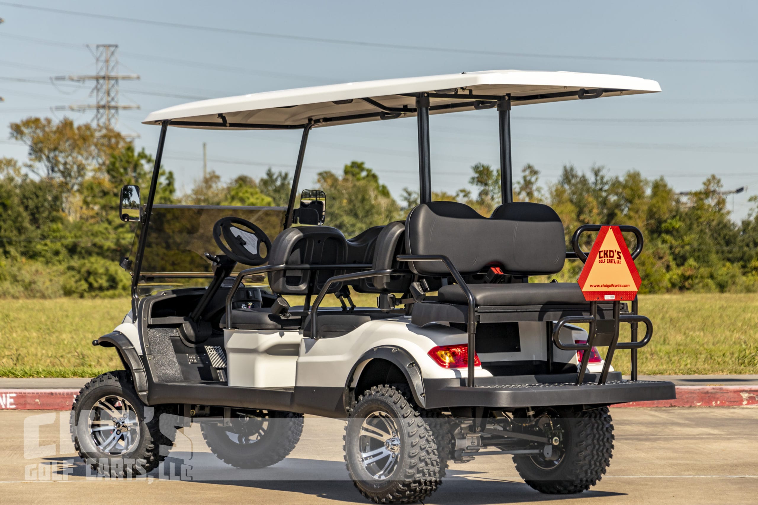 Brand new Glacier White with Black trim 2022 Advanced EV 4+2 six-passenger lifted golf cart and neighborhood cruiser. 48 volt AC drive with the new huge RoyPow 160Ah lithium battery pack, 350 amp AC controller, 4kW 5.5 hp motor, onboard charging system, powder-coated frame and chassis, 4-wheel disc brakes, independent front suspension, coil spring over shock rear suspension, color-matched long top with grab handles, rear flip seat with grab bar and swinging cup holders, Ultimate Light Kit (includes headlights, taillights, brake lights, turn signals, emergency flashers, and a horn), digital speedometer, digital odometer, digital state of charge meter, side-mounted rearview mirrors, (6) retractable seat belts, 48 to 12-volt reducer, dual USB outlets, 12″ black and machined wheels with 23-inch tires, fender flares, brush guard bumper, tinted folding ‘non-squeak’ windshield, and SMV sign. This cart comes with an industry-first limited 5-year warranty!