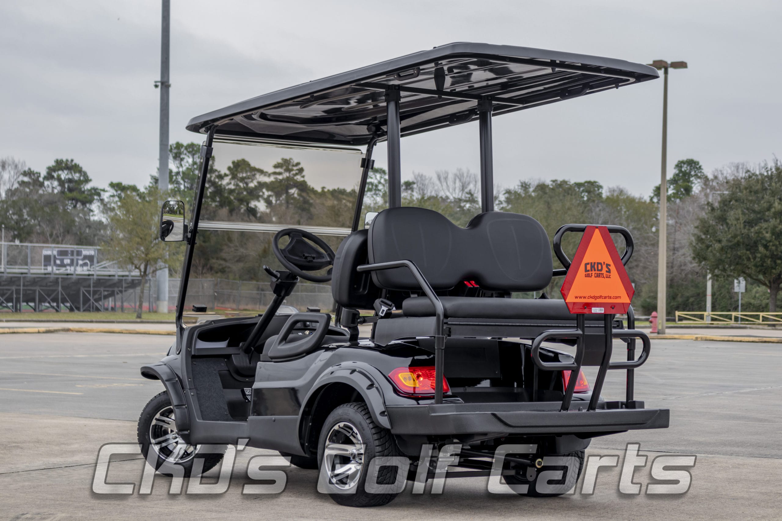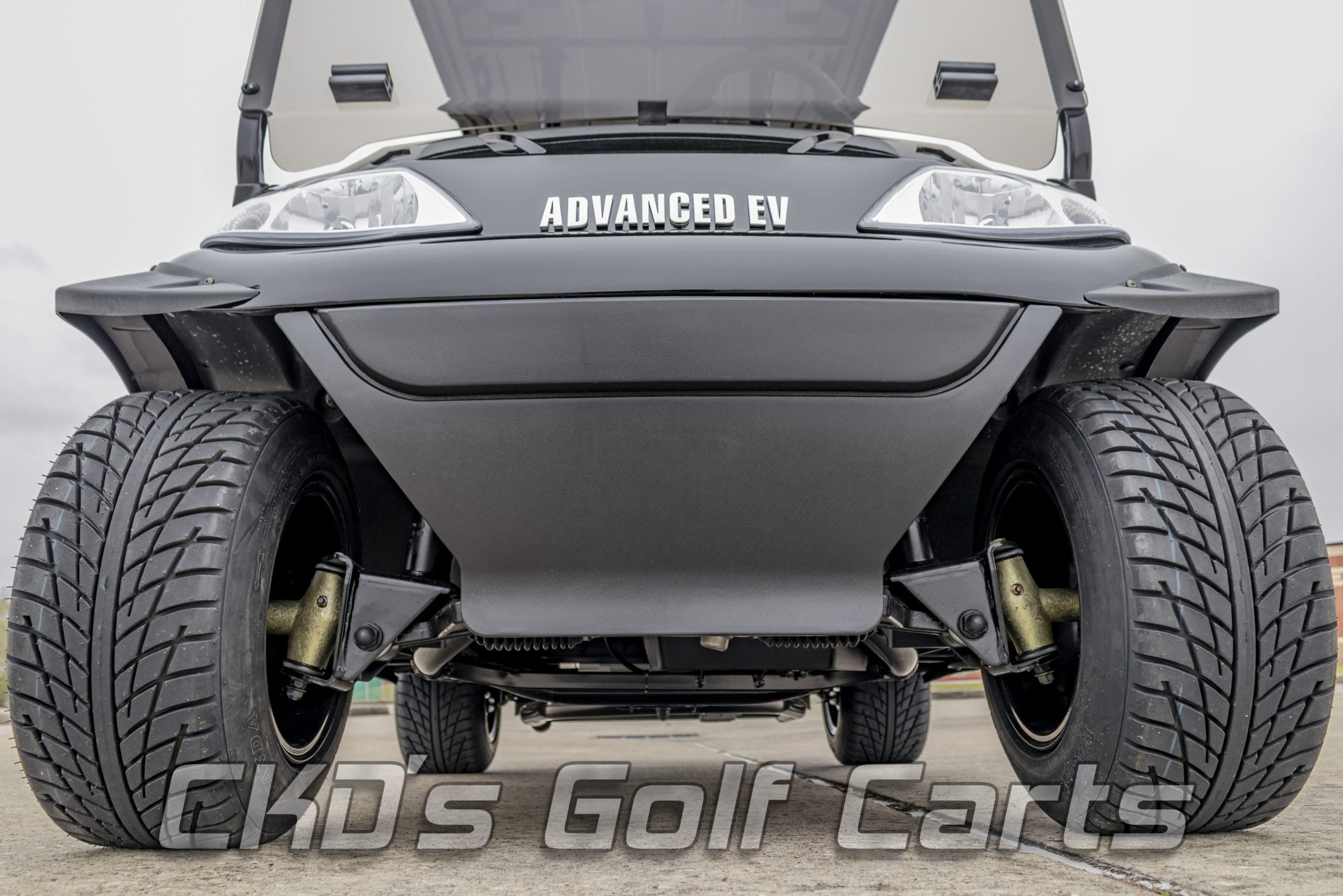 Brand new 2022 Advanced EV 2+2 four-passenger golf cart and neighborhood cruiser, in Black Metallic with Black seats. Non-lifted for easier entry! 48 volt AC drive with new US Batteries, 350 amp AC Toyota controller, 4kW 5.5 hp motor, onboard charging system, powder-coated frame and chassis, 4-wheel coil spring over shock suspension. Ultimate light kit (includes headlights, taillights, brake lights, turn signals and horn), side-mounted rearview mirrors, tinted folding windshield, color-matched long top (to cover all passengers) with built-in drainage system and grab handles, rear flip seat, retractable seat belts at all 4 seating positions, black OEM upholstery, 10″ Machined and Black wheels with 205/50-10 tires, analog speedometer, odometer, state of charge meter, 48 volts to 12-volt reducer for accessories, dual USB ports and SMV sign. The Advanced EV has an industry first 5-year manufacturer’s Limited Warranty!