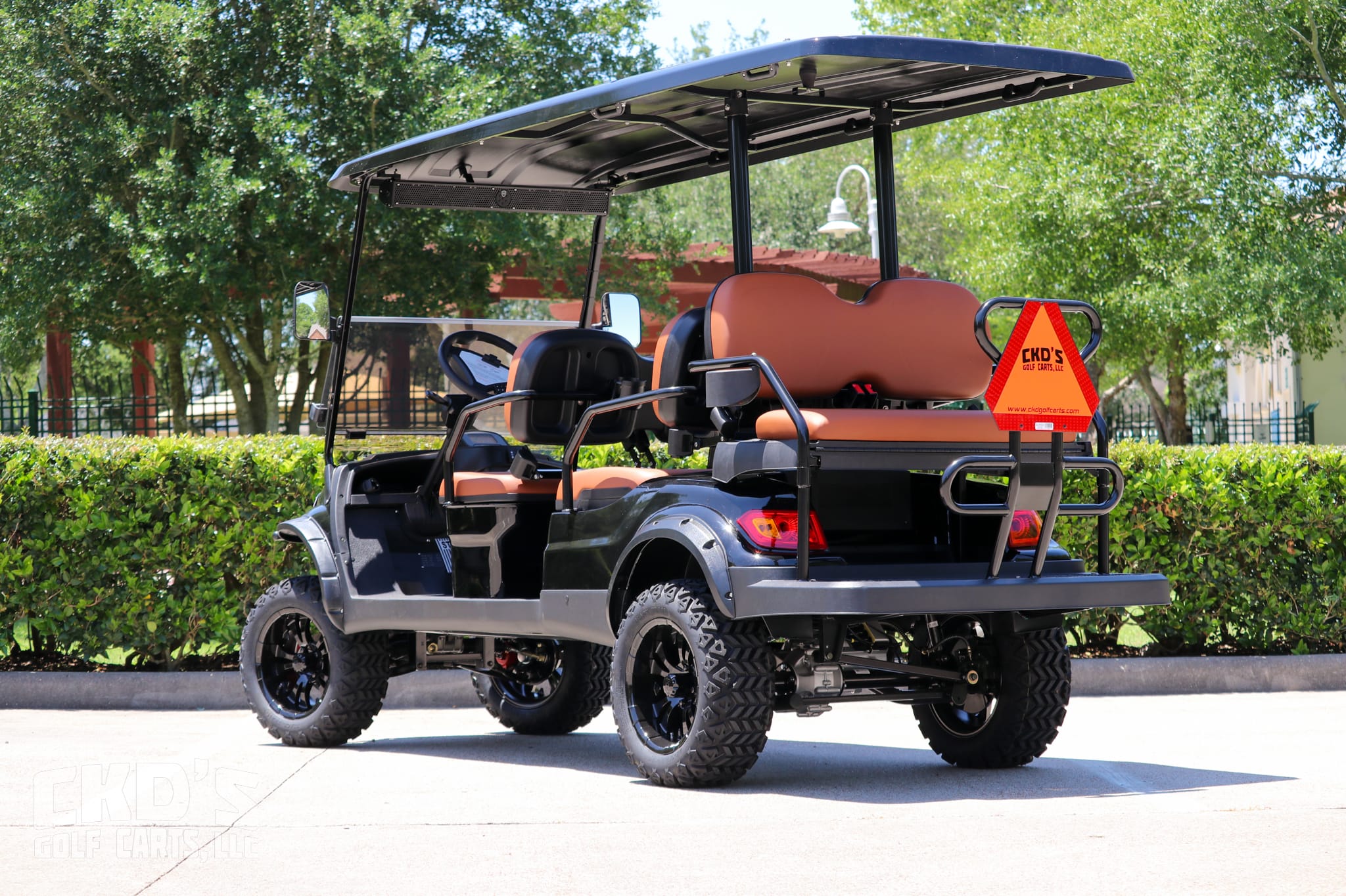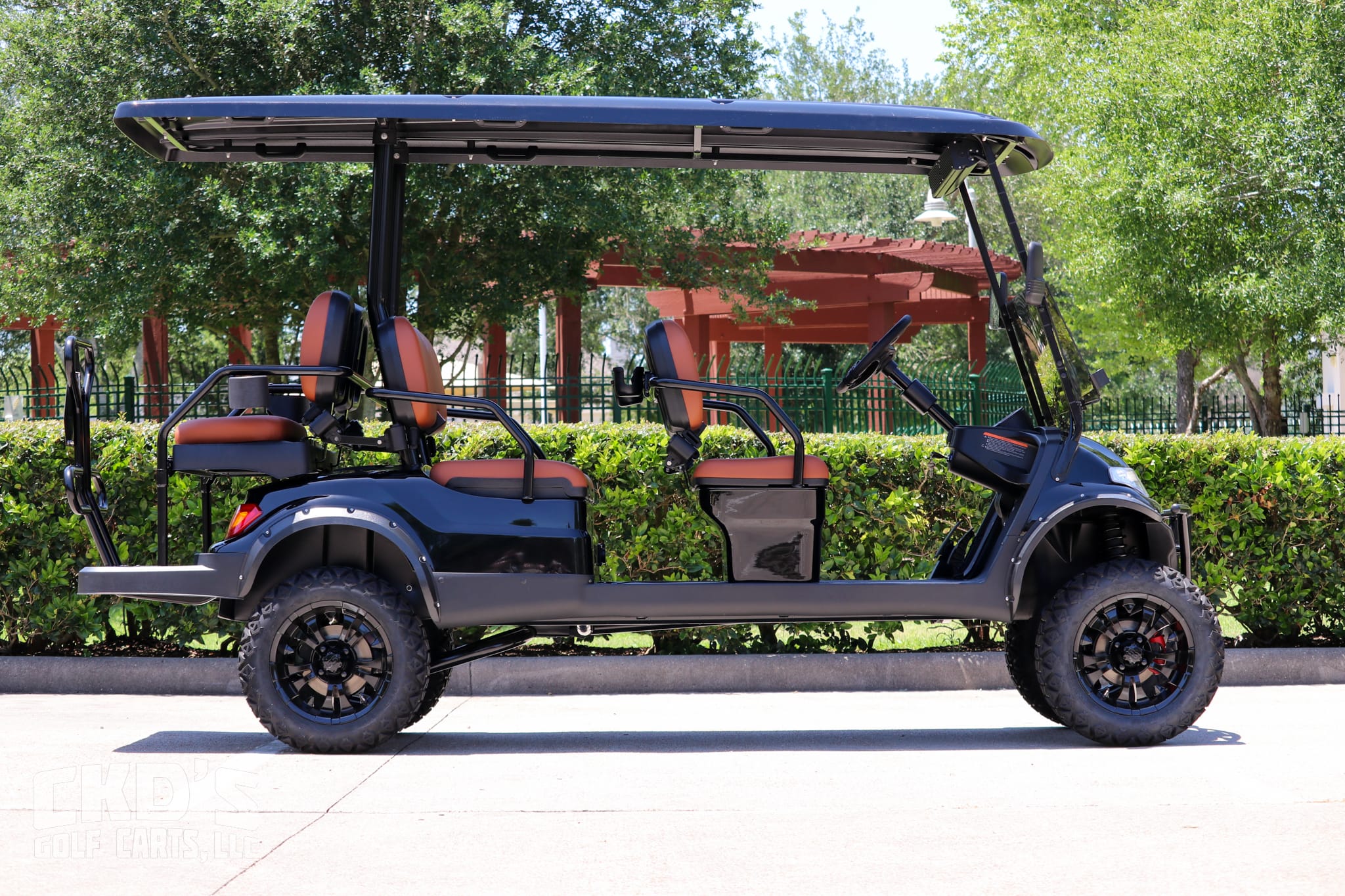 Brand new Jet Black with Brown trim 2022 Advanced EV 4+2 six-passenger lifted golf cart and neighborhood cruiser. 48 volt AC drive with the new Trojan T-875 Batteries battery pack, 350 amp AC controller, 4kW 5.5 hp motor, on-board charging system, powder coated frame and chassis, 4-wheel disc brakes, independent front suspension, coil spring over shock rear suspension, color-matched long top with grab handles, rear flip seat with grab bar and swivel cup holders, Ultimate Light Kit (includes headlights, taillights, brake lights, turn signals and a horn), digital speedometer, digital odometer, digital state of charge meter, side-mounted rear view mirrors, (6) retractable seat belts, second row cup holders, 48 to 12 volt reducer, dual USB outlet, 14″ Gloss Black Vampire (newest style) wheels with 23″ Black Trail tires, fender flares, brush guard bumper, tinted folding ‘non-squeak’ windshield, Wetsounds Stealth 10 Ultra Bluetooth Soundbar (this soundbar cranks!) and SMV sign. This cart comes with an industry first limited 5 year warranty!