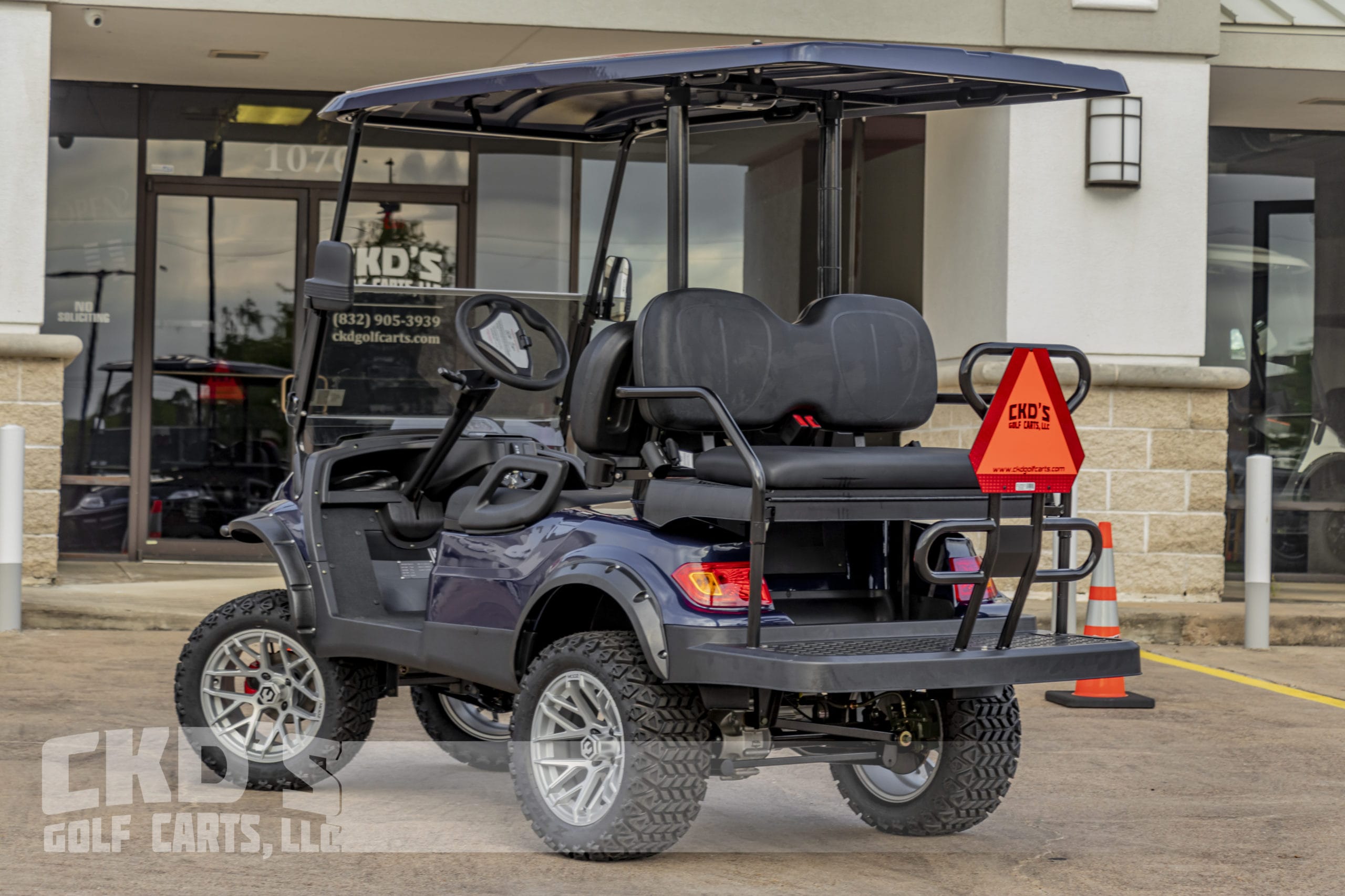 Brand new 2022 Metallic Blue Advanced EV 2+2 four-passenger lifted golf cart and neighborhood cruiser. 48 volt AC drive with new US 8 Volt Battery pack, 350 amp AC controller and 4kW 5.5 HP motor, onboard charging system, powder-coated frame and chassis, 4-wheel disc brakes, independent front suspension, coil spring over shock rear suspension, color-matched long top with grab handles, rear flip seat with grab bar (can add swivel cup holders), Ultimate Light Kit (includes headlights, taillights, brake lights, turn signals and a horn), digital speedometer, digital odometer, digital state of charge meter, side-mounted rearview mirrors, (4) retractable seat belts, 48 to 12-volt reducer, dual USB outlets, Memphis Bluetooth Soundbar, 14″ Silver MODZ Matrix Wheels with 23″ Arisun All-Terrain Tires, black OEM upholstery, fender flares, brush guard bumper, tinted folding ‘non-squeak’ windshield and SMV sign. This cart comes with an industry first limited 5-year limited warranty!