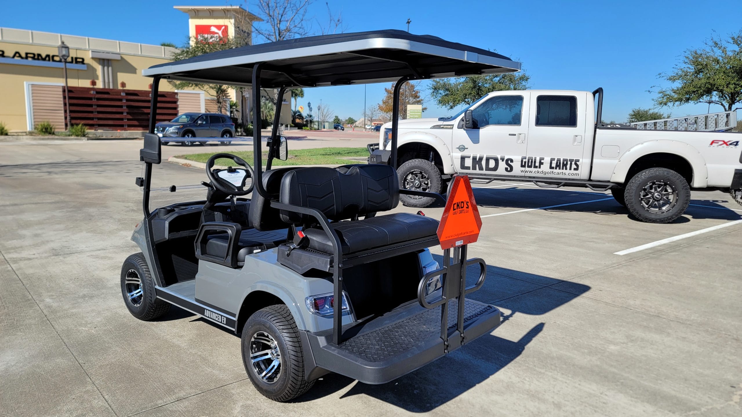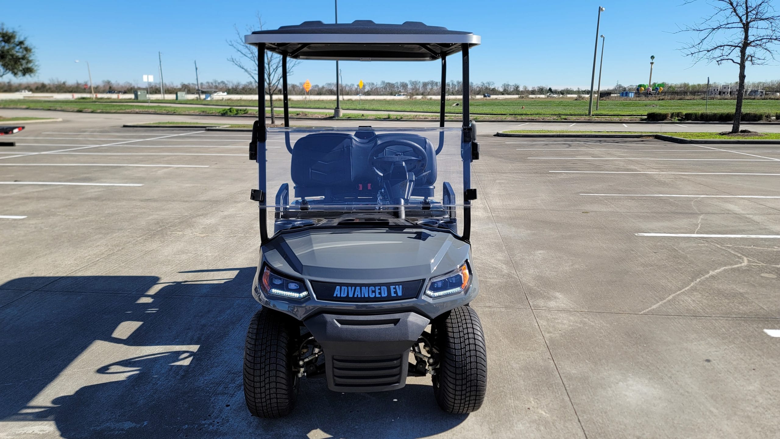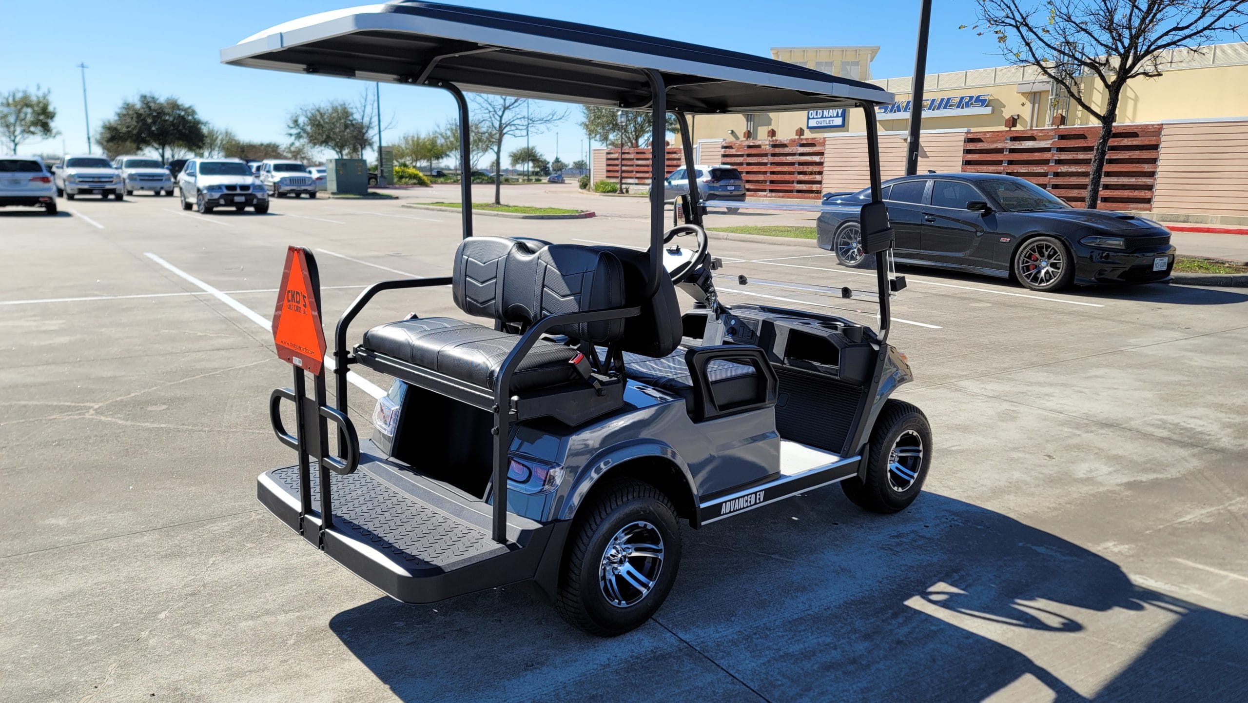Brand New Destroyer Grey Metallic with custom black Chevron stitched seats 2022 Advanced EV 2+2 four-passenger golf cart and neighborhood cruiser. 48 volt AC drive with new US Batteries, Toyota 350 amp AC controller & 4kW 5.5 hp motor, onboard charging system, powder-coated frame and chassis, 4-wheel coil spring over shock suspension, black long top with grab handles, rear flip seat with safety/grab bar and can add swivel cup holders. Ultimate Light Kit (includes LED headlights, LED taillights, LED brake lights, LED turn signals, emergency flashers and a horn), digital speedometer, digital odometer, digital state of charge meter, dual USB outlets, side-mounted rearview mirrors, (4) retractable seat belts, 48 to 12-volt reducer, custom 10″ black and machined wheels with 205/50-10 tires, front bumper, folding windshield and SMV sign. This cart comes with an industry first limited 5-year warranty!