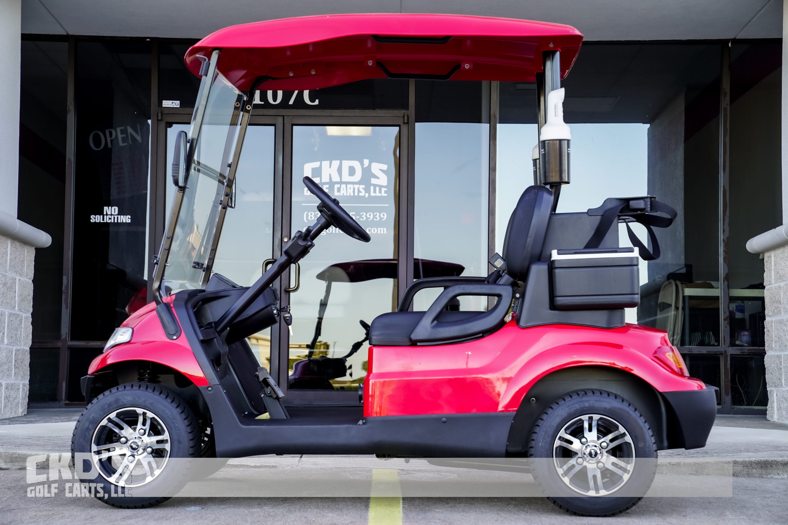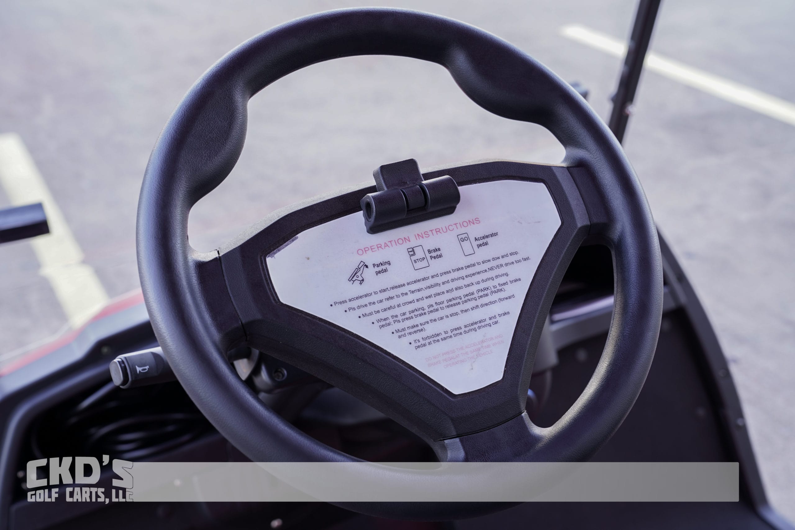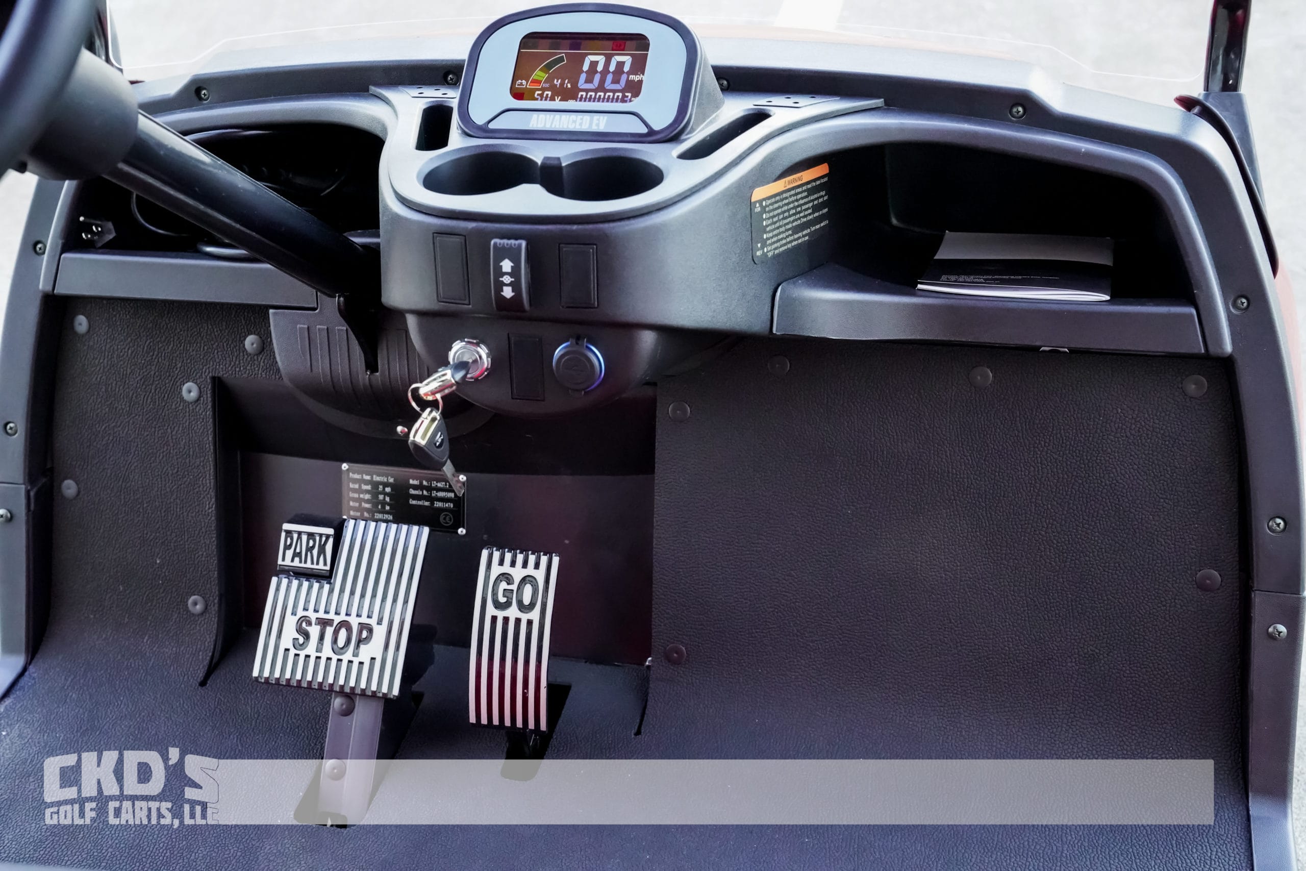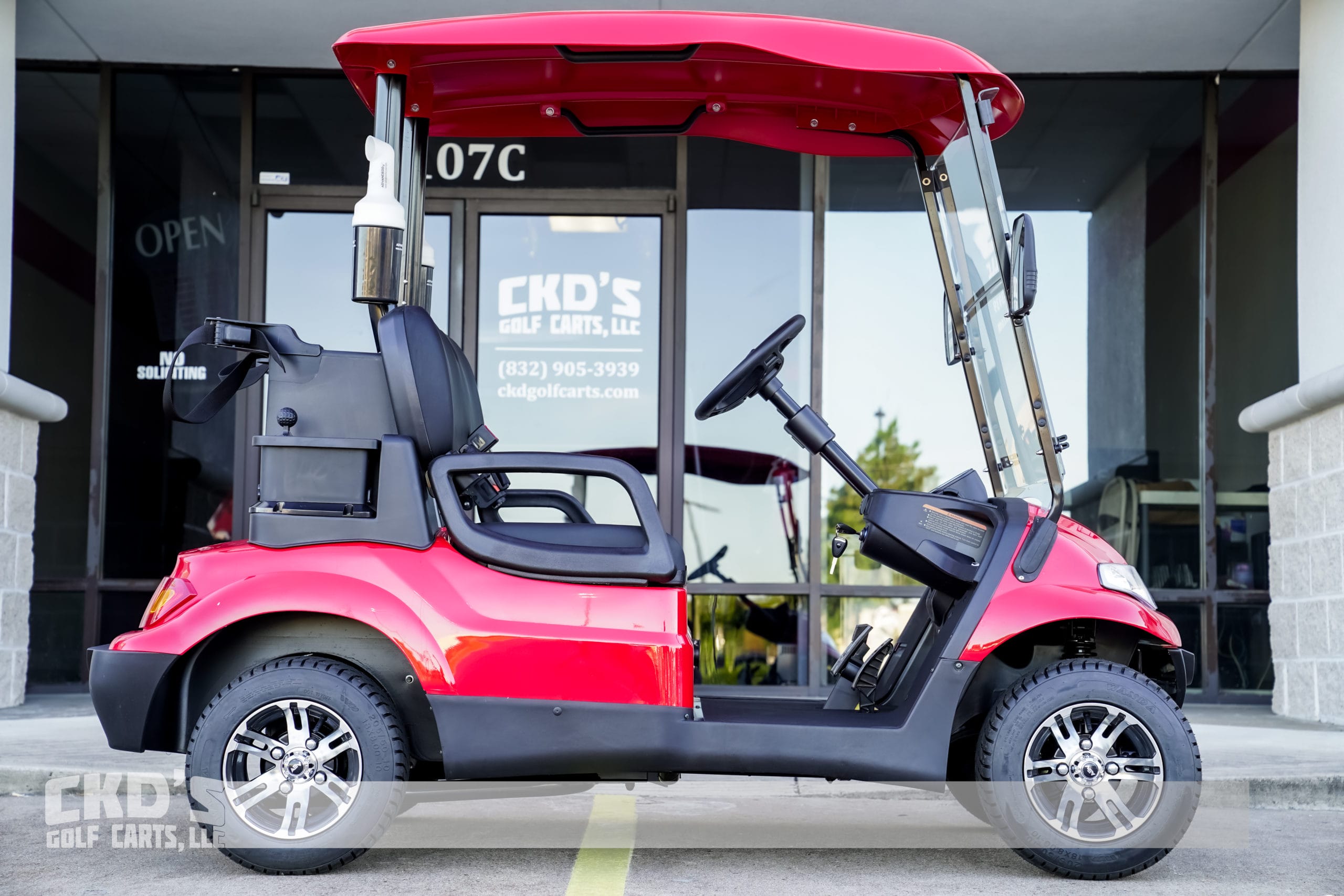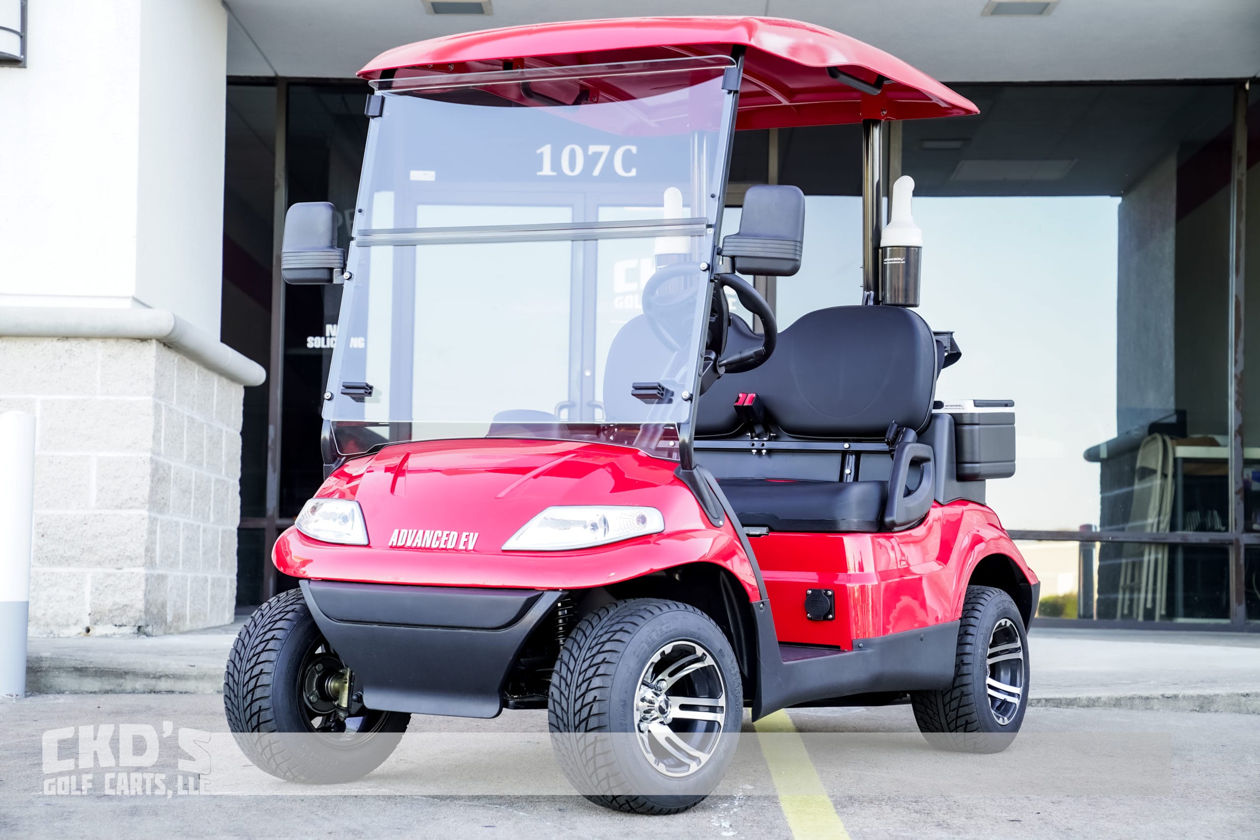 Brand new 2022 Advanced EV 2-passenger golf cart and neighborhood cruiser in Ferrari Red with Black seats. Non-lifted for easier entry! 48 volt AC drive with new 51V, New Trojan 8 Volt Battery Pack, 350 amp AC controller, 4kW 5.5 hp motor, onboard charging system, powder-coated frame and chassis, 4-wheel coil spring over shock suspension. Ultimate light kit (includes headlights, taillights, brake lights, turn signals and a horn), side-mounted rearview mirrors, tinted folding windshield, Red top with built-in drainage system, retractable seat belts, black OEM upholstery, 10″ Black and Machined wheels with 205/50-10 tires, digital speedometer, odometer, state of charge meter, 48 volt to 12-volt reducer for accessories, dual USB ports, golf bag holders, (2) Sand Bottles, 6 Pack Cooler and SMV sign. This Advanced EV has an industry first 5-year manufacturer’s Limited Warranty!