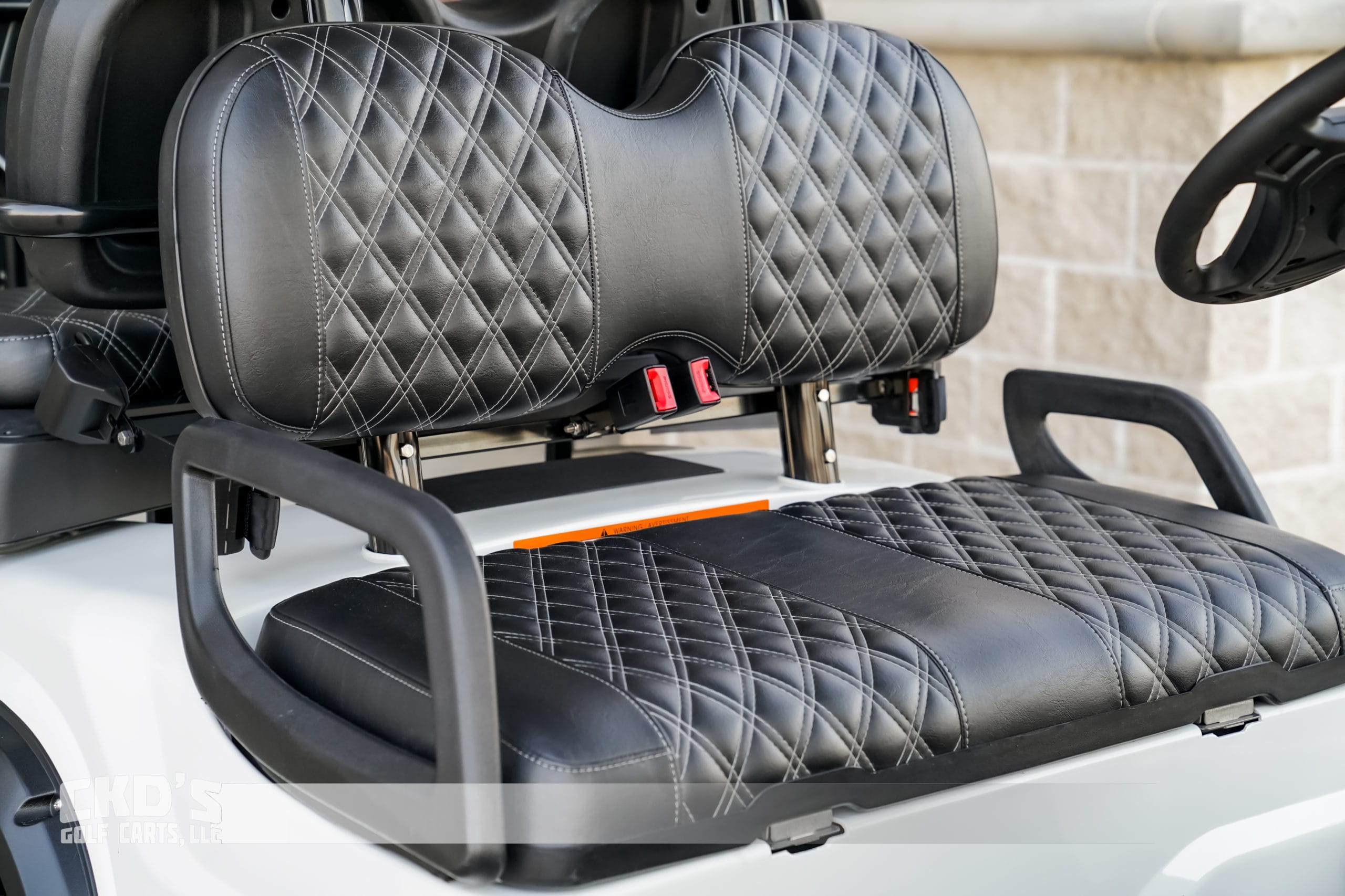 Brand new 2022 Glacier White Advanced EV 2+2 four-passenger lifted golf cart and neighborhood cruiser. 48 volt AC drive with new Trojan 8 Volt Battery pack, 350 amp AC controller and 4kW 5.5 HP motor, onboard charging system, powder-coated frame and chassis, 4-wheel disc brakes, independent front suspension, coil spring over shock rear suspension, color-matched long top with grab handles, rear flip seat with grab bar (can add swivel cup holders), Ultimate Light Kit (includes headlights, taillights, brake lights, turn signals and a horn), digital speedometer, digital odometer, digital state of charge meter, side-mounted rearview mirrors, (4) retractable seat belts, 48 to 12-volt reducer, dual USB outlets, Custom 14″ Black and Silver GTW Omega Wheels with 23″ Predator All-Terrain Tires, black and silver custom double diamond hand stitched upholstery, fender flares, brush guard bumper, tinted folding ‘non-squeak’ windshield and SMV sign. This cart comes with an industry first limited 5-year limited warranty!