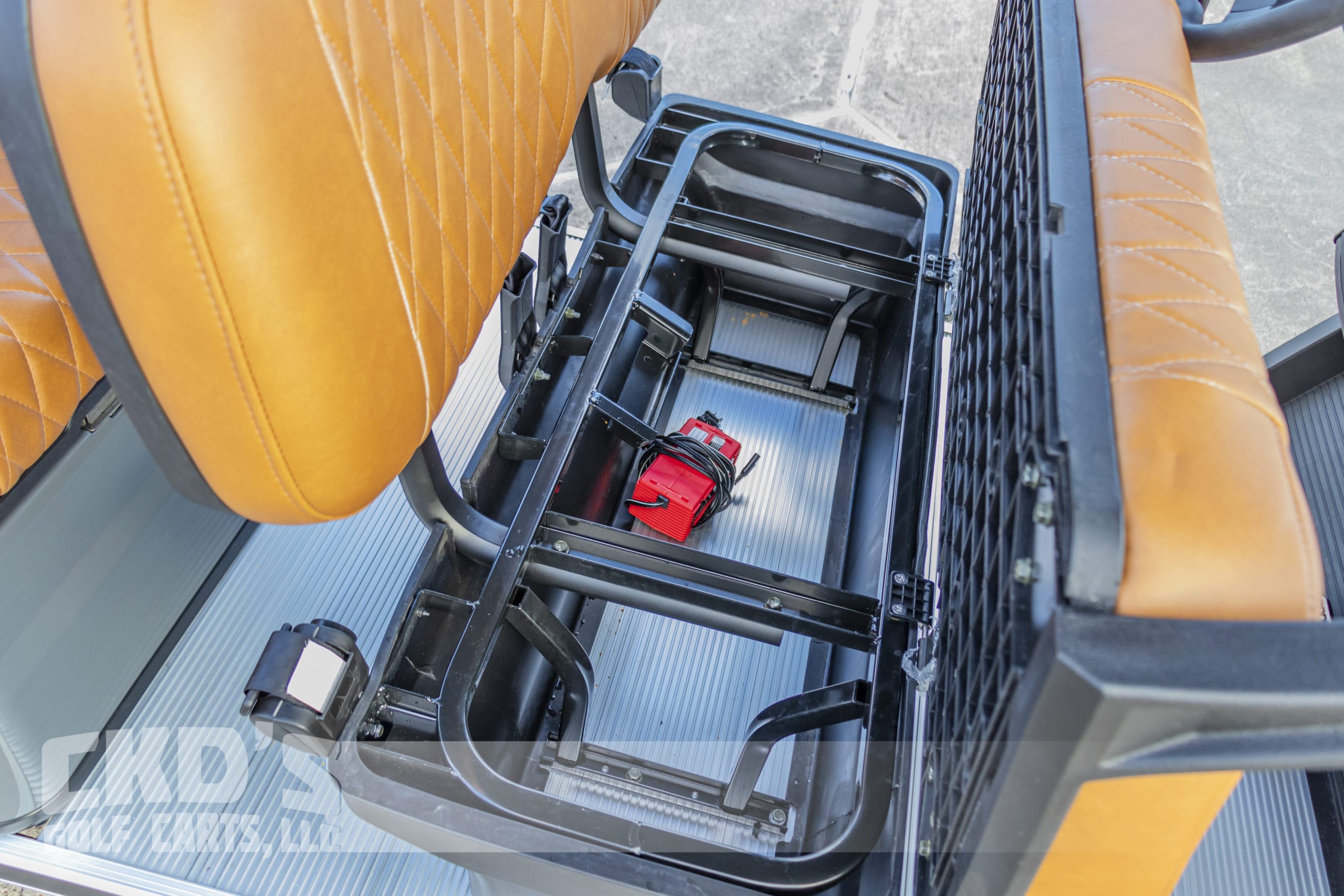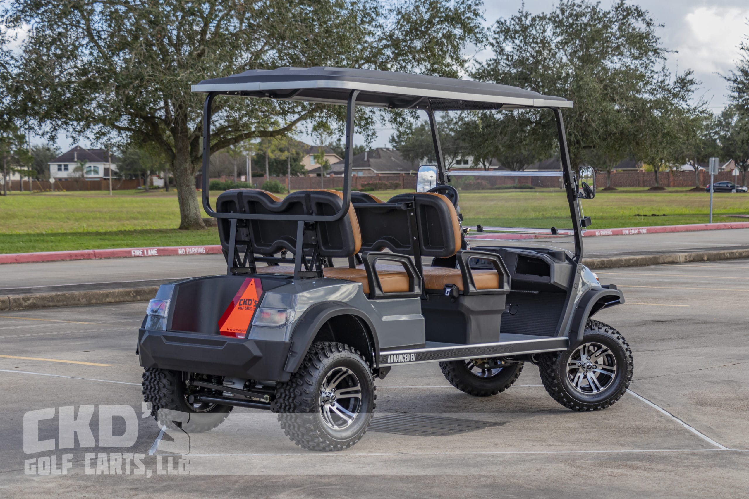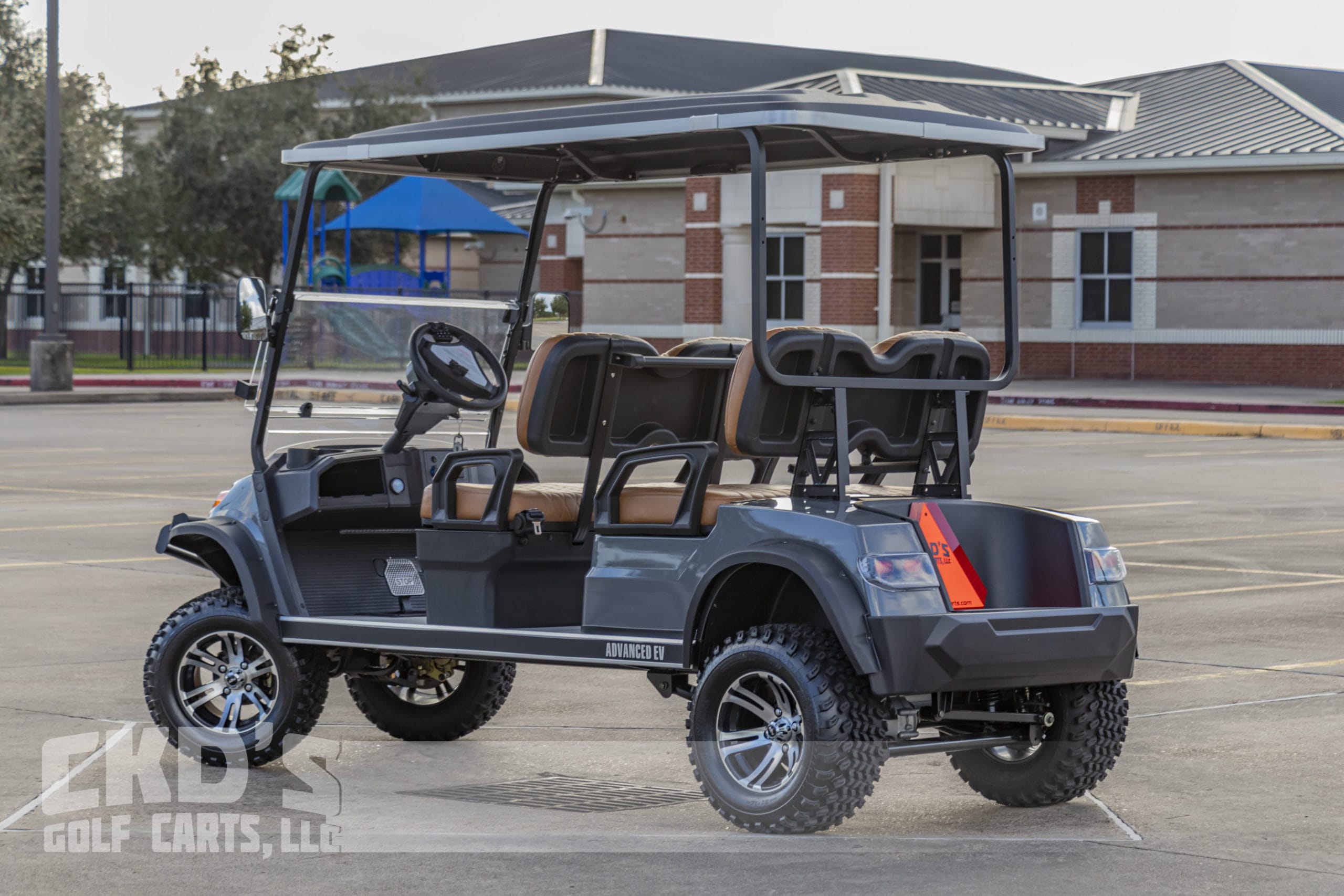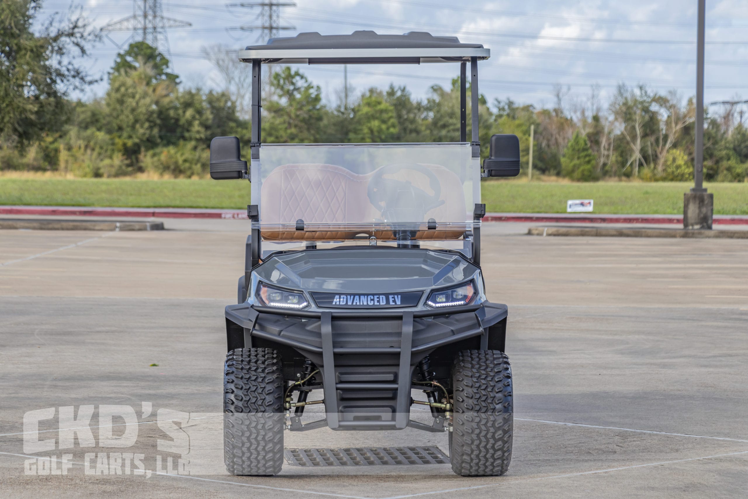 Selling on consignment a like New 2022 Destroyer Grey Metallic with custom saddle brown Chevron stitched seats 2022 Advanced EV 2+2 four-passenger golf cart and neighborhood cruiser. 48 volt AC drive with 110Ah Lithium Battery pack, Toyota 350 amp AC controller & 4kW 5.5 hp motor, onboard charging system, powder-coated frame and chassis, 4-wheel coil spring over shock suspension, black long top with grab handles, Ultimate Light Kit (includes LED headlights, LED taillights, LED brake lights, LED turn signals, emergency flashers, and a horn), digital speedometer, digital odometer, digital state of charge meter, dual USB outlets, side-mounted rearview mirrors, (4) retractable seat belts, 48 to 12-volt reducer, custom 12″ black and machined wheels with 23×10.5-12 tires, front bumper brush guard, Wetsounds Stealth 10 Bluetooth soundbar, auxiliary battery system for the 12-volt accessories, Plashlights RGB underbody LED lights, folding windshield and SMV sign. This cart comes with an industry-first limited 5-year transferable warranty!