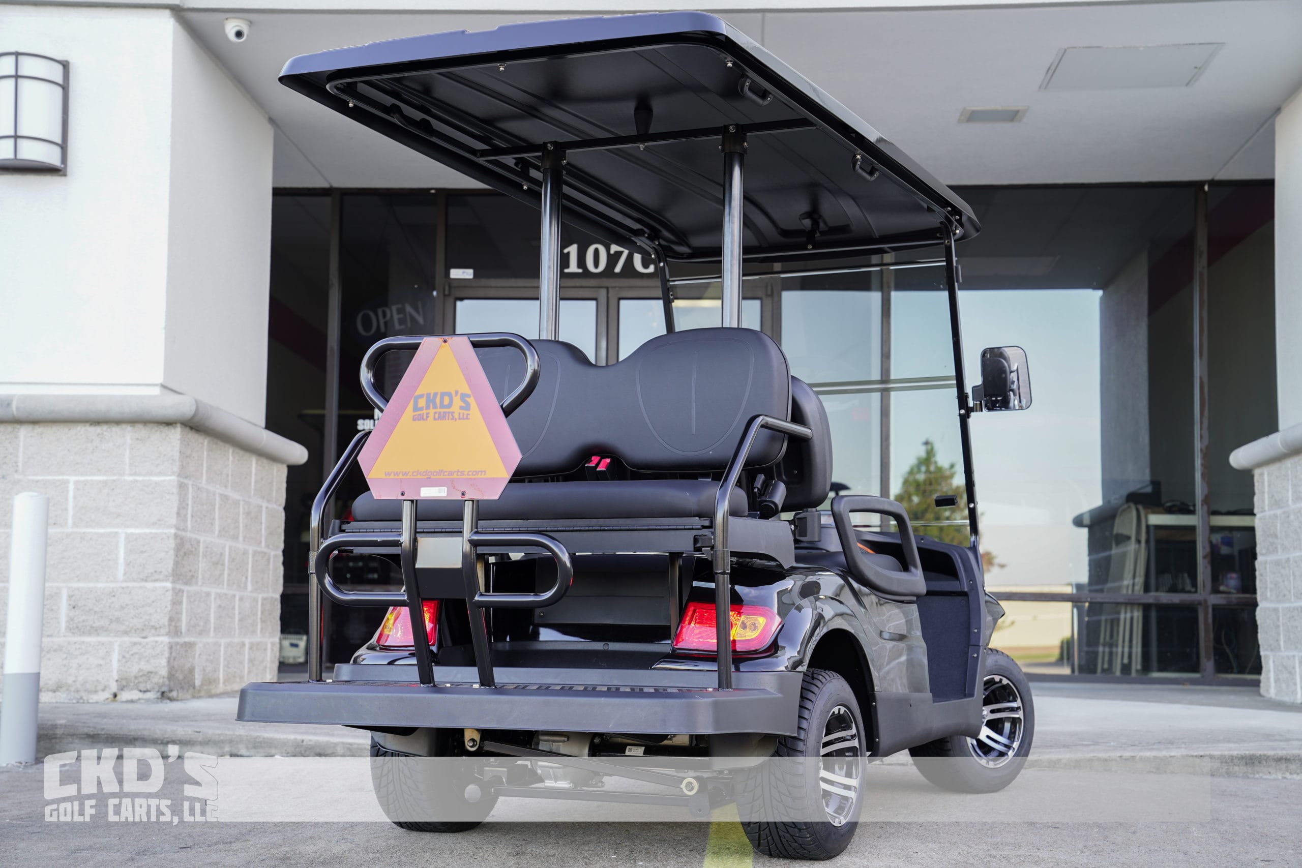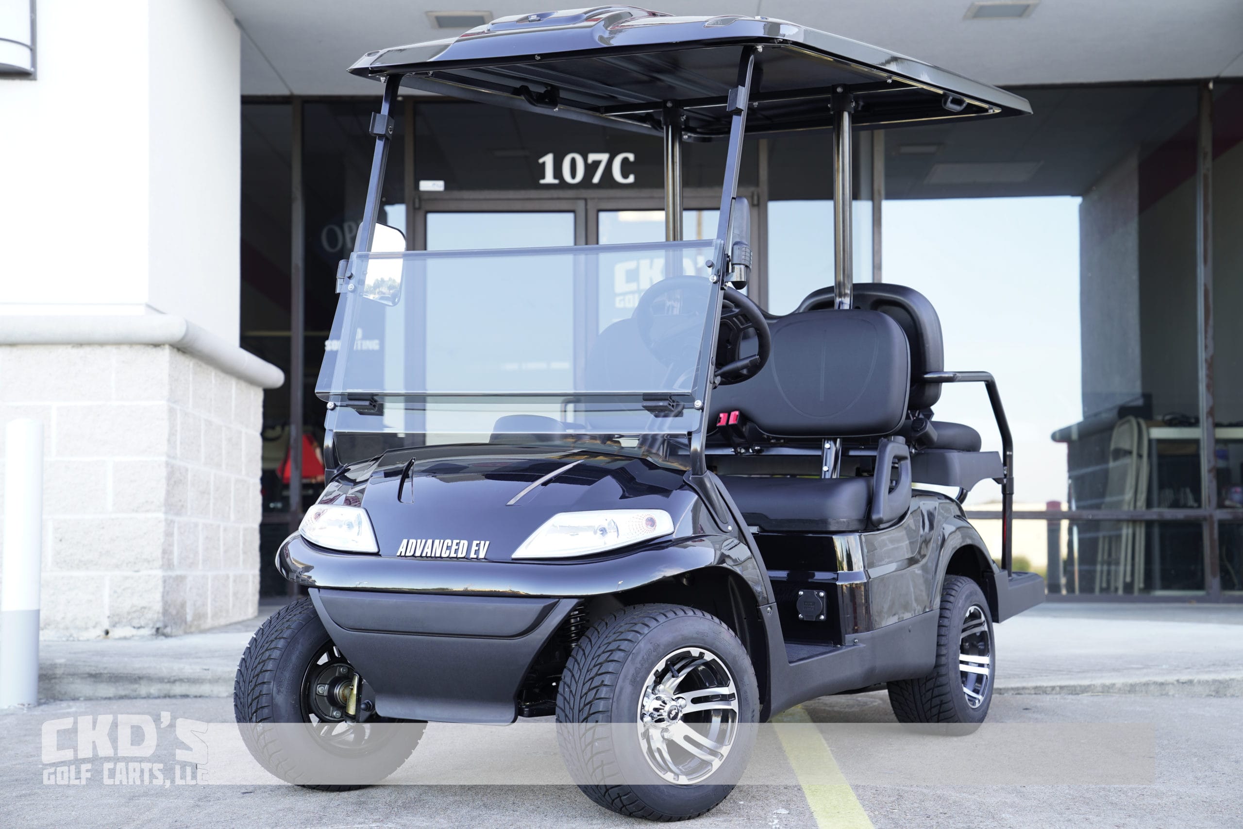 Brand new 2022 Advanced EV 2+2 four-passenger golf cart and neighborhood cruiser, in Black Metallic with Black seats. Non-lifted for easier entry! 48 volt AC drive with new Trojan 8 volt Batteries, 350 amp AC controller, 4kW 5.5 hp motor, onboard charging system, powder-coated frame and chassis, 4-wheel coil spring over shock suspension. Ultimate light kit (includes headlights, taillights, brake lights, turn signals and horn), side-mounted rearview mirrors, tinted folding windshield, color-matched long top (to cover all passengers) with built-in drainage system and grab handles, rear flip seat, retractable seat belts at all 4 seating positions, black OEM upholstery, 10″ Machined and Black wheels with 205/50-10 tires, analog speedometer, odometer, state of charge meter, 48 volts to 12-volt reducer for accessories, dual USB ports and SMV sign. The Advanced EV has an industry first 5-year manufacturer’s Limited Warranty!