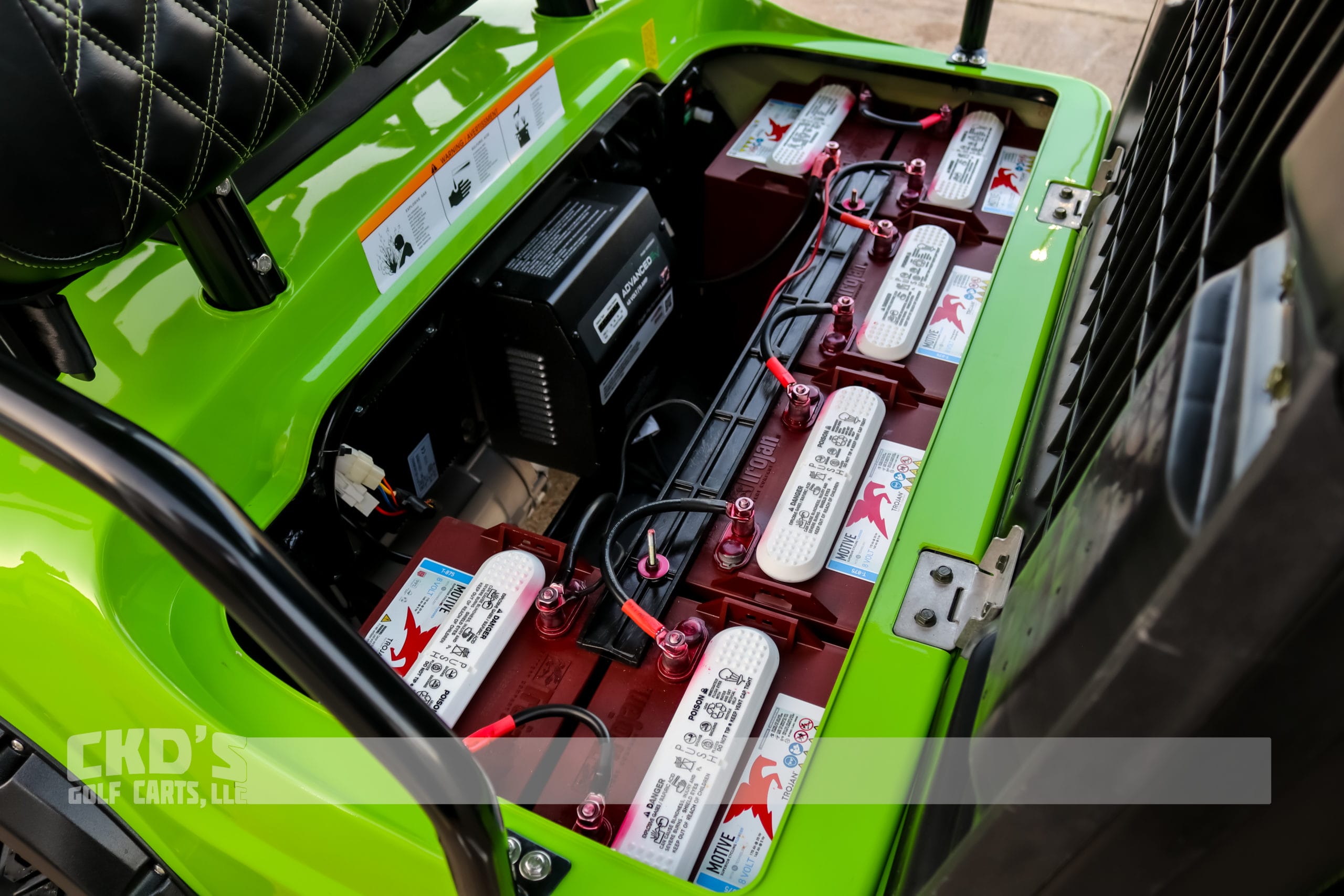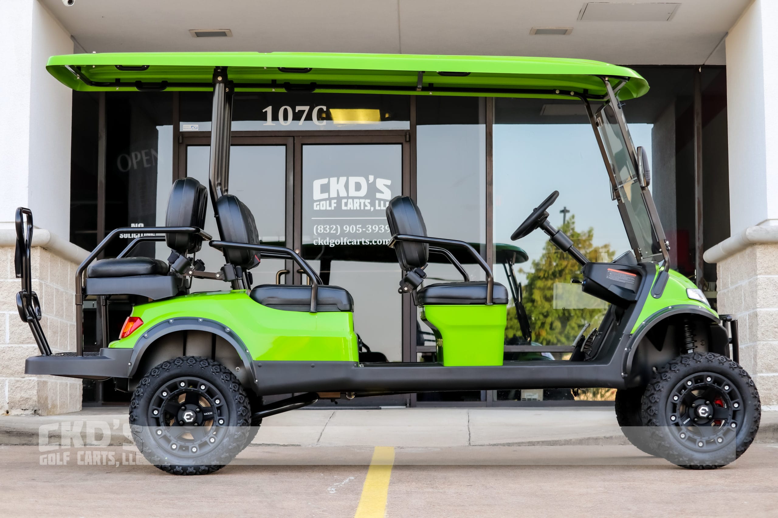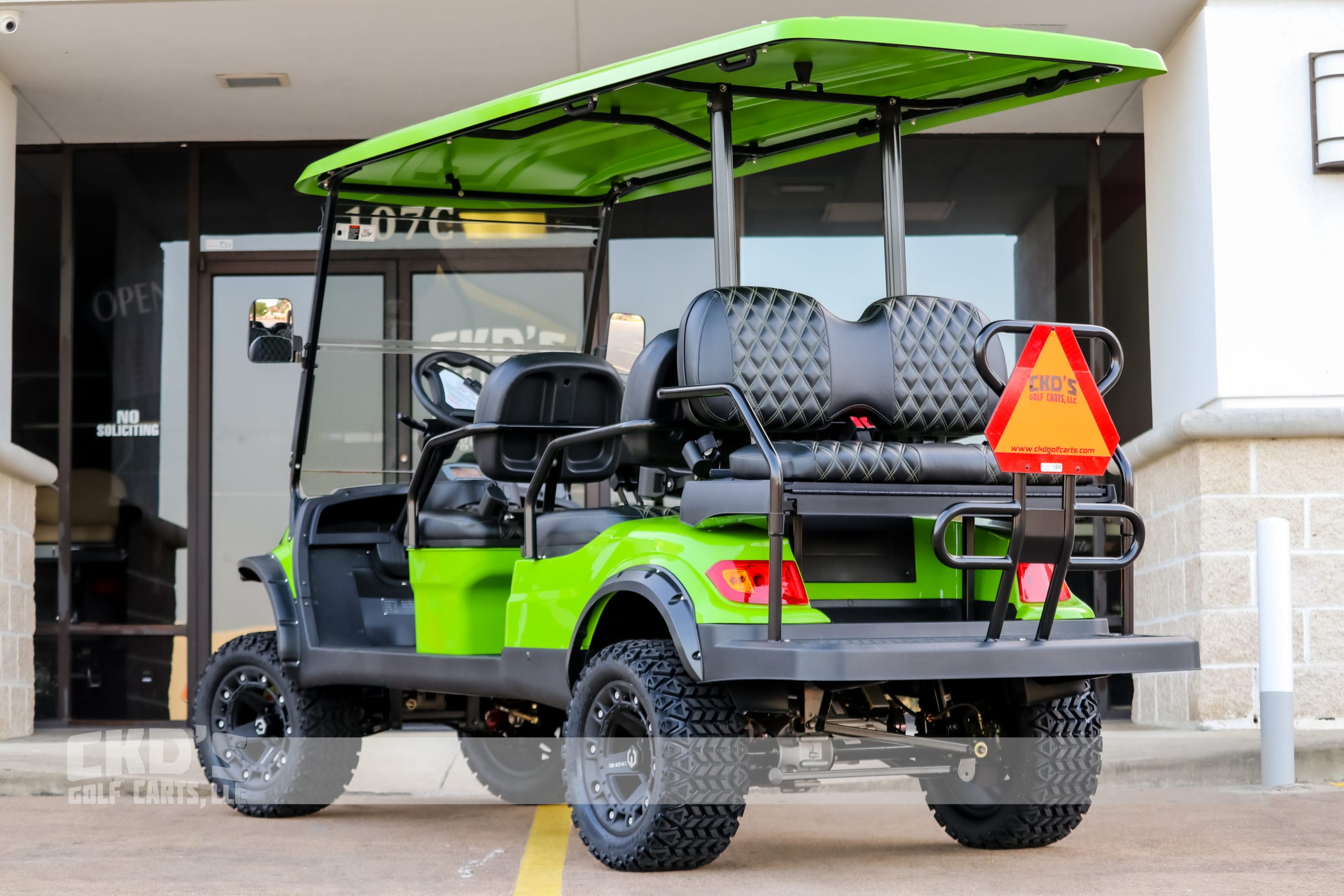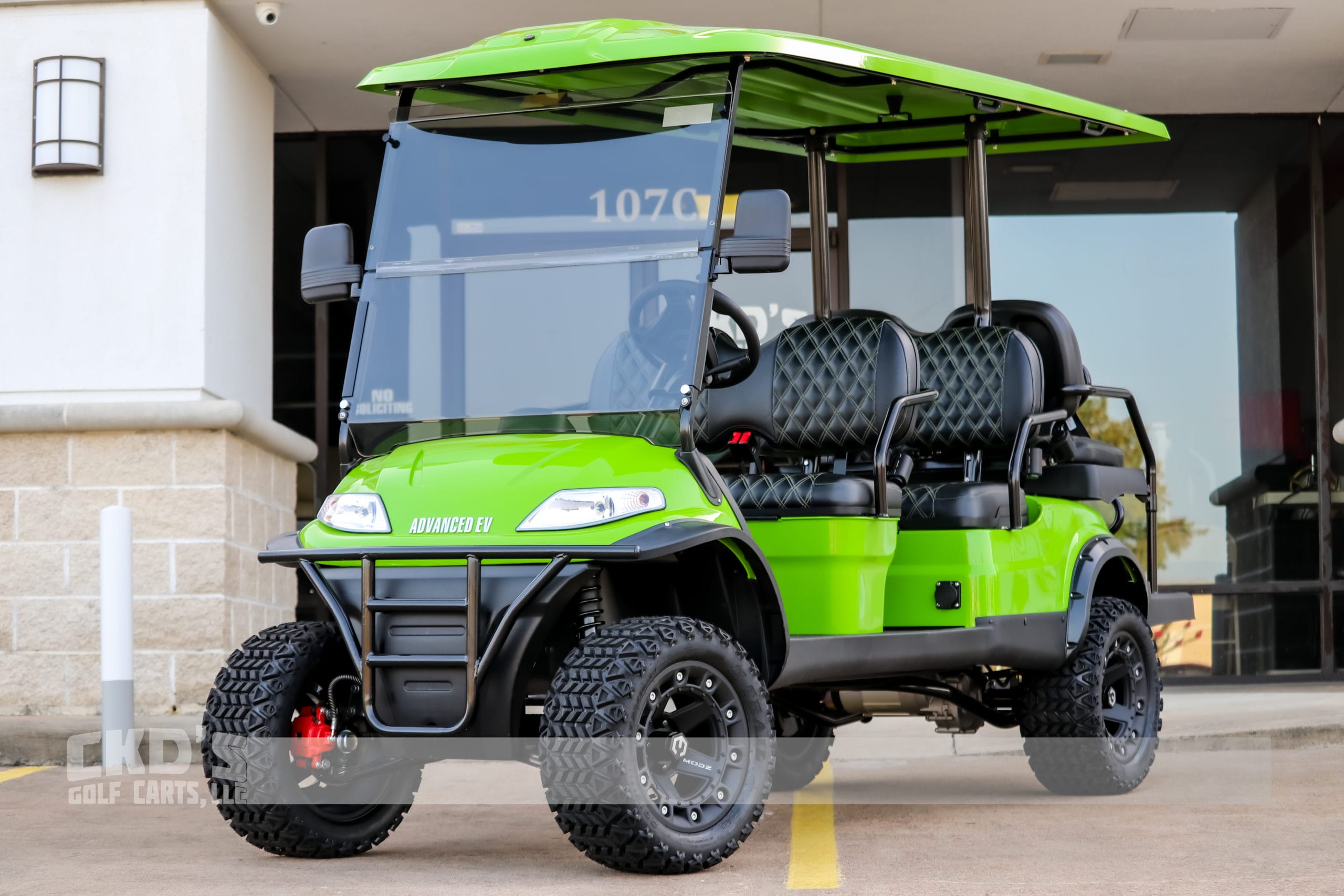 Brand new Lime Green with Black trim 2022 Advanced EV 4+2 six-passenger lifted golf cart and neighborhood cruiser. 48 volt AC drive with the new Trojan Batteries battery pack, 350 amp AC controller, 4kW 5.5 hp motor, on-board charging system, powder coated frame and chassis, 4-wheel disc brakes, independent front suspension, coil spring over shock rear suspension, color-matched long top with grab handles, rear flip seat with grab bar and can add swivel cup holders, Ultimate Light Kit (includes headlights, taillights, brake lights, turn signals and a horn), digital speedometer, digital odometer, digital state of charge meter, side-mounted rear view mirrors, (6) retractable seat belts, Custom black and Lime Green double diamond hand stitched upholstery, 48 to 12 volt reducer, dual USB outlets, Custom 14″ Matte Black MODZ Defender (newest style) wheels with 23″ All-Terrain tires, fender flares, brush guard bumper, tinted folding ‘non-squeak’ windshield and SMV sign. This cart comes with an industry first limited 5 year warranty!
