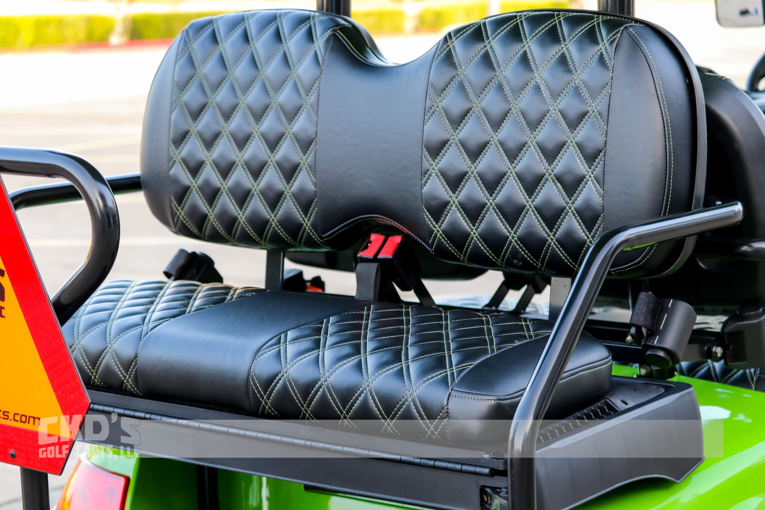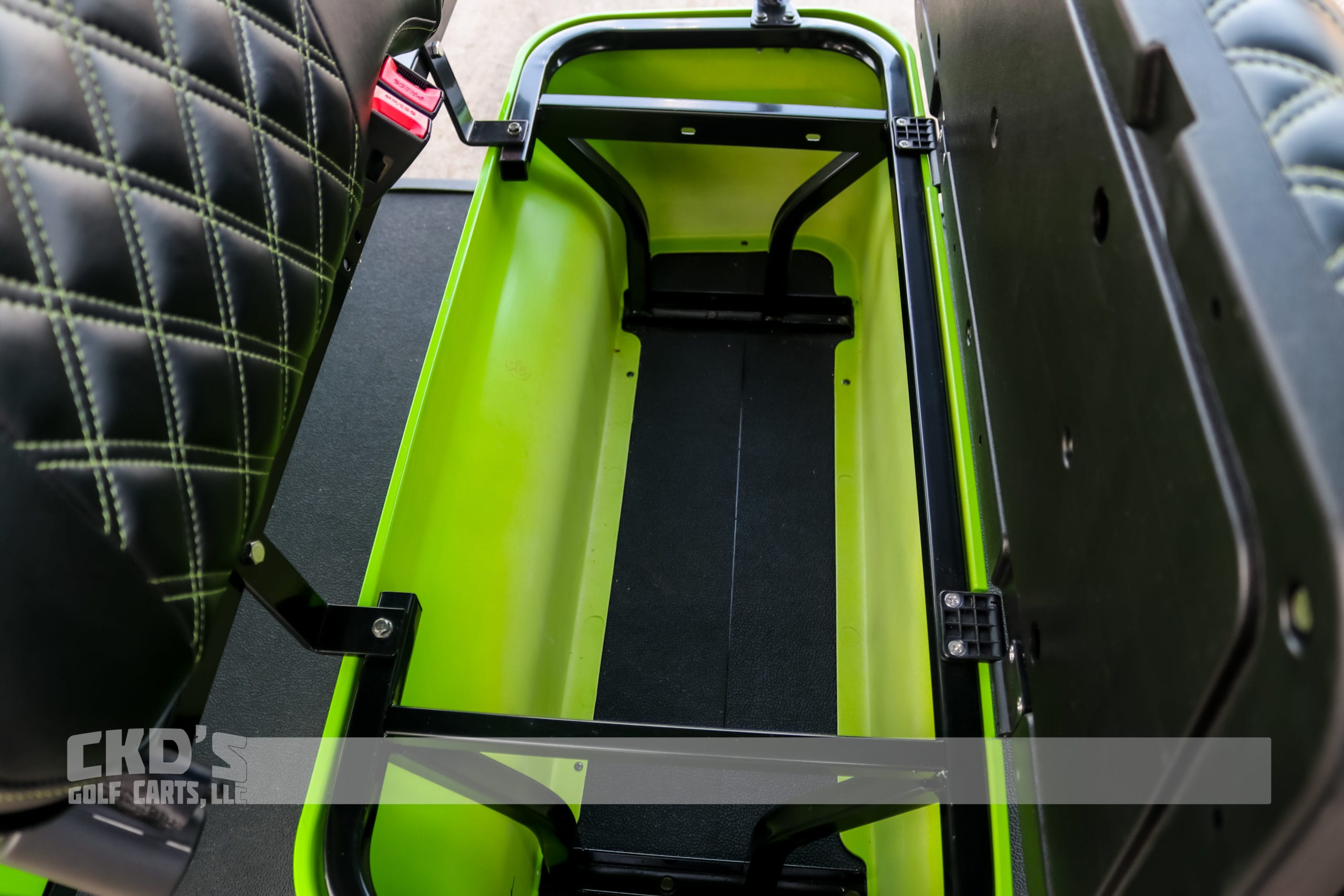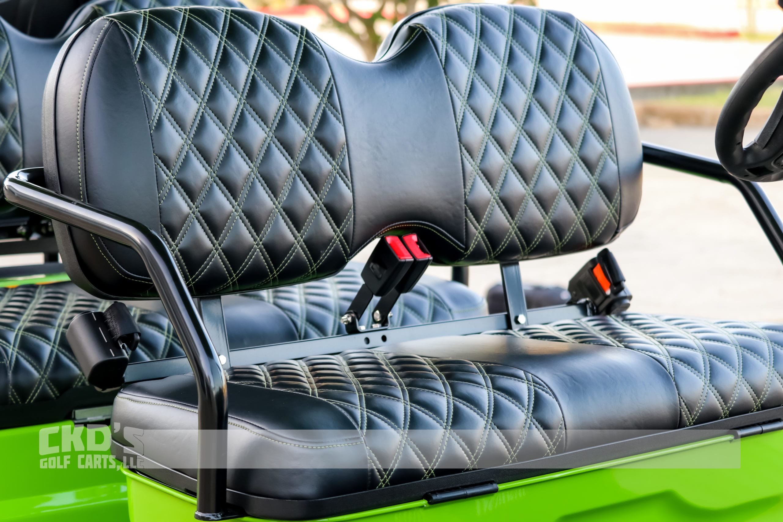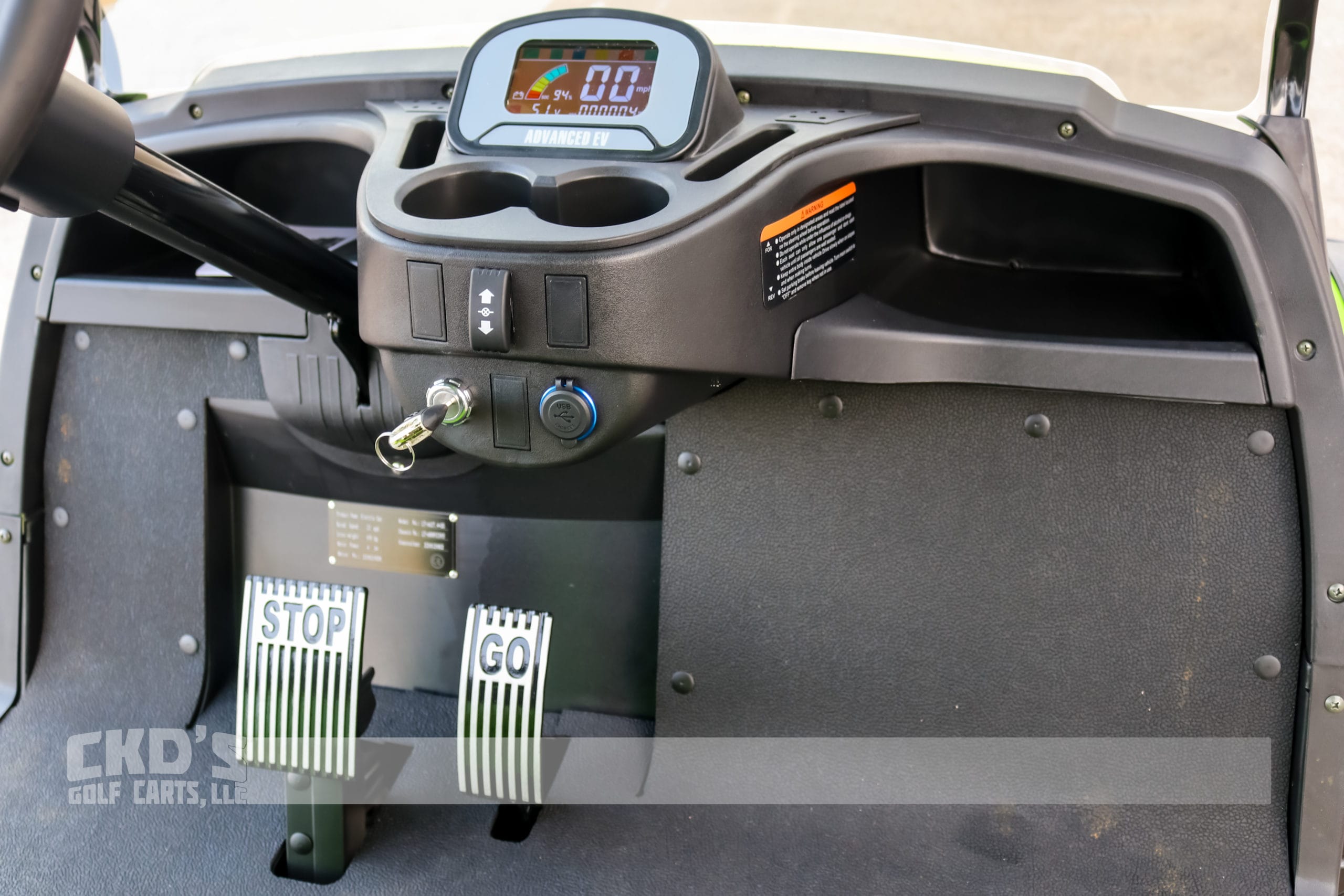 Brand new Lime Green with Black trim 2022 Advanced EV 4+2 six-passenger lifted golf cart and neighborhood cruiser. 48 volt AC drive with the new Trojan Batteries battery pack, 350 amp AC controller, 4kW 5.5 hp motor, on-board charging system, powder coated frame and chassis, 4-wheel disc brakes, independent front suspension, coil spring over shock rear suspension, color-matched long top with grab handles, rear flip seat with grab bar and can add swivel cup holders, Ultimate Light Kit (includes headlights, taillights, brake lights, turn signals and a horn), digital speedometer, digital odometer, digital state of charge meter, side-mounted rear view mirrors, (6) retractable seat belts, Custom black and Lime Green double diamond hand stitched upholstery, 48 to 12 volt reducer, dual USB outlets, Custom 14″ Matte Black MODZ Defender (newest style) wheels with 23″ All-Terrain tires, fender flares, brush guard bumper, tinted folding ‘non-squeak’ windshield and SMV sign. This cart comes with an industry first limited 5 year warranty!