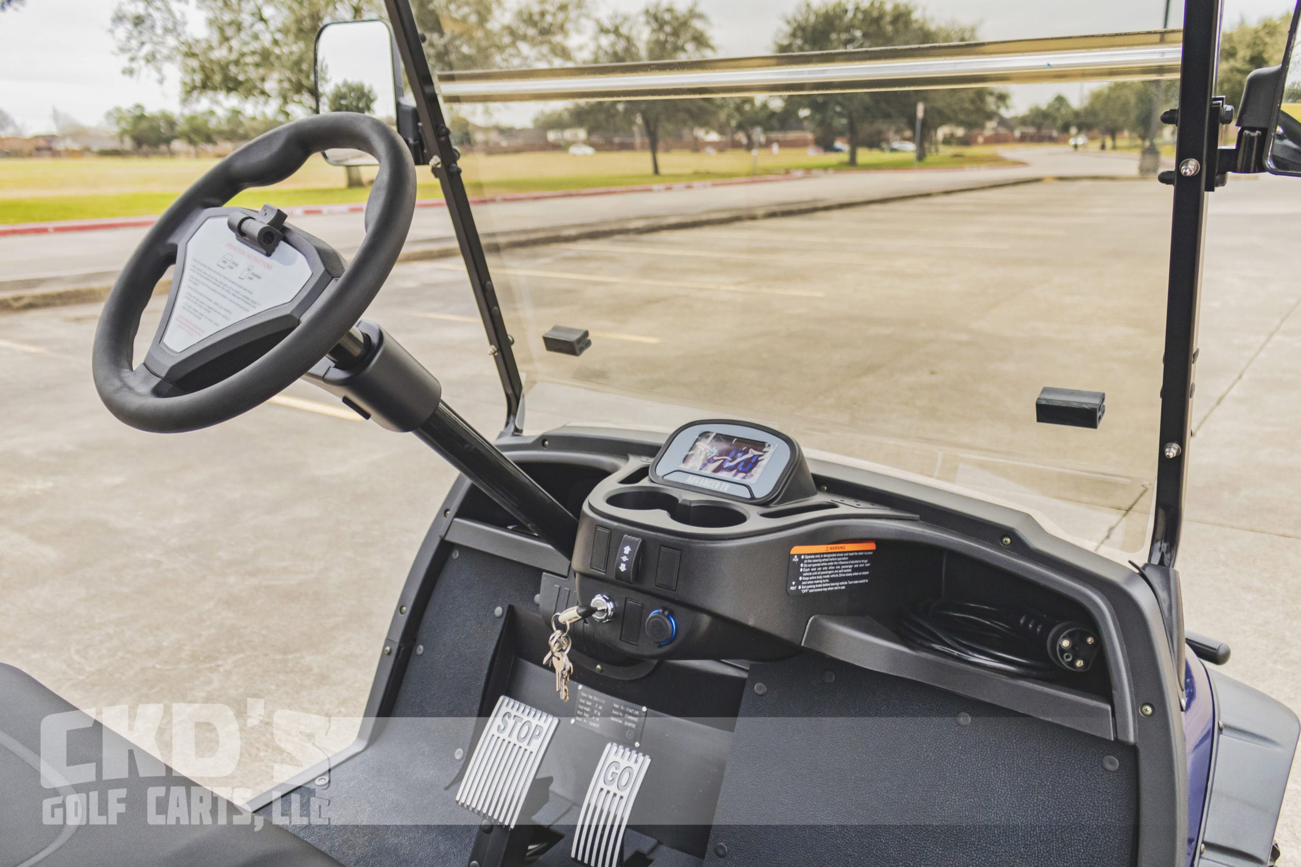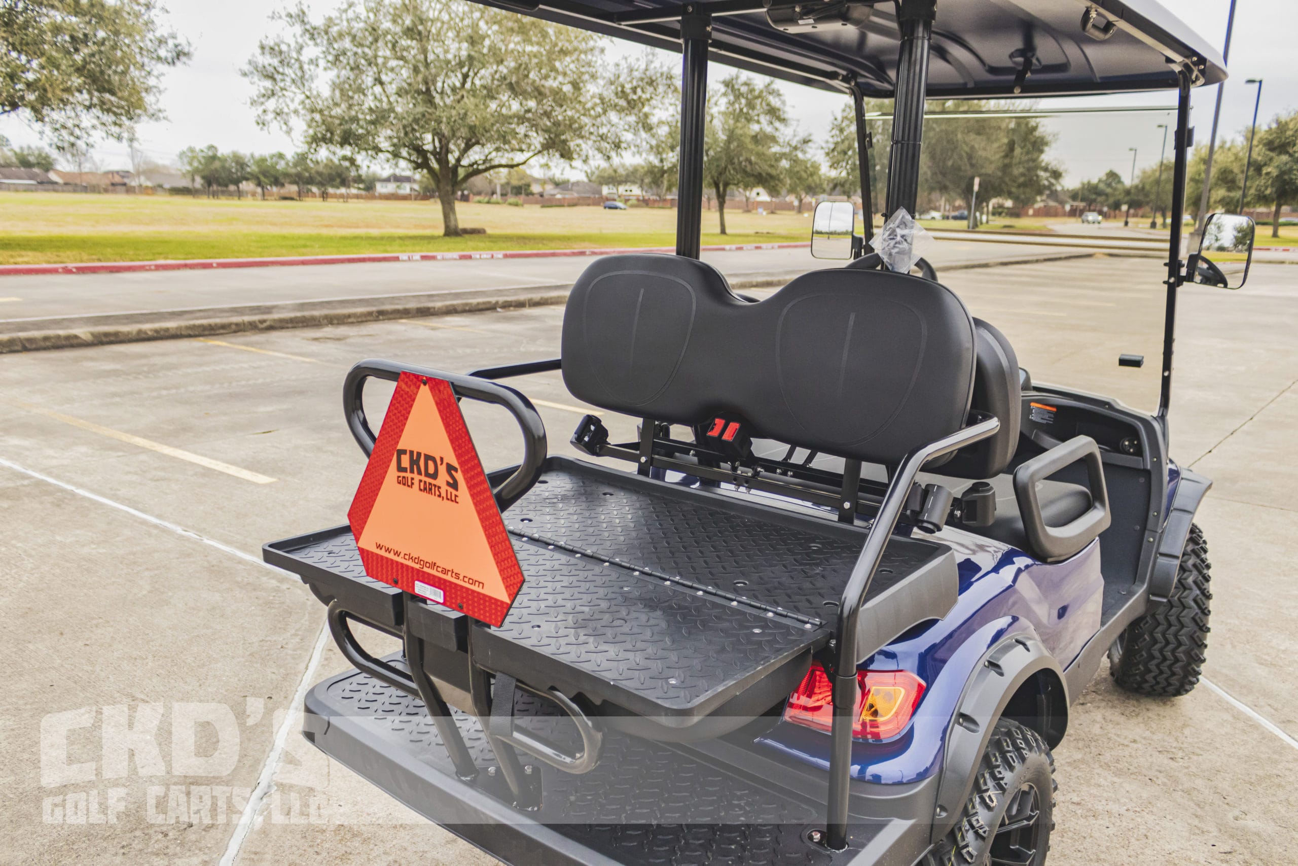 Brand new 2022 Metallic Blue Advanced EV 2+2 four-passenger lifted golf cart and neighborhood cruiser. 48 volt AC drive with new US 8 Volt Battery pack, Toyota 350 amp AC controller and 4kW 5.5 HP motor, onboard charging system, powder-coated frame and chassis, 4-wheel disc brakes, independent front suspension, coil spring over shock rear suspension, color-matched long top with grab handles, rear flip seat with grab bar (can add swivel cup holders), Ultimate Light Kit (includes headlights, taillights, brake lights, turn signals and a horn), digital speedometer, digital odometer, digital state of charge meter, side-mounted rearview mirrors, (4) retractable seat belts, 48 to 12-volt reducer, dual USB outlets, Memphis Bluetooth Soundbar, 14″ Black GTW Spyder Wheels with 23″ Sahara Classic Tires, fender flares, brush guard bumper, tinted folding ‘non-squeak’ windshield and SMV sign. This cart comes with an industry first limited 5-year limited warranty!