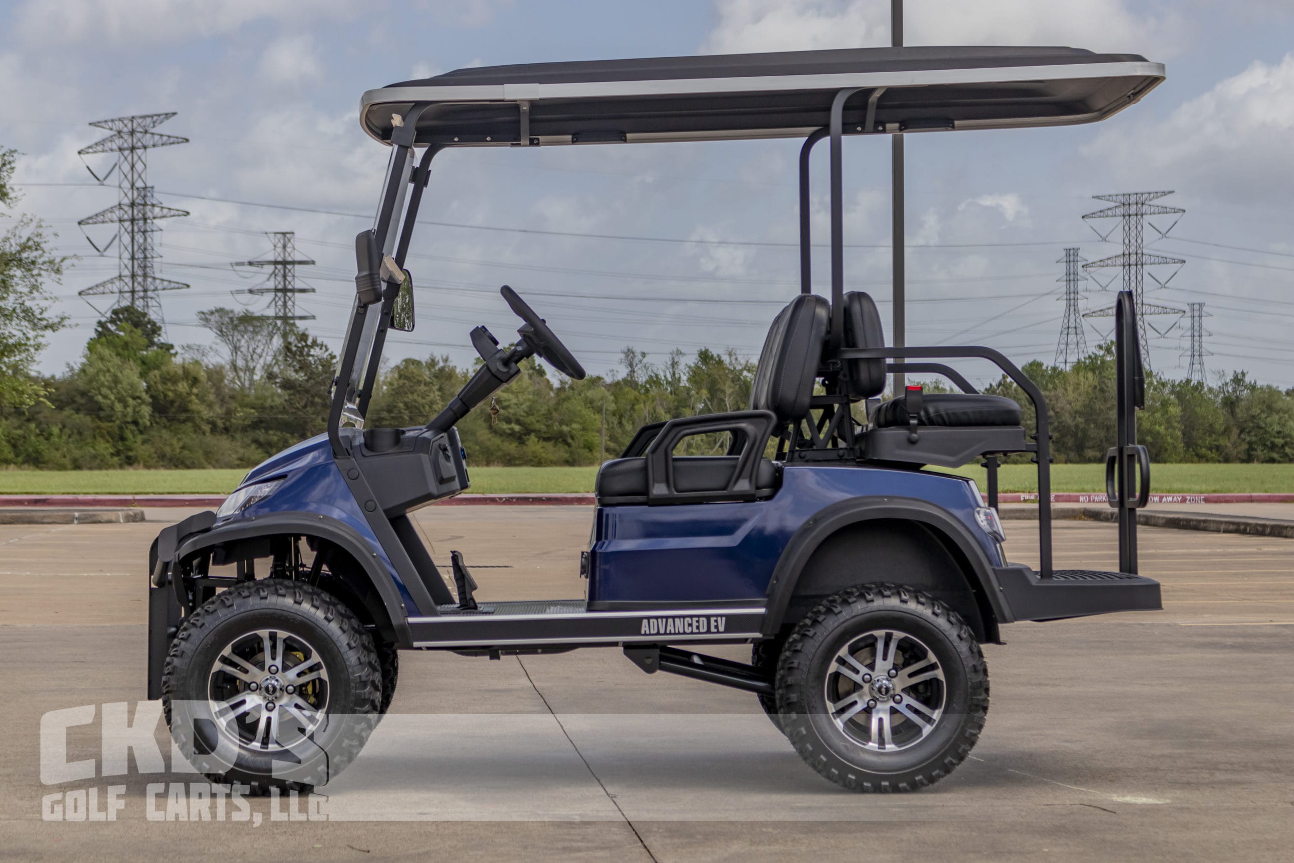 Brand Navy Metallic on Black 2022 Advanced EV 2+2 four-passenger lifted golf cart and neighborhood cruiser. 48 volt AC drive with new 8 Volt US Batteries, Toyota 350 amp AC controller & 4kW 5.5 hp motor, onboard charging system, powder-coated frame and chassis, 4-wheel coil spring over shock suspension, black long top with grab handles, rear flip seat with safety/grab bar and can add swinging cup holders. Ultimate LED Light Kit (includes headlights, taillights, brake lights, tum signals, emergency flashers, and a horn), digital speedometer, digital odometer, digital state of charge meter, dual USB outlets, side-mounted rearview mirrors, custom black Chevron-stitched seat upholstery, (4) retractable seat belts, 48 to 12-volt reducer, custom 12″ black and machined wheels with 23×10.5-12 tires, fender flares, brush guard bumper, folding windshield and SMV sign. This cart comes with a limited, industry first, 5-year warranty!