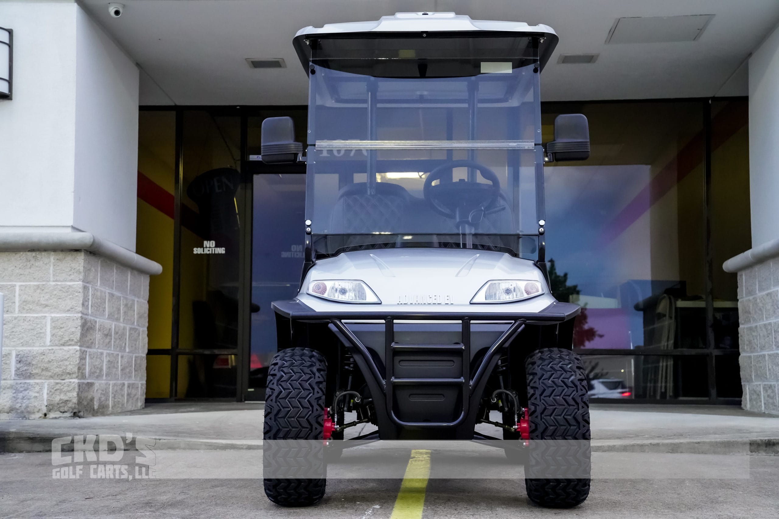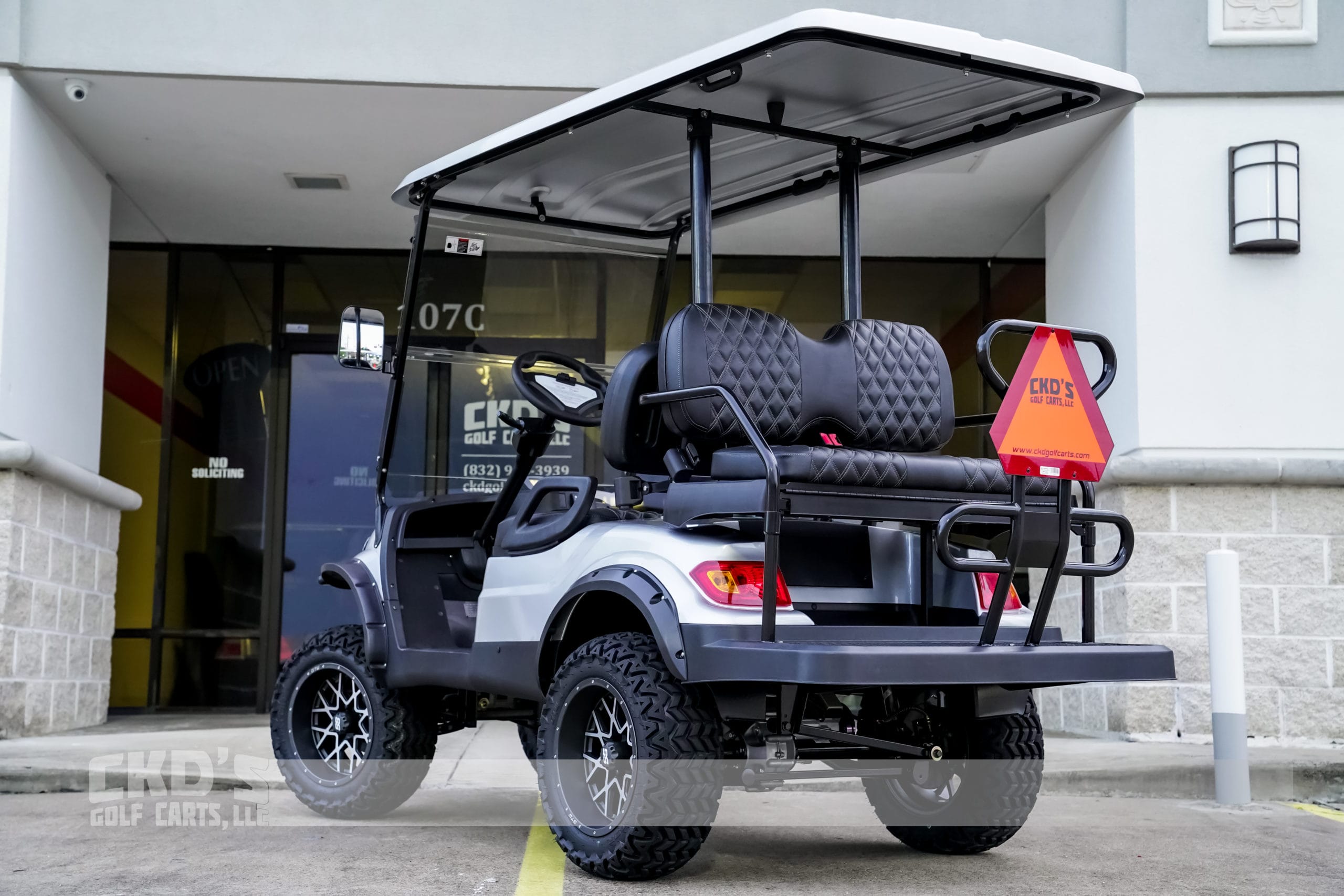 Brand new 2022 Silver and Black Advanced EV 2+2 four-passenger lifted golf cart and neighborhood cruiser. 48 volt AC drive with new US Batteries 8 Volt Battery pack, 350 amp AC controller and 4kW 5.5 HP motor, onboard charging system, powder-coated frame and chassis, 4-wheel disc brakes, independent front suspension, coil spring over shock rear suspension, color-matched long top with grab handles, rear flip seat with grab bar (can add swivel cup holders), Ultimate Light Kit (includes headlights, taillights, brake lights, turn signals and a horn), digital speedometer, digital odometer, digital state of charge meter, side-mounted rearview mirrors, (4) retractable seat belts, 48 to 12-volt reducer, dual USB outlets, 14″ Black and Machined Vortex Wheels with 23″ Predator all-terrain Tires, black and silver custom hand stitched double diamond upholstery, fender flares, brush guard bumper, tinted folding ‘non-squeak’ windshield and SMV sign. This cart comes with an industry first limited 5-year limited warranty!