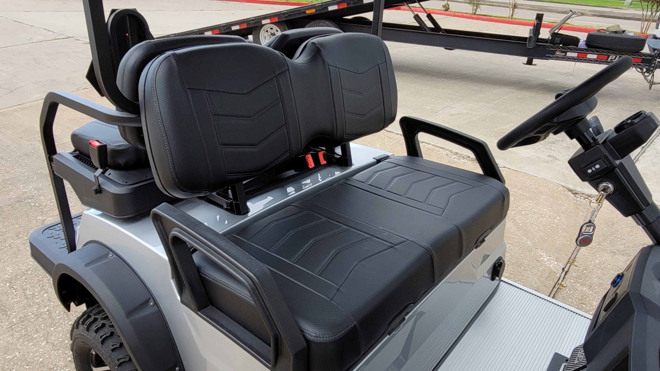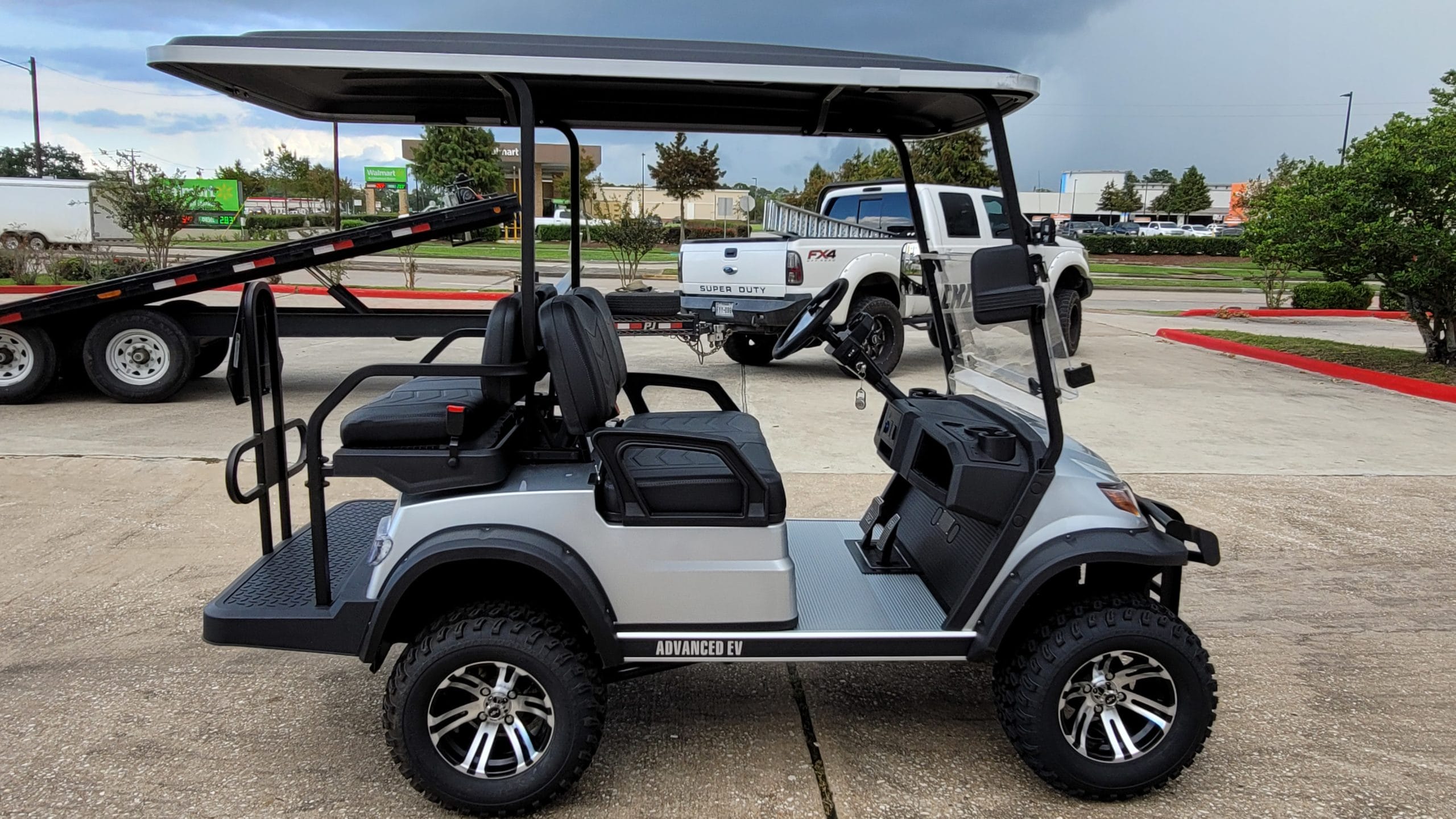 Brand New Silver on Black 2022 Advanced EV 2+2 four-passenger lifted golf cart and neighborhood cruiser. 48 volt AC drive with new 8 Volt US Batteries, Toyota 350 amp AC controller & 4kW 5.5 hp motor, onboard charging system, powder-coated frame and chassis, 4-wheel coil spring over shock suspension, black long top with grab handles, rear flip seat with safety/grab bar and can add swinging cup holders. Ultimate LED Light Kit (includes headlights, taillights, brake lights, tum signals, emergency flashers, and a horn), digital speedometer, digital odometer, digital state of charge meter, dual USB outlets, side-mounted rearview mirrors, custom black Chevron-stitched seat upholstery, (4) retractable seat belts, 48 to 12-volt reducer, custom 12″ black and machined wheels with 23×10.5-12 tires, fender flares, brush guard bumper, folding windshield, and SMV sign. This cart comes with a limited, industry first, 5-year warranty!