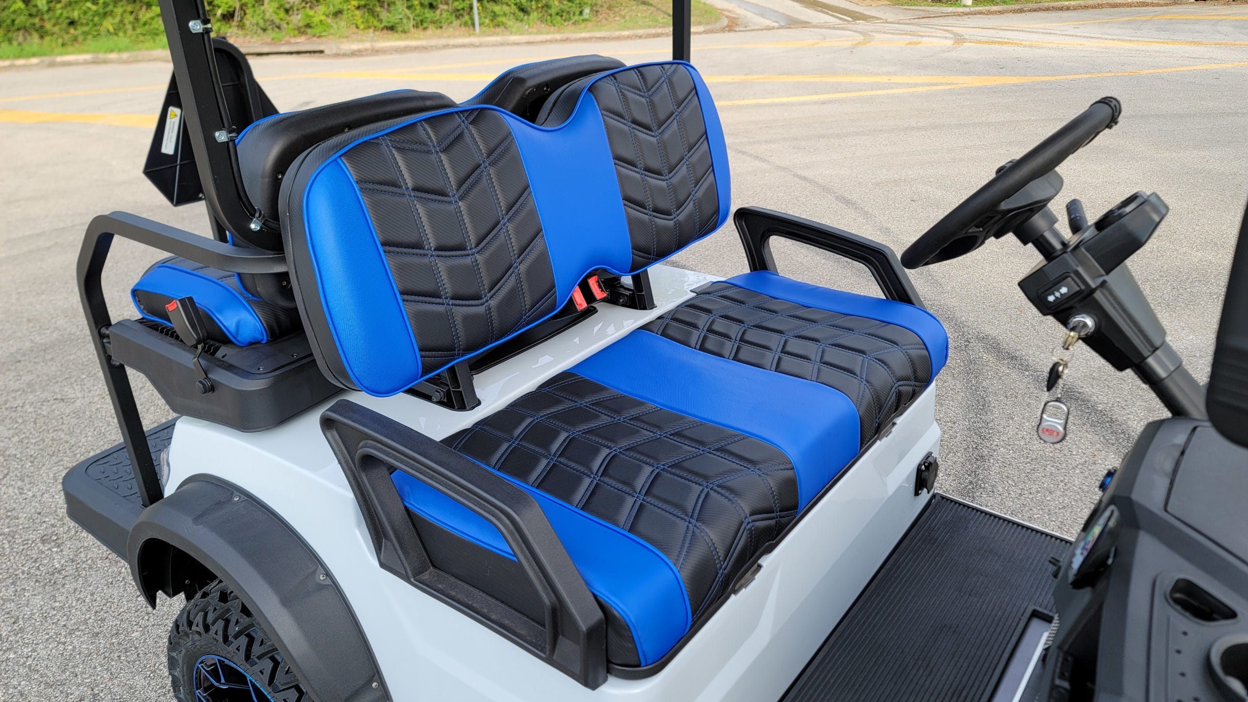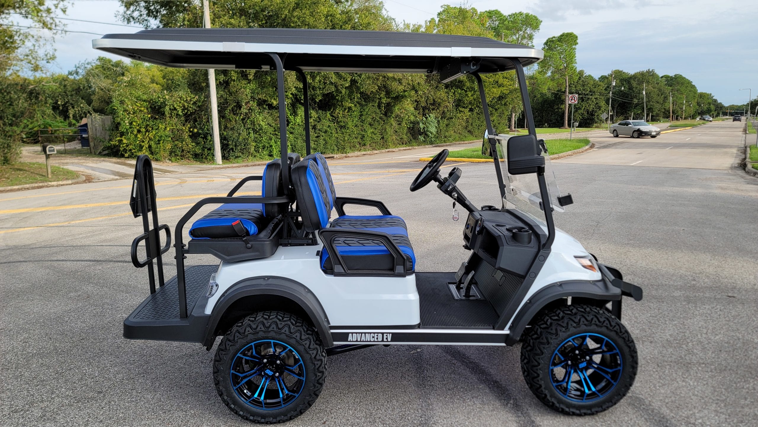 Brand New Special Edition Chalk White Metallic 2022 Advanced EV 2+2 four-passenger lifted golf cart and neighborhood cruiser. 48 volt AC drive with new Trojan Batteries, Curtis 350 amp AC controller & 4kW 5.5 hp motor, onboard charging system, powder-coated frame and chassis, 4-wheel coil spring over shock suspension, black long top with grab handles, rear flip seat with safety/grab bar and can add swinging cup holders. Ultimate LED Light Kit (includes headlights, taillights, brake lights, tum signals, emergency flashers, and a horn), digital speedometer, digital odometer, digital state of charge meter, dual USB outlets, side-mounted rearview mirrors, custom black and blue stitched seat upholstery, (4) retractable seat belts, 48 to 12-volt reducer, custom 14″ black and Blue GTW Spyder Wheels with 23″ Predator All-terrain Tires, fender flares, brush guard bumper, folding windshield, Wetsounds Stealth 10 Ultra HD paired with a Wetsounds AS-8 powered subwoofer, Wetsounds underbody RGB lights and SMV sign. This cart comes with a limited 2-year warranty!