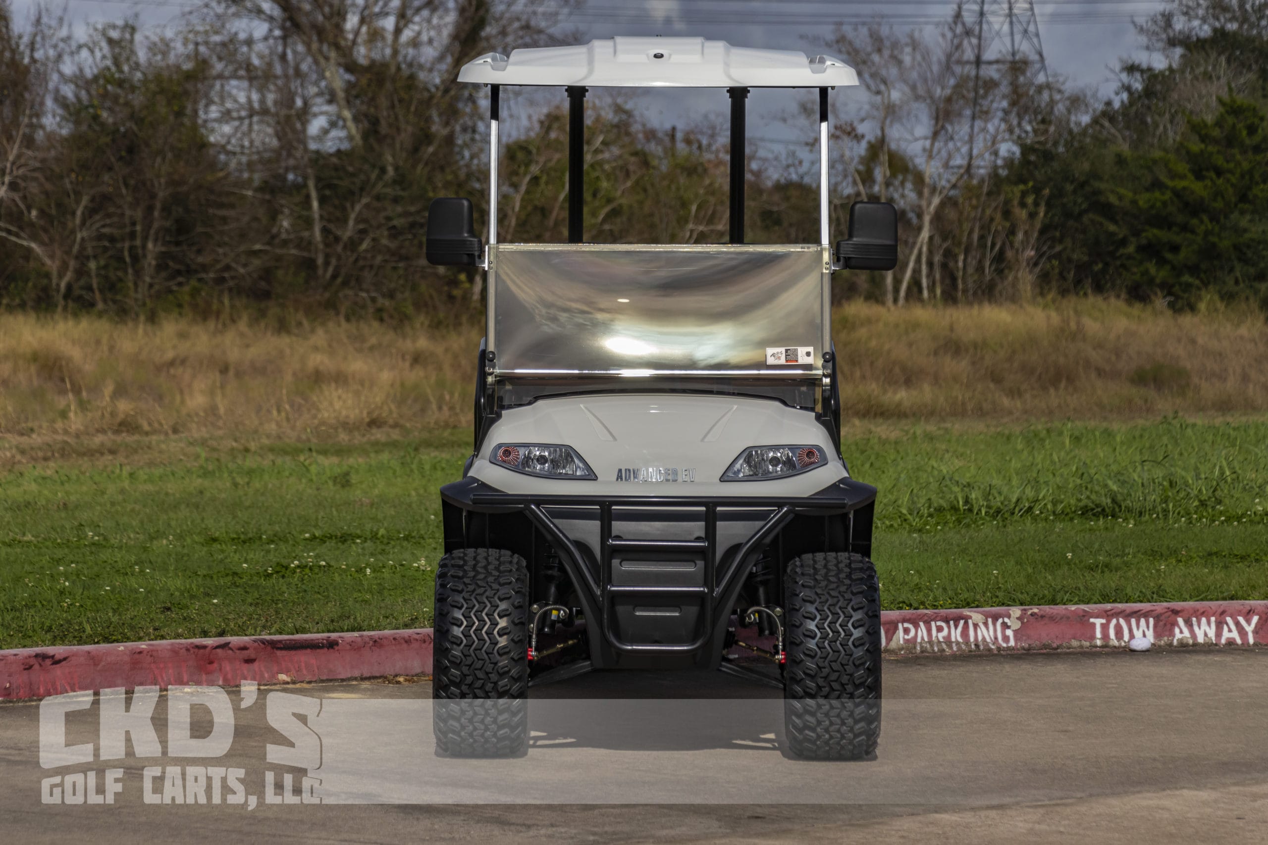 Brand new Glacier White with Black trim 2022 Advanced EV 4+2 six-passenger lifted golf cart and neighborhood cruiser. 48 volt AC drive with the new huge RoyPow 160Ah lithium battery pack, 350 amp AC controller, 4kW 5.5 hp motor, onboard charging system, powder-coated frame and chassis, 4-wheel disc brakes, independent front suspension, coil spring over shock rear suspension, color-matched long top with grab handles, rear flip seat with grab bar and swinging cup holders, Ultimate Light Kit (includes headlights, taillights, brake lights, turn signals, emergency flashers, and a horn), digital speedometer, digital odometer, digital state of charge meter, side-mounted rearview mirrors, (6) retractable seat belts, 48 to 12-volt reducer, dual USB outlets, 12″ black and machined wheels with 23-inch tires, fender flares, brush guard bumper, tinted folding ‘non-squeak’ windshield, and SMV sign. This cart comes with an industry-first limited 5-year warranty!