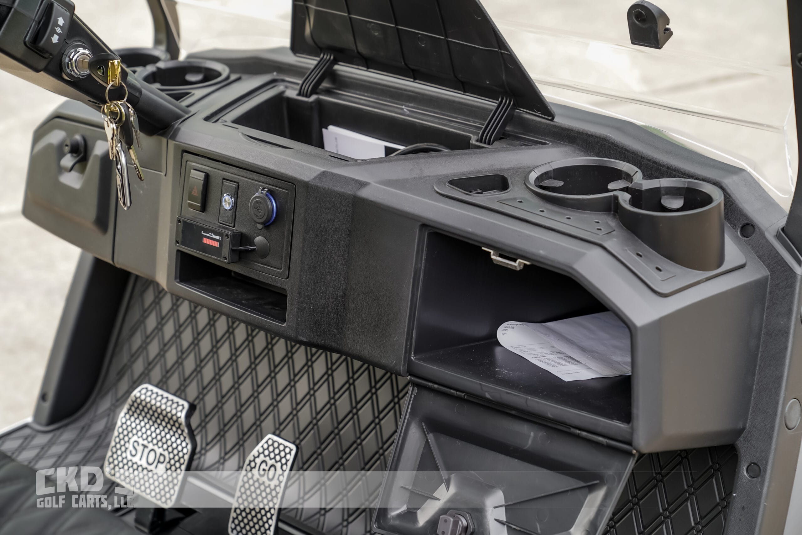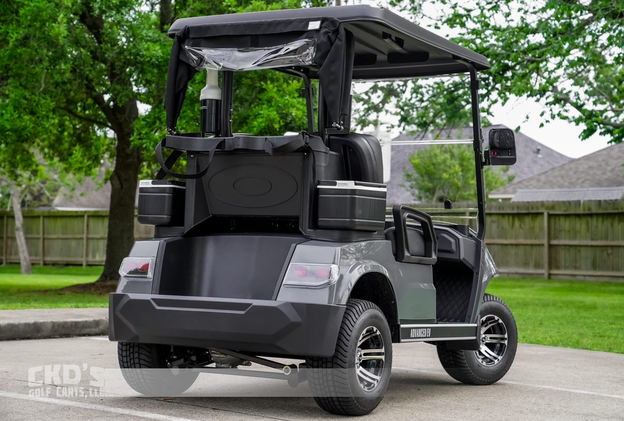 Brand New Gun Metal Grey on custom Black bolstered diamond stitched seats 2023 Advanced EV 2 passenger golf cart and neighborhood cruiser. 48 volt AC drive with new Advanced Li 100Ah Lithium Battery, 350 amp AC controller & 4kW 5.5 hp motor, onboard charging system, powder-coated frame and chassis, 4-wheel coil spring over shock suspension, black top with grab handles, built-in golf bag holders. golf package (which includes (2) sand bottle and (2) coolers). Ultimate Light Kit (includes LED headlights, LED taillights, LED brake lights, LED turn signals, emergency flashers and a horn), digital speedometer, digital odometer, digital state of charge meter, dual USB outlets, side-mounted rearview mirrors, (4) retractable seat belts, 48 to 12-volt reducer, custom 10″ black and machined wheels with 205/50-10 tires, brush guard bumper, folding windshield, black golf bag cover, Extreme Mats diamond pattern floor mat and SMV sign (not shown). This cart comes with a limited 5-year warranty!