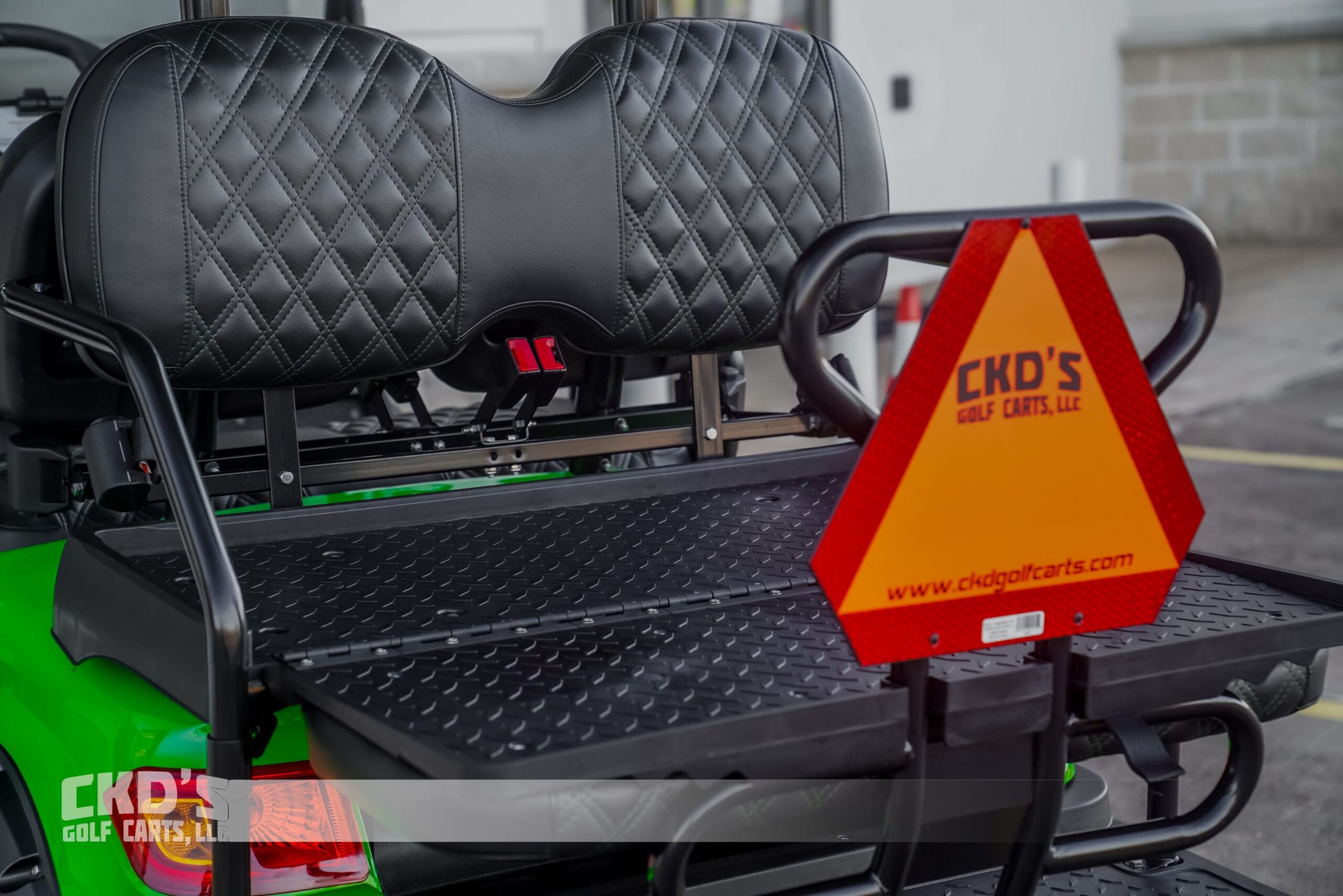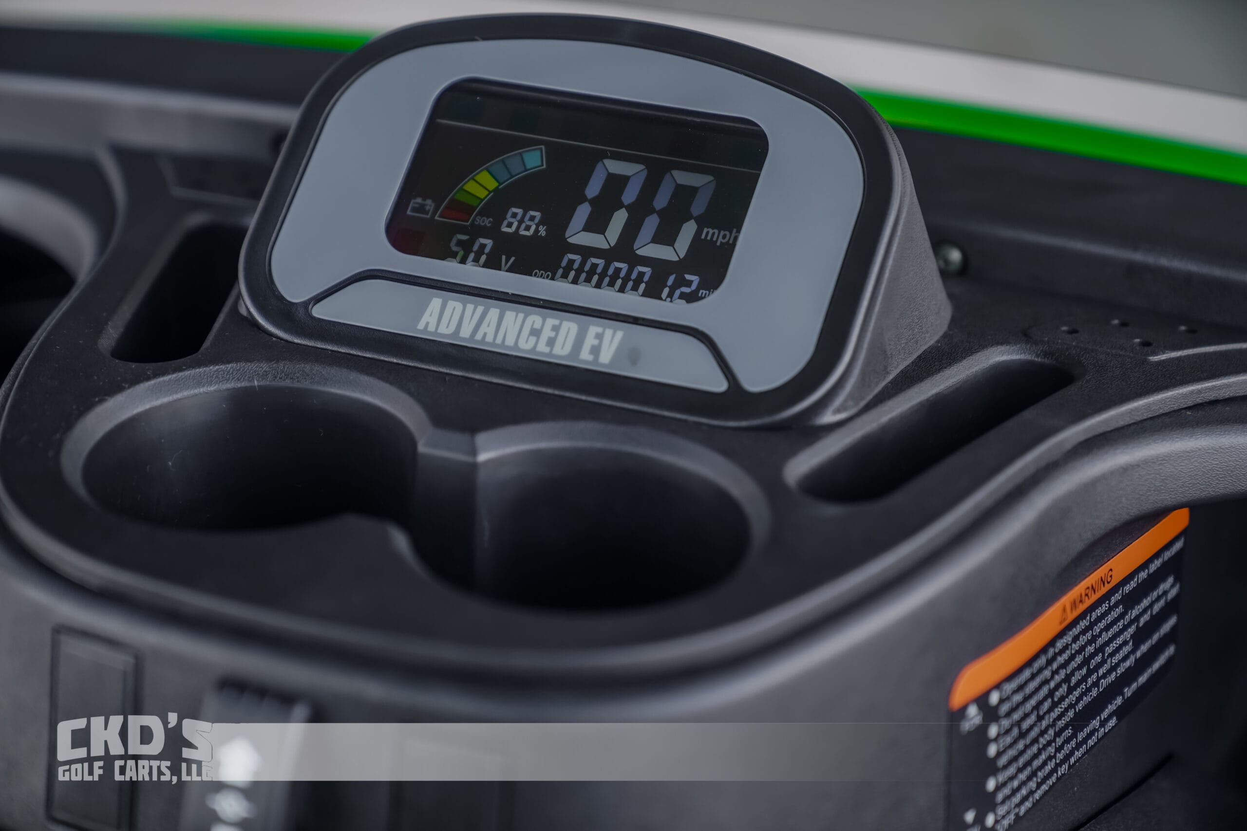 Brand new 2023 Lime Green Advanced EV 2+2 four-passenger lifted golf cart and neighborhood cruiser. 48 volt AC drive with new Trojan 8 Volt Battery pack, 350 amp AC controller and 4kW 5.5 HP motor, onboard charging system, powder-coated frame and chassis, 4-wheel disc brakes, independent front suspension, coil spring over shock rear suspension, color-matched long top with grab handles, rear flip seat with grab bar (can add swivel cup holders), Ultimate Light Kit (includes headlights, taillights, brake lights, turn signals and a horn), digital speedometer, digital odometer, digital state of charge meter, side-mounted rearview mirrors, (4) retractable seat belts, 48 to 12-volt reducer, dual USB outlets, 14″ MODZ Black Fury Wheels with 23″ Sahara Classic All-Terrain Tires, custom black and green double diamond hand stitched upholstery, fender flares, brush guard bumper, tinted folding ‘non-squeak’ windshield and SMV sign. This cart comes with an industry first limited 5-year limited warranty!