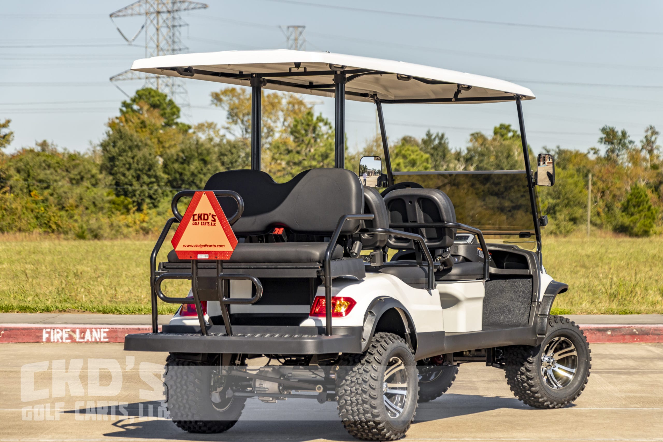 Brand new Glacier White with Black seats 2023 Advanced EV 4+2 six-passenger lifted golf cart and neighborhood cruiser. 48 volt AC drive with new US Battery 8 Volt battery pack, 350 amp AC controller, 4kW 5.5 hp motor, on-board charging system, powder coated frame and chassis, 4-wheel disc brakes, independent front suspension, coil spring over shock rear suspension, body color-matched long top with grab handles, rear flip seat with grab bar (can add swinging cup holders), Ultimate Light Kit (includes headlights, taillights, brake lights, turn signals, emergency flashers and a horn), digital speedometer, digital odometer, digital state of charge meter, side-mounted rear view mirrors, (6) retractable seat belts, 48 to 12 volt reducer, dual USB outlets, 12″ black and machined wheels with 23 inch tires, fender flares, brush guard bumper, tinted folding ‘non-squeak’ windshield, and SMV sign. This cart comes with an industry first limited 5 year warranty!