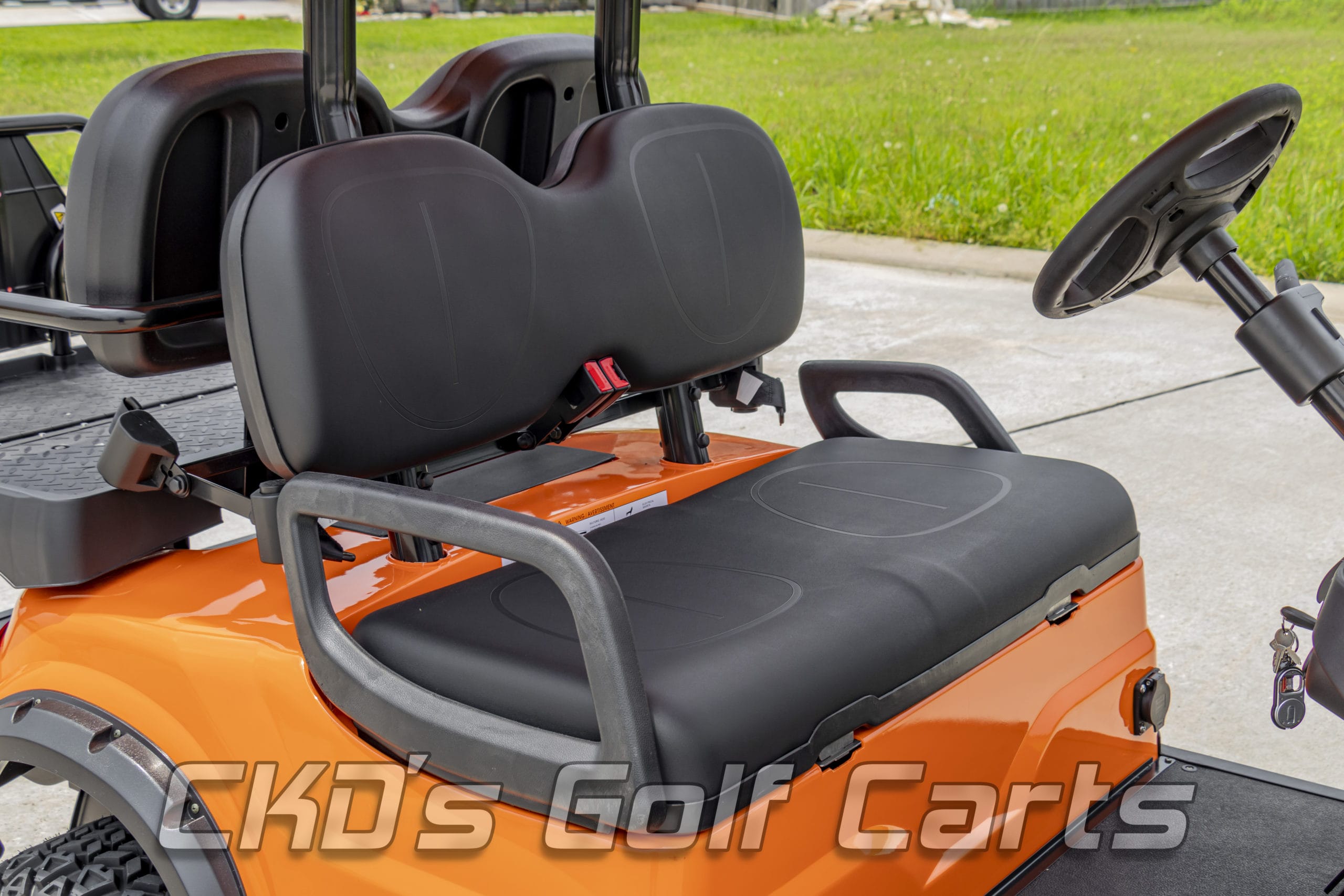 Brand New 2021 Orange Metallic with Black seats Advanced EV 2+2 four-passenger lifted golf cart and neighborhood cruiser. 48 volt AC drive with new US Batteries, Toyota 350 amp AC controller and 4kW 5.5 hp motor, onboard charging system, powder-coated frame and chassis, 4-wheel disc brakes, independent front suspension, coil spring over shock rear suspension, color-matched long top with grab handles, rear flip seat with grab bar and swinging cup holders, Ultimate Light Kit (includes headlights, taillights, brake lights, turn signals, emergency flashers, and a horn), digital speedometer, digital odometer, digital state of charge meter, side-mounted rearview mirrors, (6) retractable seat belts, 48 to 12-volt reducer, dual USB outlets, 14″ matte black Dominator wheels with 23 inch X-Trail tires, fender flares, brush guard bumper, tinted folding ‘non-squeak’ windshield and SMV sign. This cart comes with a limited 2-year warranty!