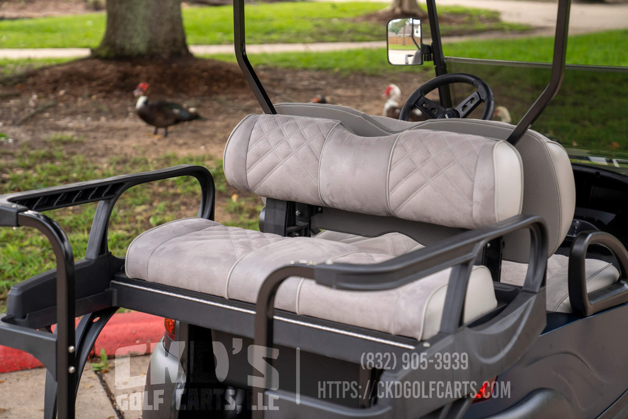 For comfort and style, it has Custom Red Dot Pewter Suede Seats, a USA Made Max 6 Rear flip seat with hidden under-seat storage and an 80″ black top.