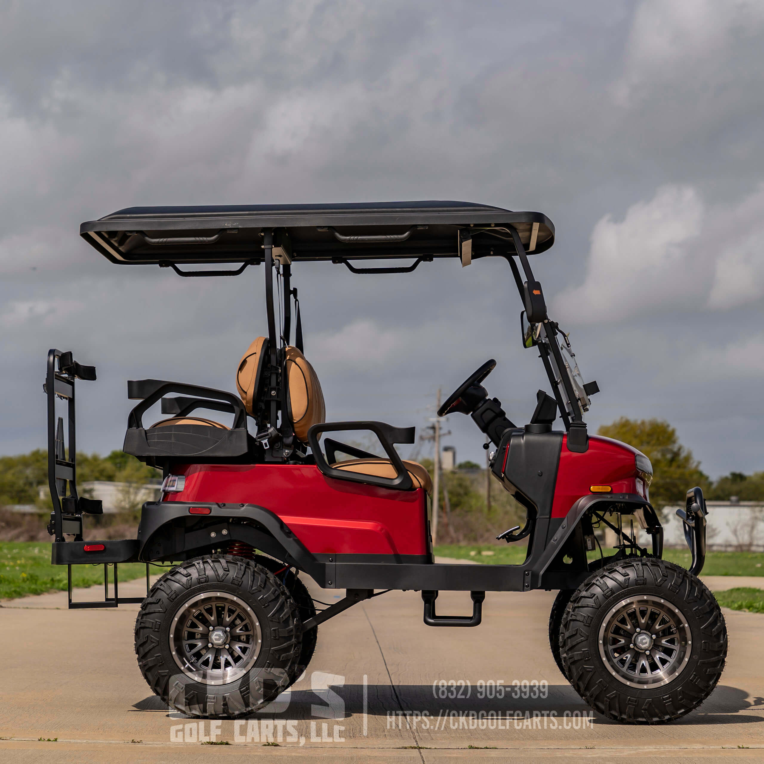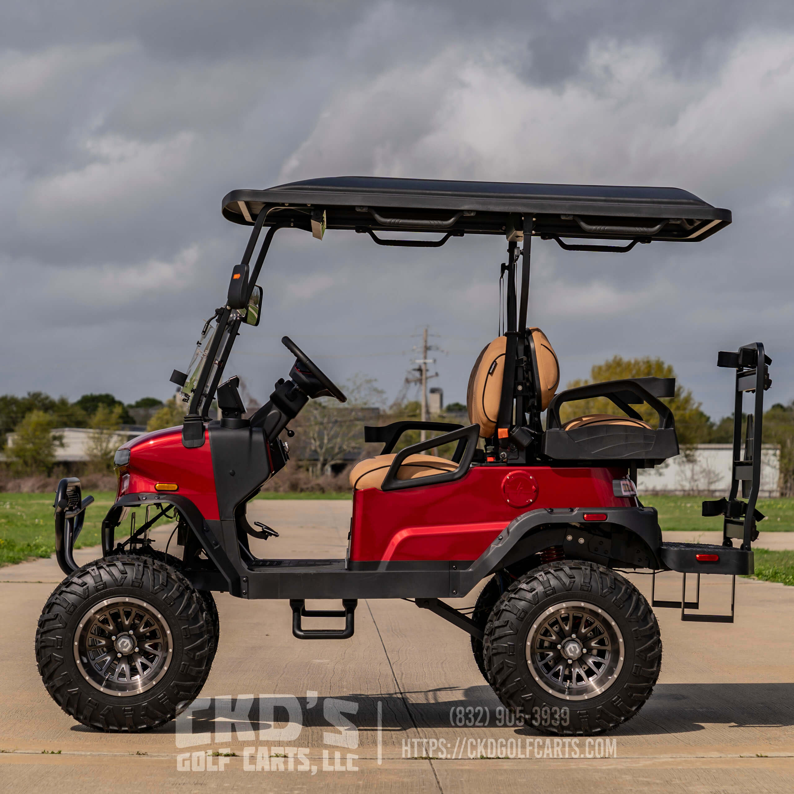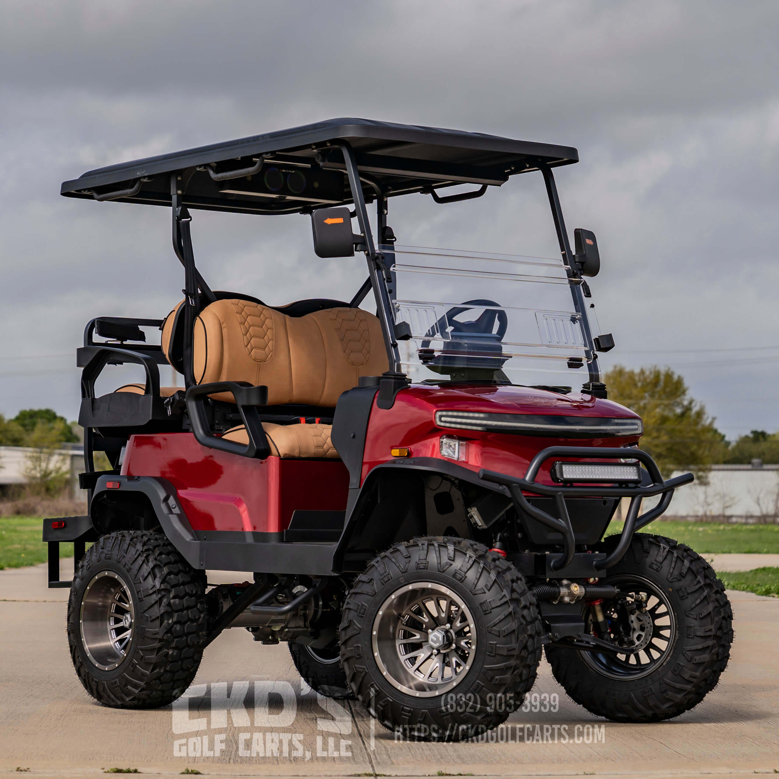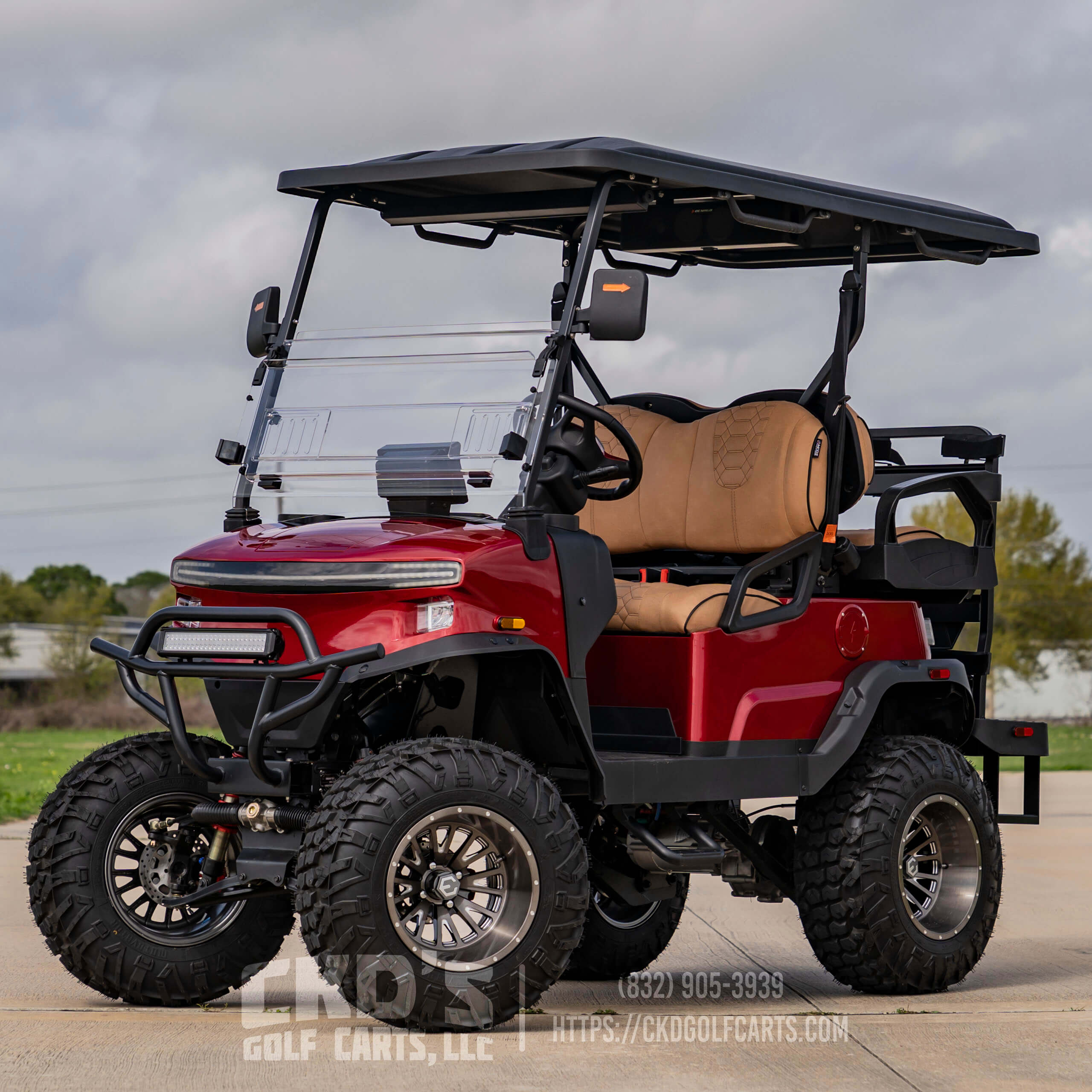 Turn heads with this fully customized Denago Nomad XL Monster finished in Ruby Red Metallic with color-matched trim. This cart combines luxury, power, and cutting-edge technology, built on a durable aluminum chassis and powered by a 51.2V 105Ah LiFePO4 lithium battery with up to 40 miles of range. This build features CKD’s exclusive Denago Monster Lift Kit, Ruby Red Metallic paint, aggressive custom wheels & tire package, and custom upgraded seating.