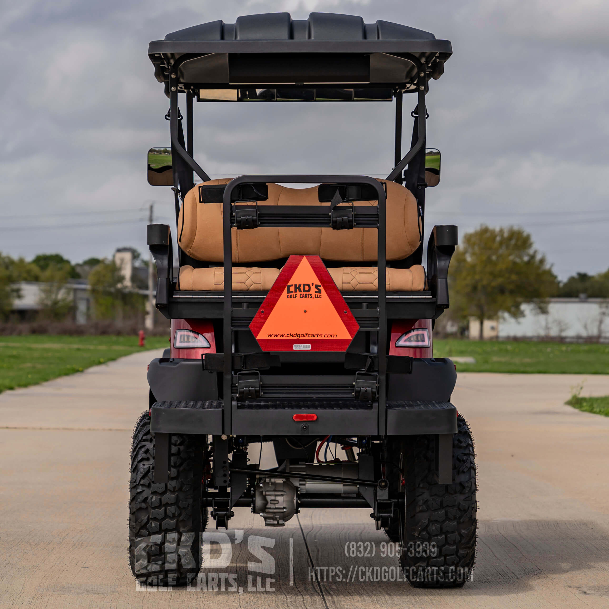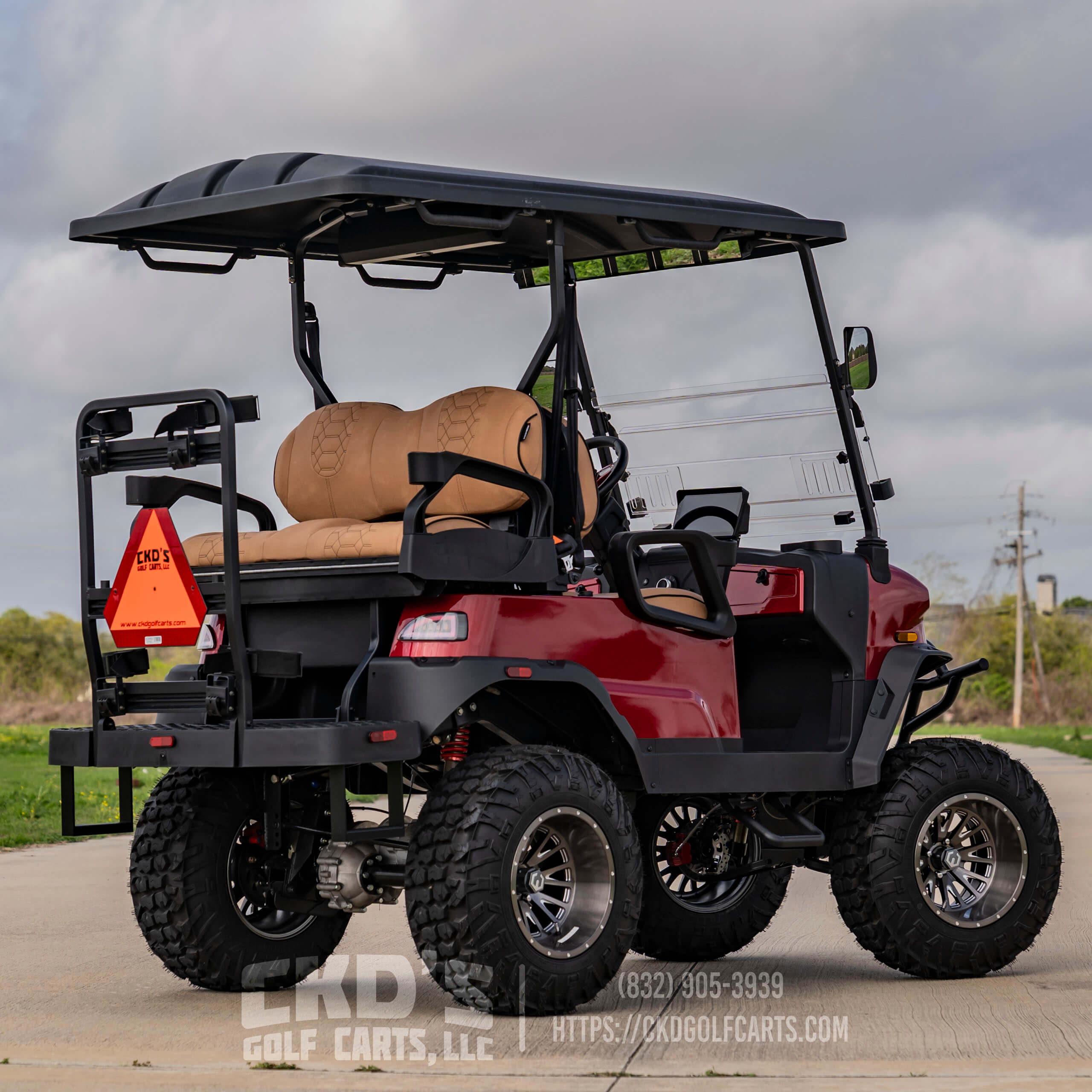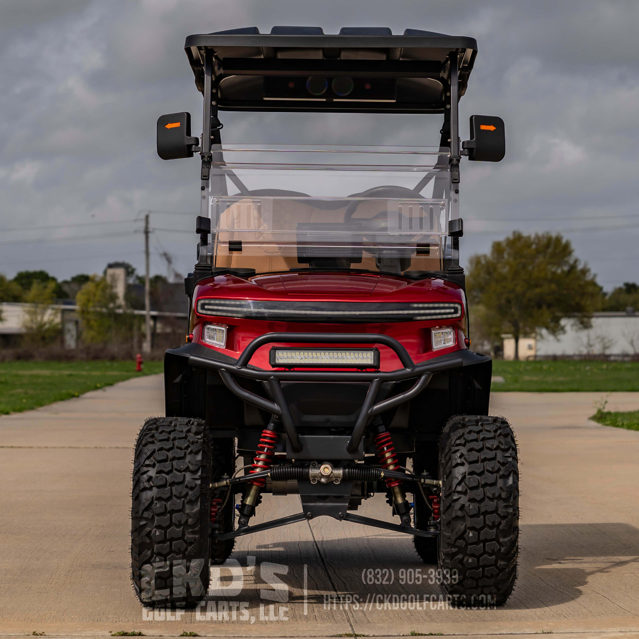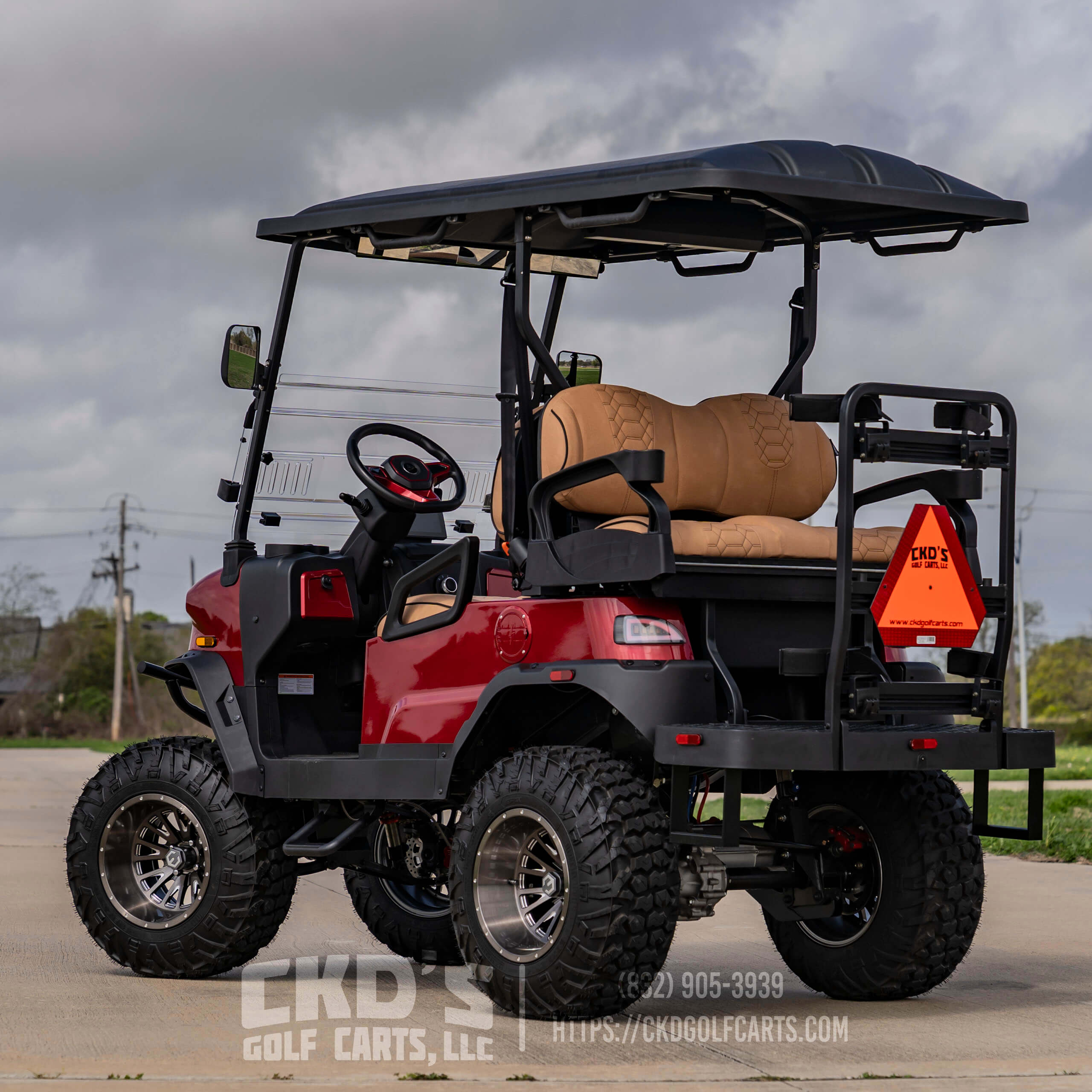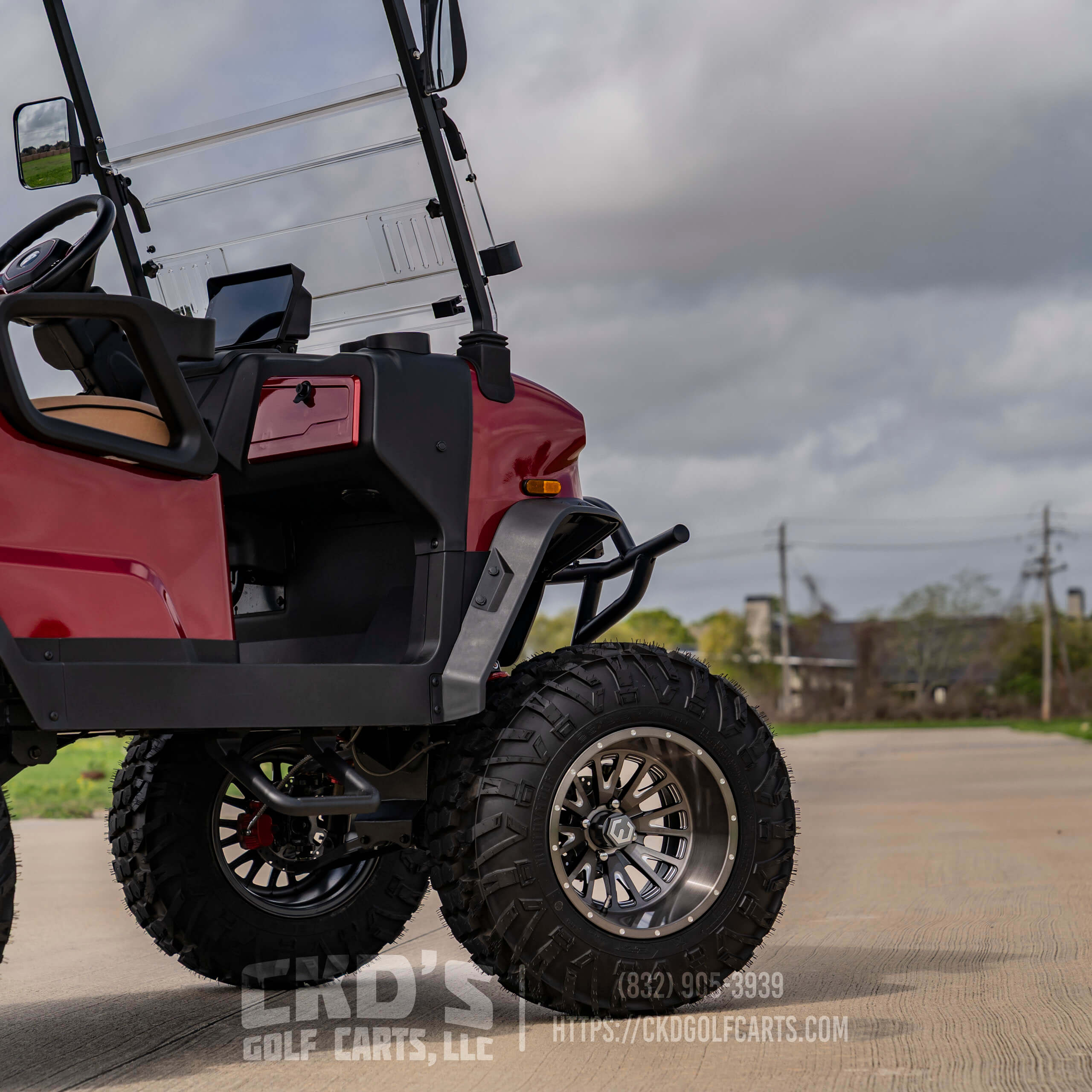 Turn heads with this fully customized Denago Nomad XL Monster finished in Ruby Red Metallic with color-matched trim. This cart combines luxury, power, and cutting-edge technology, built on a durable aluminum chassis and powered by a 51.2V 105Ah LiFePO4 lithium battery with up to 40 miles of range. This build features CKD’s exclusive Denago Monster Lift Kit, Ruby Red Metallic paint, aggressive custom wheels & tire package, and custom upgraded seating.