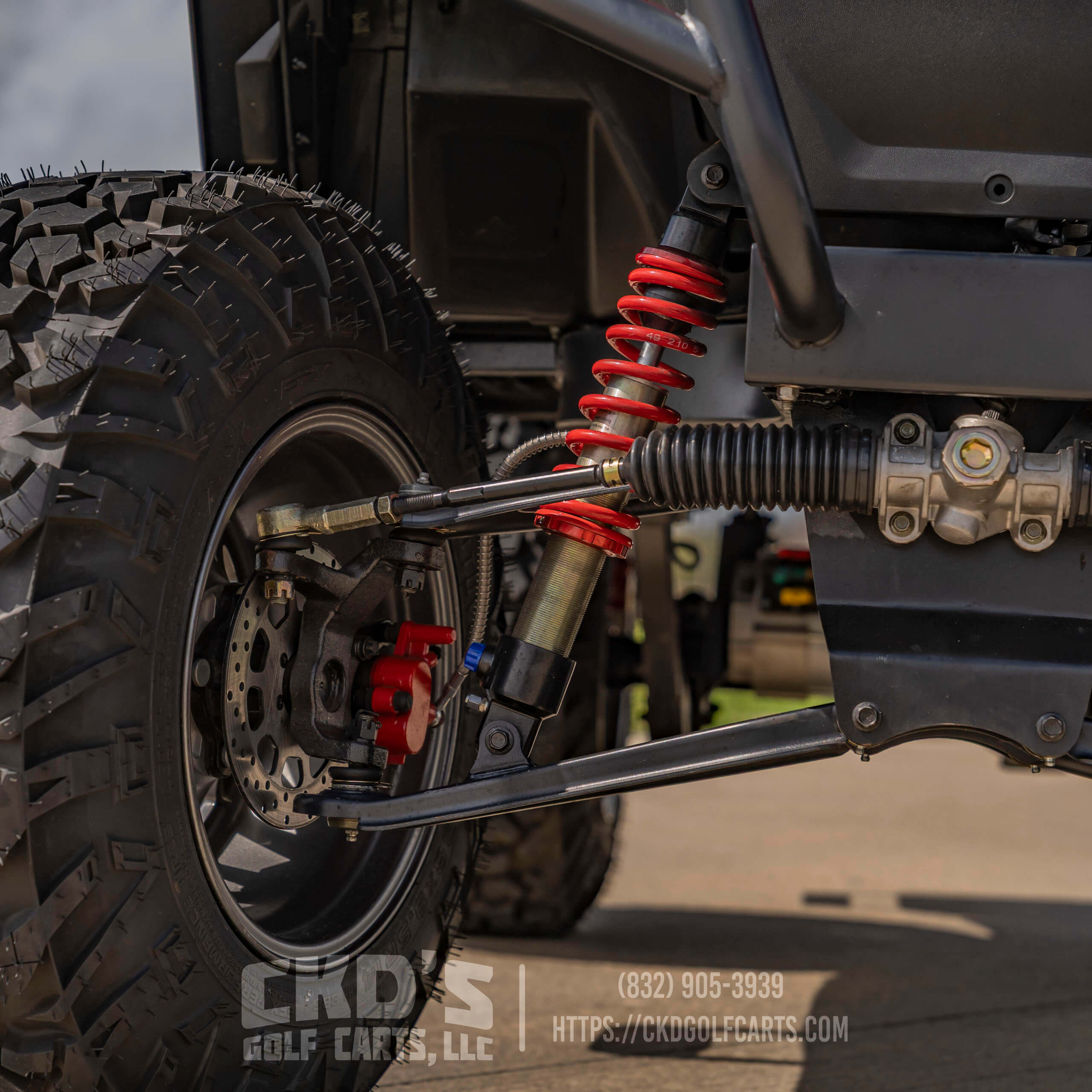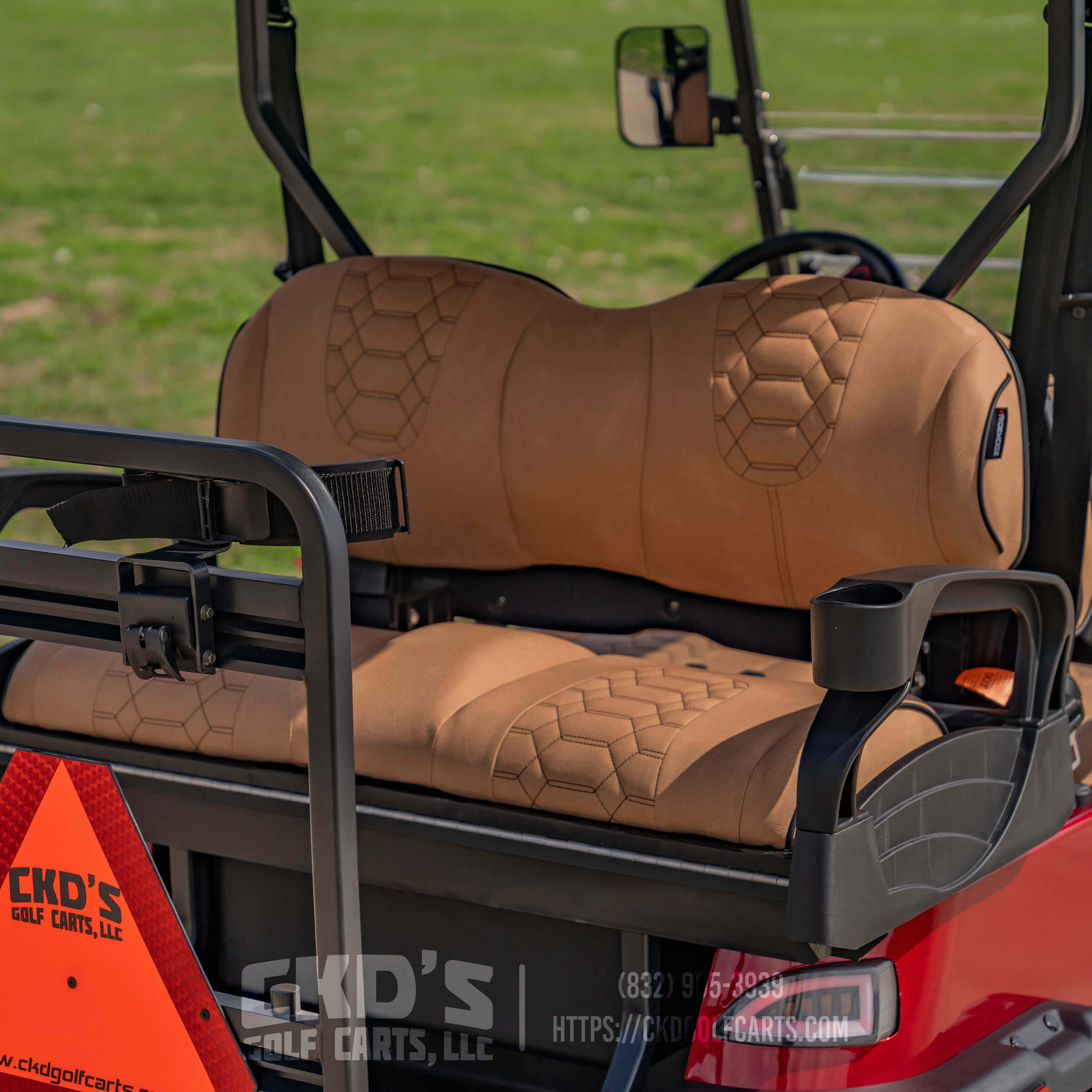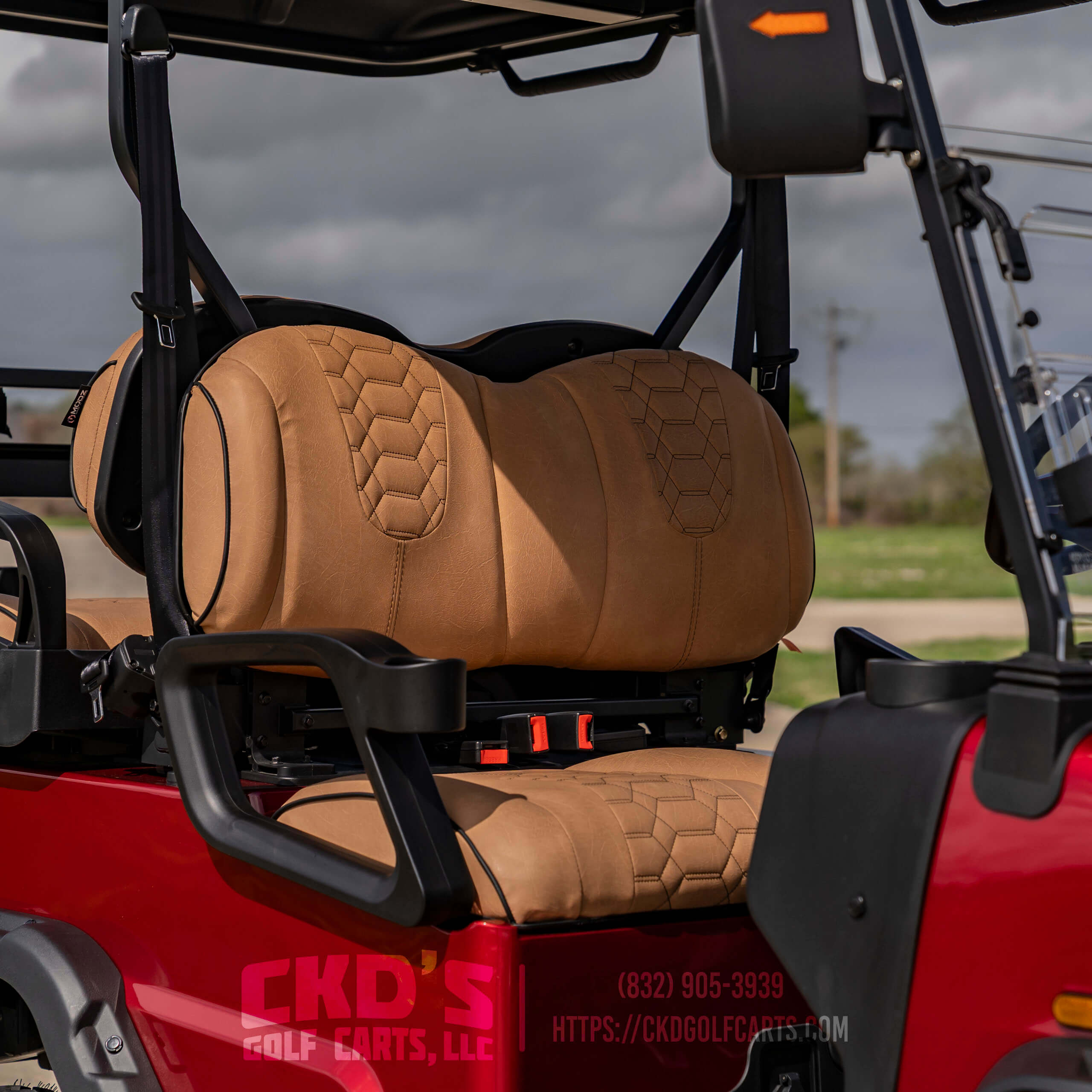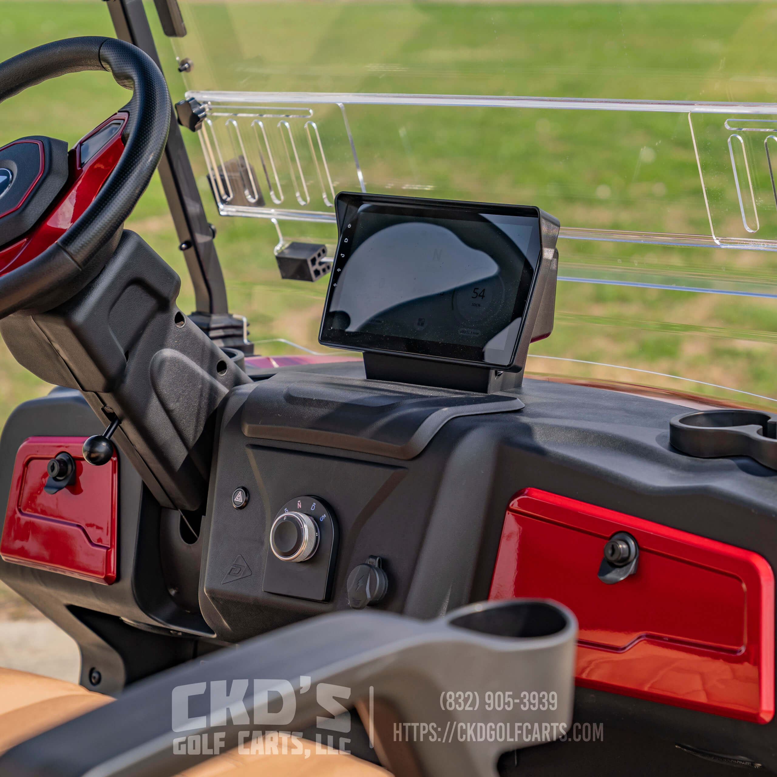 Turn heads with this fully customized Denago Nomad XL Monster finished in Ruby Red Metallic with color-matched trim. This cart combines luxury, power, and cutting-edge technology, built on a durable aluminum chassis and powered by a 51.2V 105Ah LiFePO4 lithium battery with up to 40 miles of range. This build features CKD’s exclusive Denago Monster Lift Kit, Ruby Red Metallic paint, aggressive custom wheels & tire package, and custom upgraded seating.