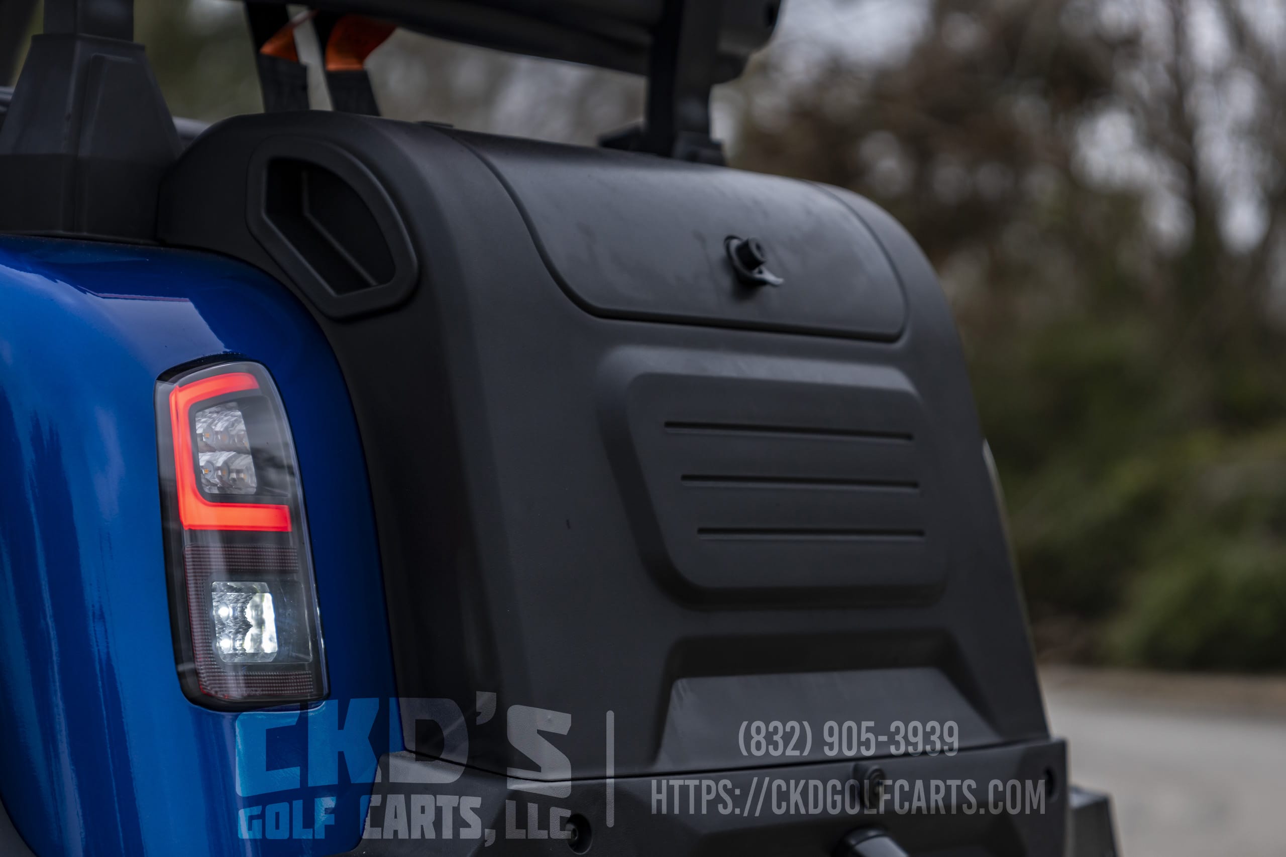 CKD’s Golf Carts, is now offering the all new 48 volt lifted lithium Denago EV golf carts! These carts are super nice! The Rover XL model comes with all the bells and whistles, have black powder coated aluminum frames (for no rust) and are priced right, starting at $9995! This cart in Camaro Blue comes lifted with all of the following accessories: 14″ MODZ Chaos chrome wheels with 23″ tires, independent front suspension, grease fittings on suspension points, super comfortable seats wrapped in custom MODZ seat upholstery with 3 point seat belts, LED Ultimate light kit (includes LED daytime running lights, LED headlights, taillights, brake lights, emergency flashers, turn signals and horn), Keyless ignition (with an RFID card), 80″ extended top to cover all passengers, 5KW AC Drive motor, 350A controller, clear folding windshield with built-in vents, side view mirrors and rear view mirror, custom steering wheel, USB B&C charging ports, front LED light bar, rear storage compartment/ice chest, grab handles, 105Ah Lithium Battery Pack with 5 year warranty, factory automatic charger, brush guard, cup holders, large dash screen showing speed, state of charge, odometer, speedometer, Apple Car Play, Android Auto, Navigation, upgraded Wetsounds stereo system with (2) RECON 6.5″ speakers and (2) RECON pod speakers and built-in RGB lights, rear view back up camera, running boards/side steps and SMV sign. The cart is set to go 25 mph and it rides super smooth! 2 year warranty on the cart and 5 year warranty on the battery! This one has upgraded MODZ Chaos 14″ chrome wheels with 23″ tires for that tough look! We also replaced the front LED Daytime Running Lights with RGB’s and tied it into the RGB controller!