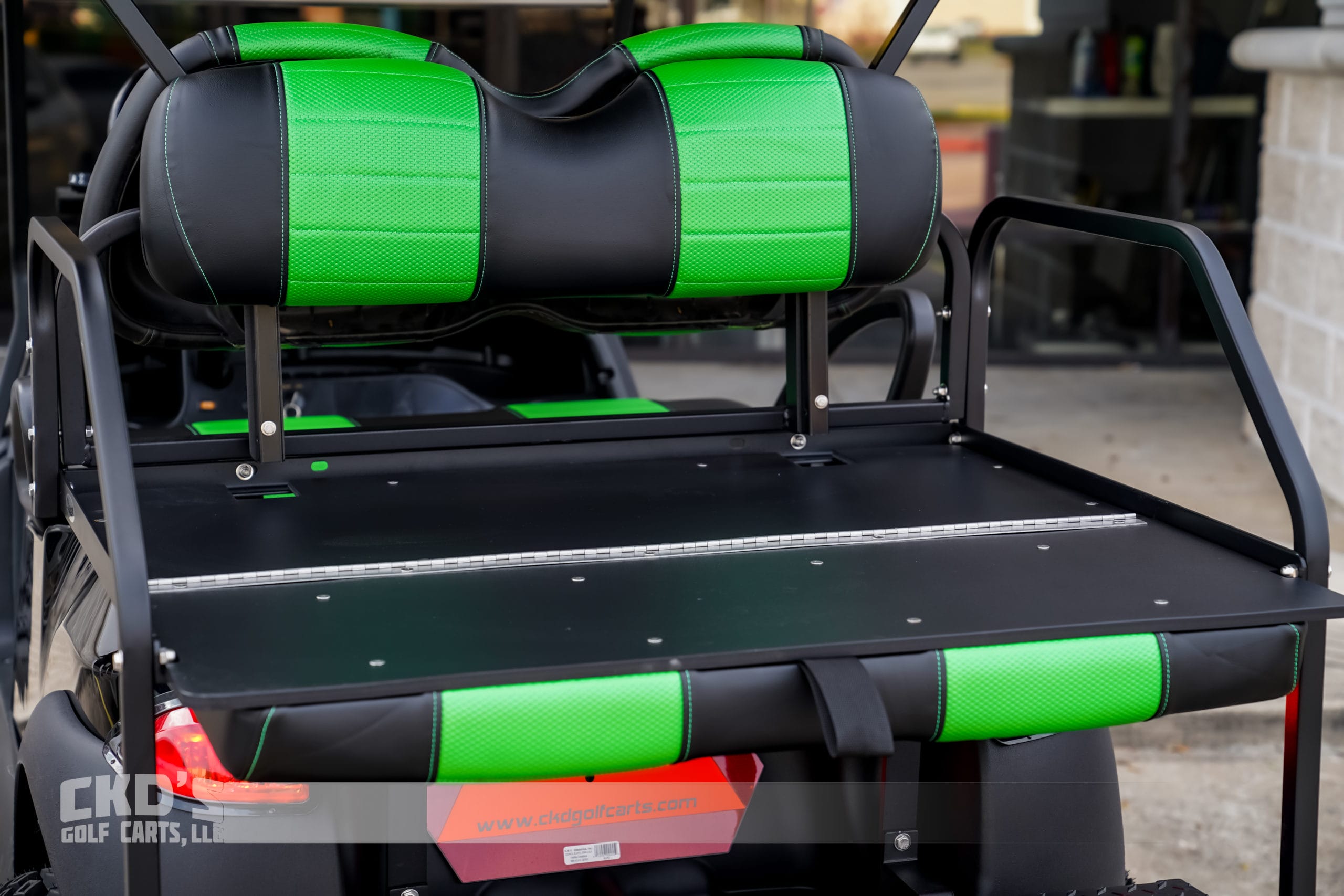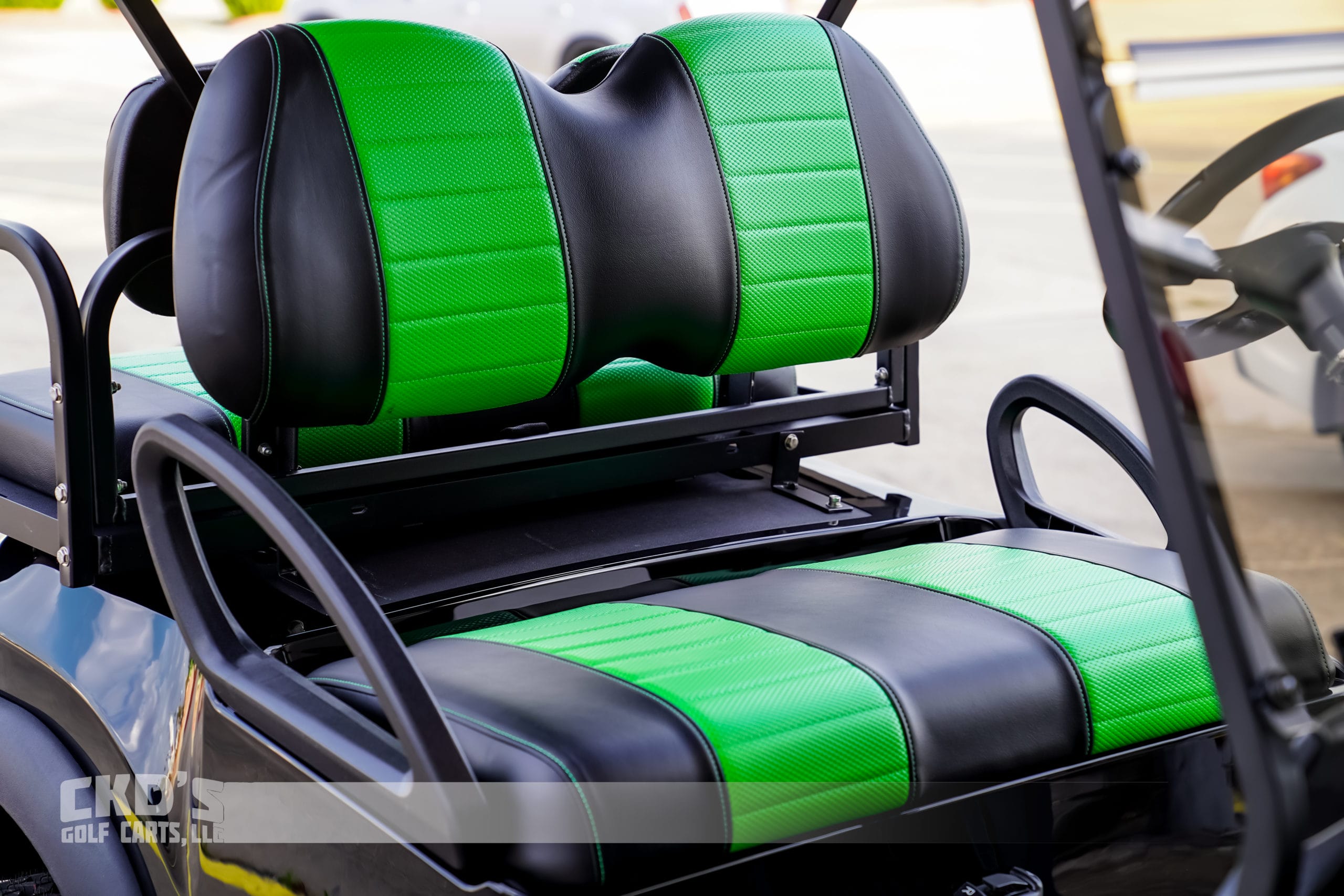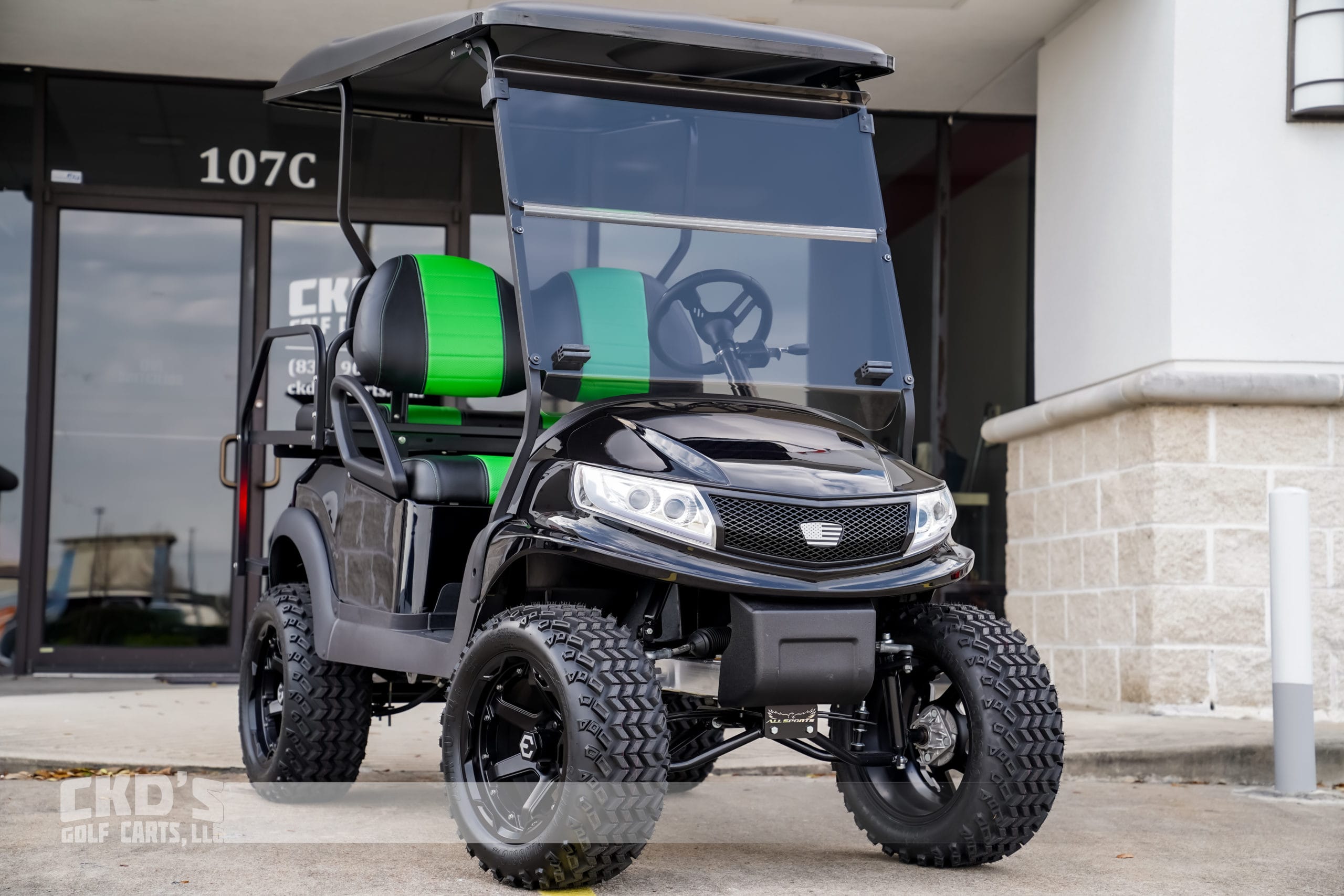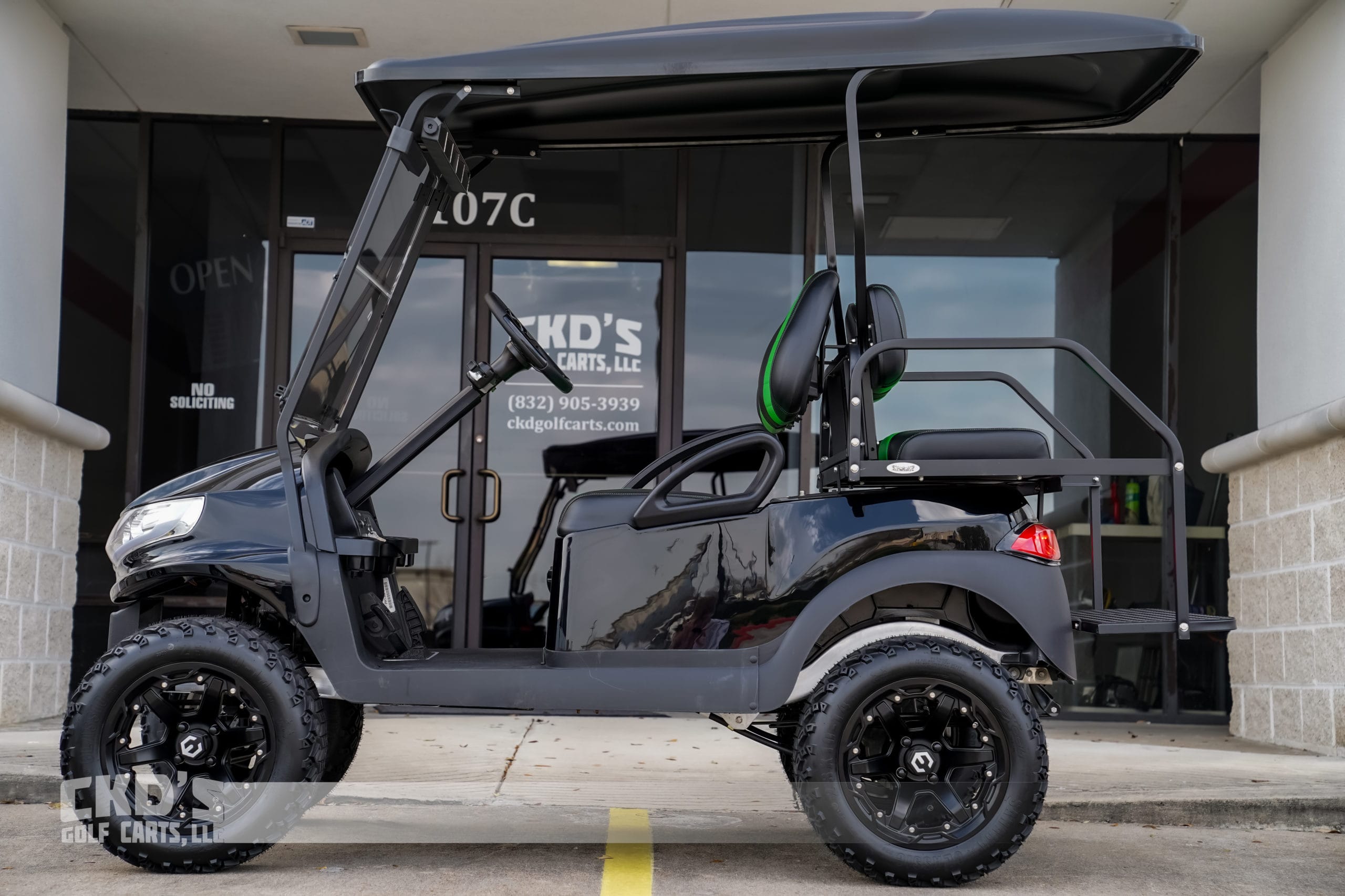 Like New Jet Black 2013 Club Car Precedent Phoenix body golf cart with brand new Trojan batteries and as with all of our carts, it has had a fresh full reconditioning service! In customizing the cart we have installed the following accessories: New Trojan T-875 batteries, new 4 gauge battery cables, high-speed code (setting #4), 6″ heavy duty USA-made All Sports A-Arm lift kit, heavy-duty rear leaf springs, newest style 14″ MODZ Gladiator wheels with the Sahara Classic 23×10-14″ tires, new Jet Black Phoenix bodies, Ultimate LED light kit (includes LED headlights, LED taillights, LED brake lights, turn signals, emergency flashers and a horn), extended 80″ blacktop with the built-in track in which we can install LED colored accent lights, new Black on Green Wave seat upholstery (super stylish), USA-made AllSports black powder coated rear flip seat with stainless hardware and “no-rust” aluminum footpan. New rubber floor mat, custom steering wheel with black hub adapter, 5-panel mirror, tinted folding non-squeak windshield and SMV sign. This cart is sweet! Ask about financing!
