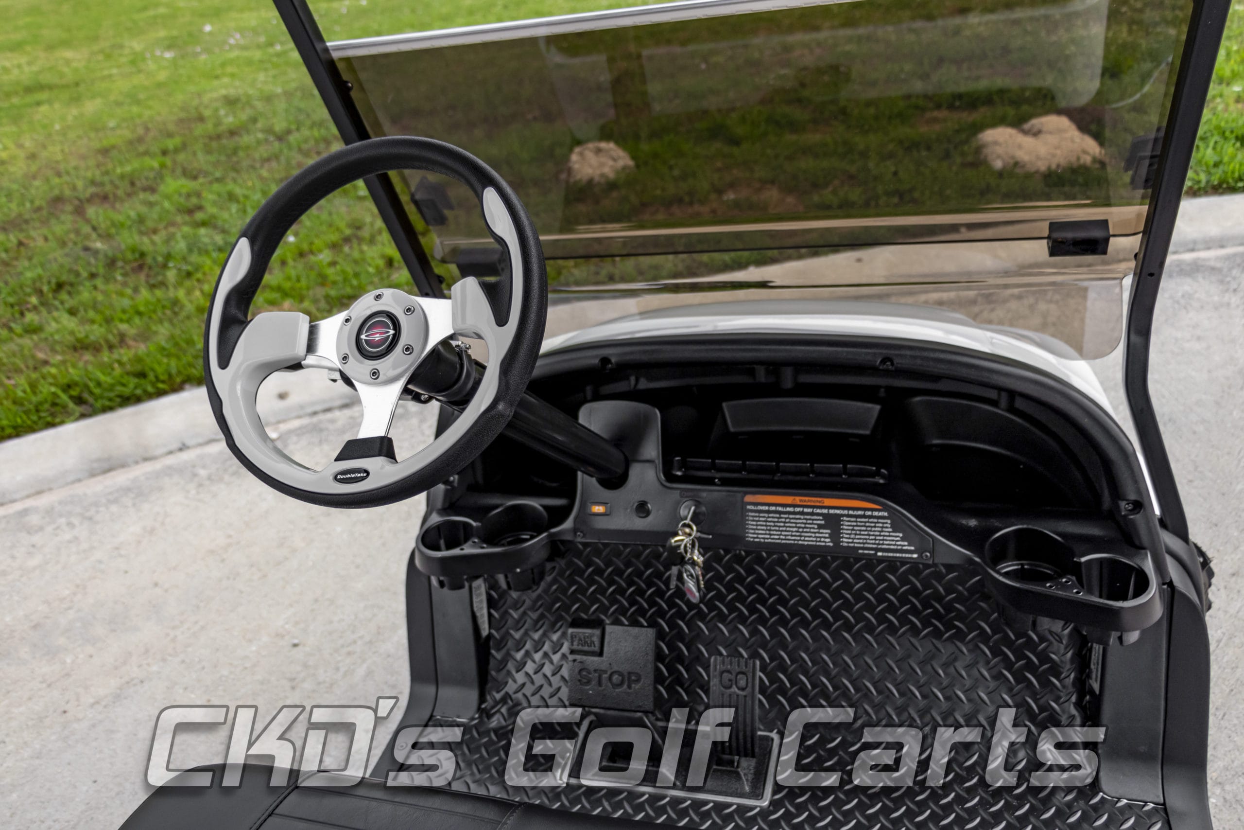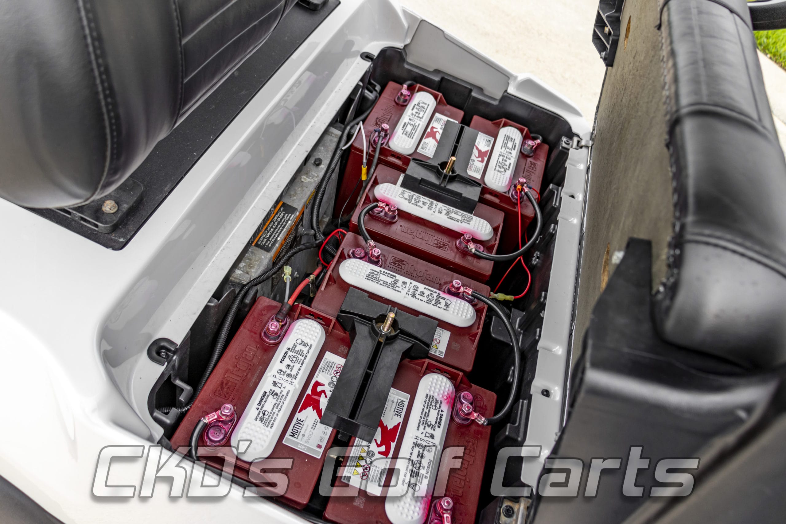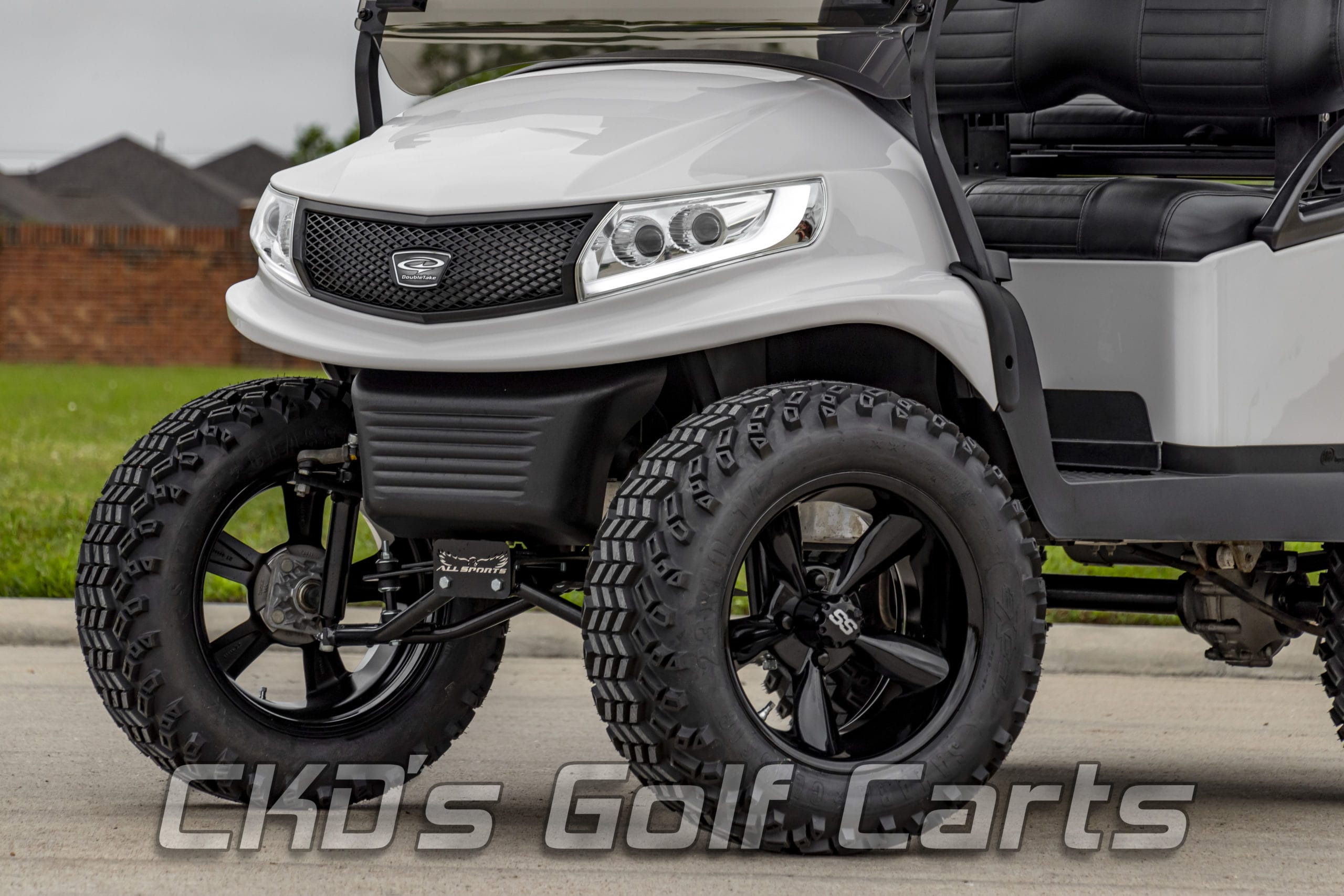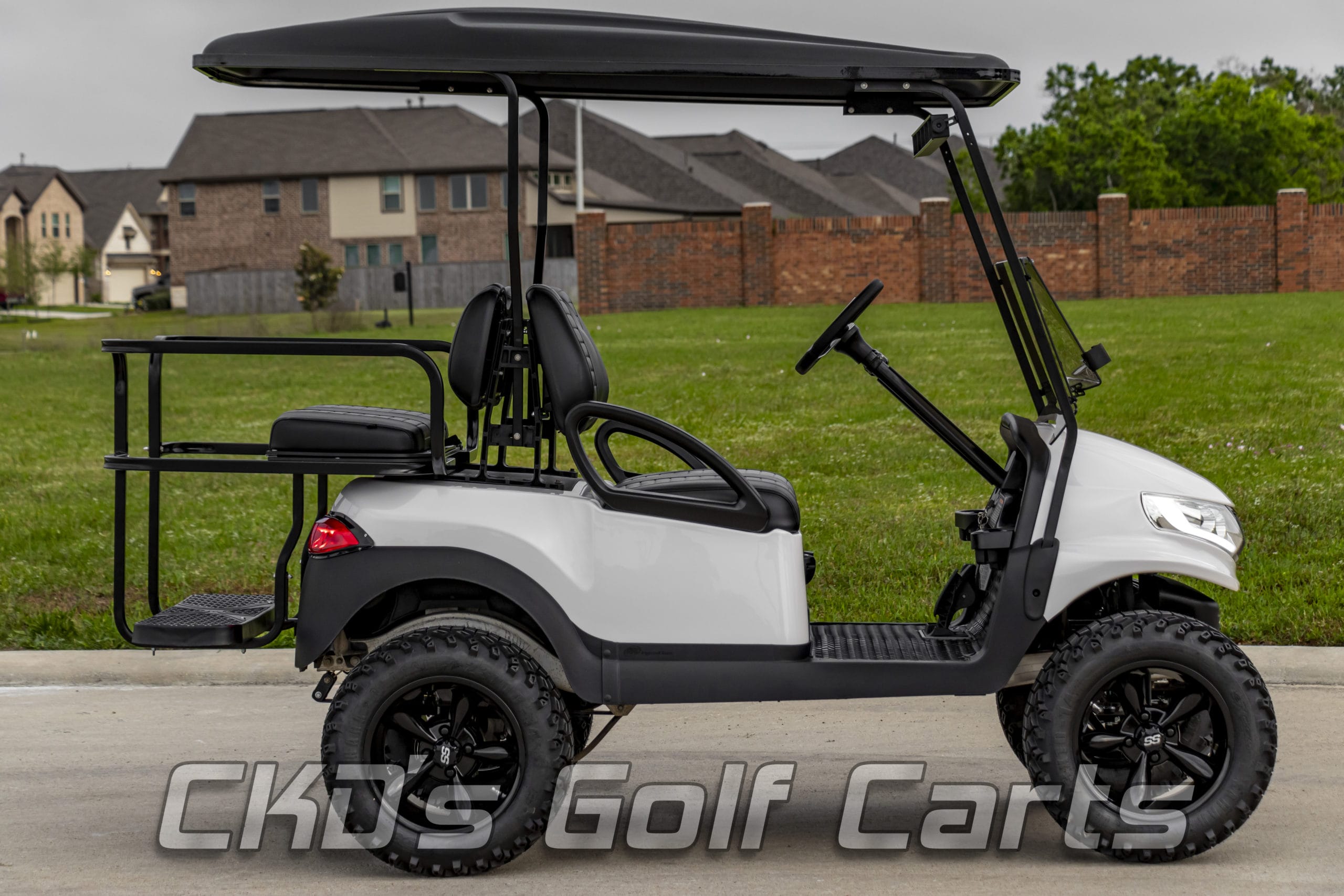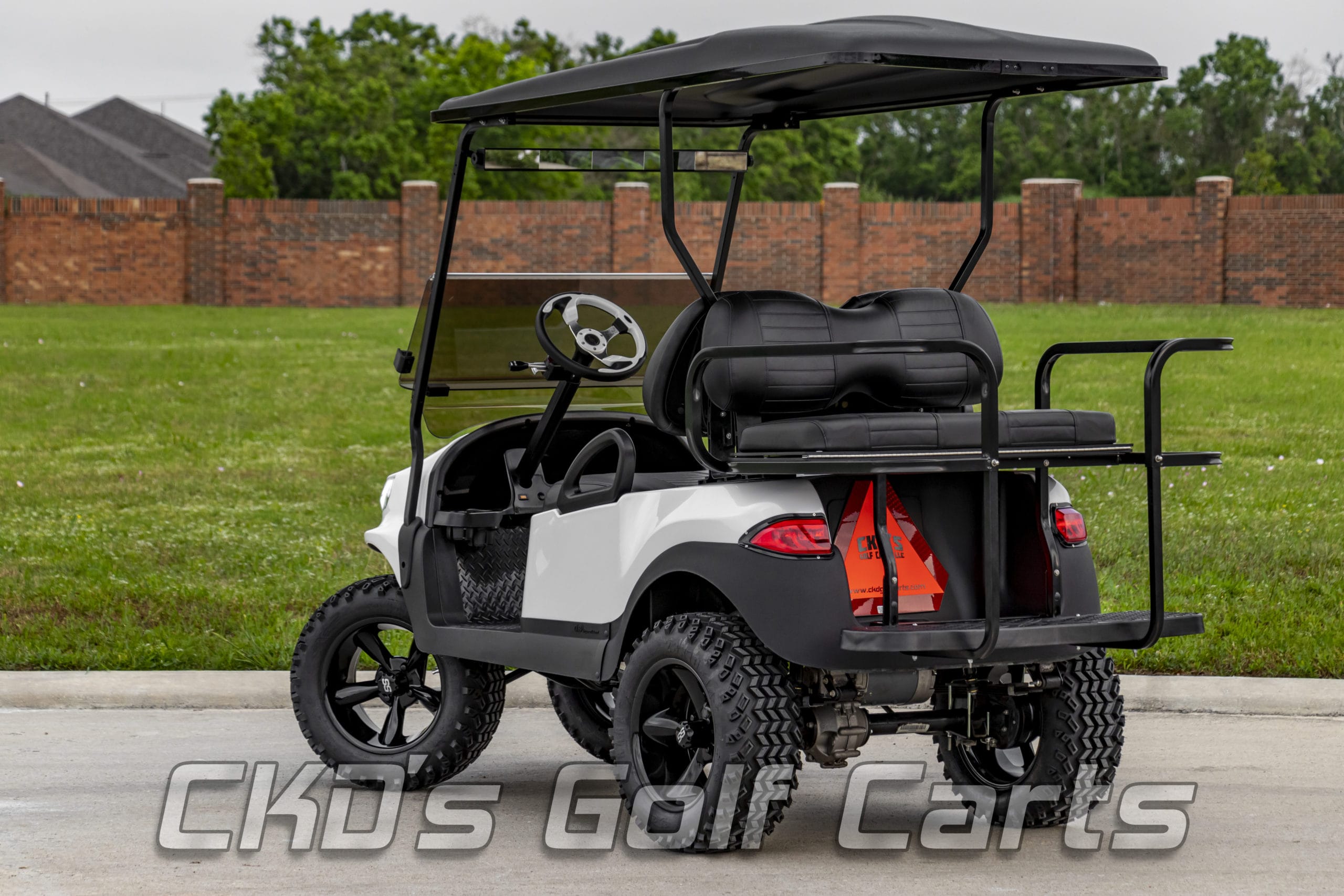 Like New Glacier White 2015 Club Car Precedent Alpha body golf cart with brand new Trojan batteries and as with all of our carts, it has had a fresh full reconditioning service! In customizing the cart we have installed the following accessories: New Trojan T-875 batteries, new 4 gauge battery cables, high-speed code (setting #4), 6″ heavy duty USA-made All Sports A-Arm lift kit, heavy-duty rear leaf springs, newest style 14″ GTW Gloss Black Godfather wheels with the Sahara Classic 23×10-14″ tires, new Glacier White Phoenix bodies, Ultimate LED light kit (includes LED headlights, LED taillights, LED brake lights, LED Daytime Running Lights, turn signals, emergency flashers, and a horn), extended 80″ blacktop with the built-in track in which we can install LED colored accent lights, new Black on Black pleated seat upholstery (super stylish), USA-made all-aluminum Guardian rear flip seat with stainless hardware and black plastic “no-rust” footpan. New black diamond plate rubber floor mat, custom steering wheel with black hub adapter and matching white inserts, 5-panel mirror, tinted folding non-squeak windshield, and SMV sign. This cart is sweet! Ask about our extended warranty package and about financing!