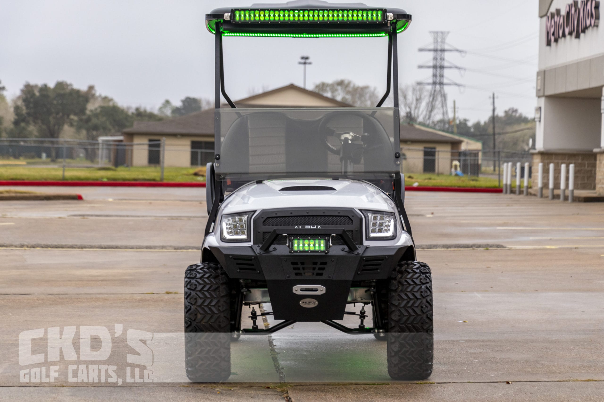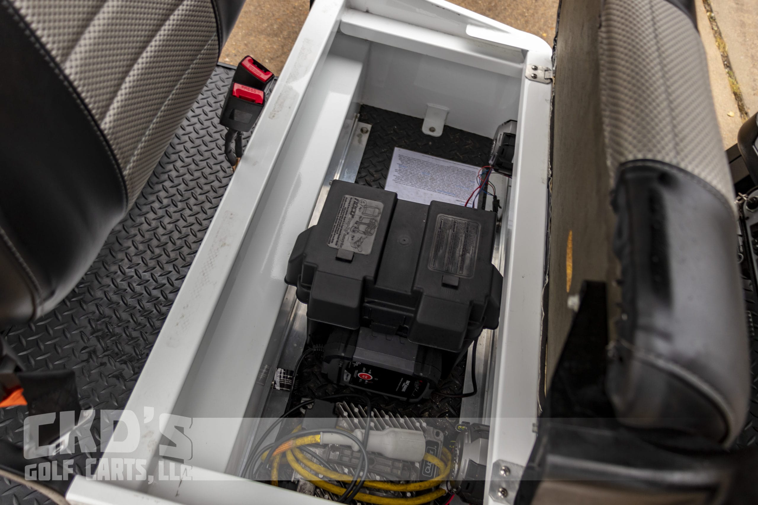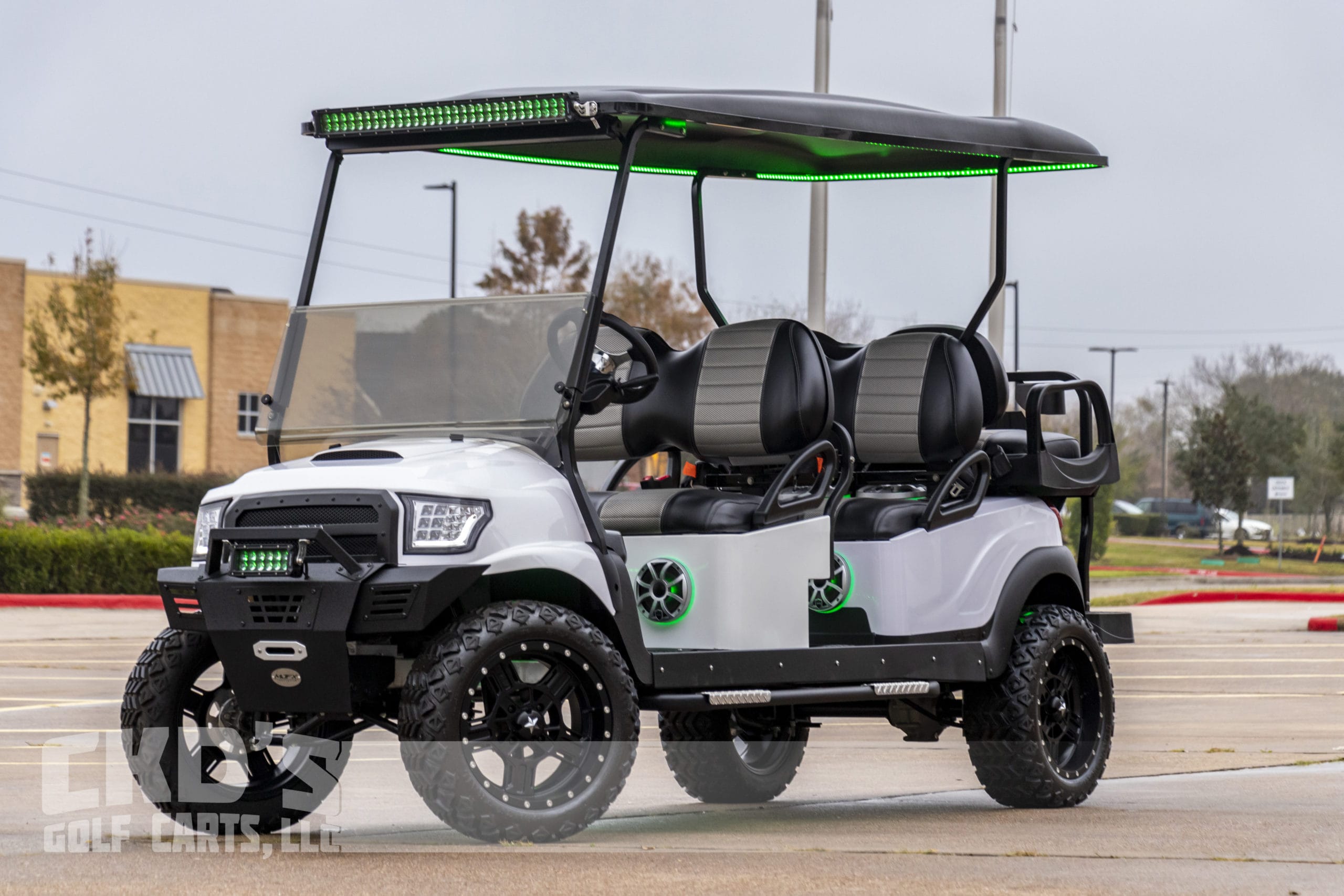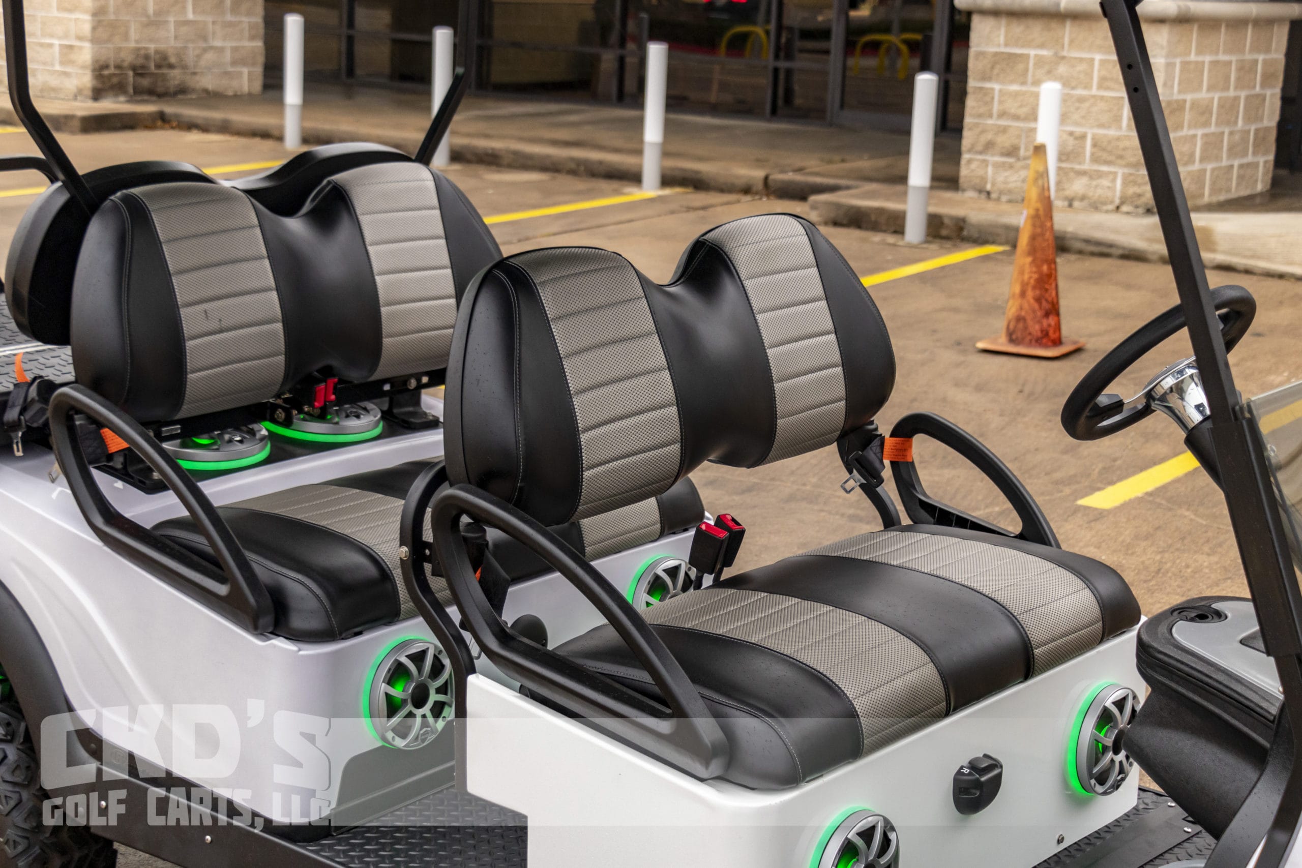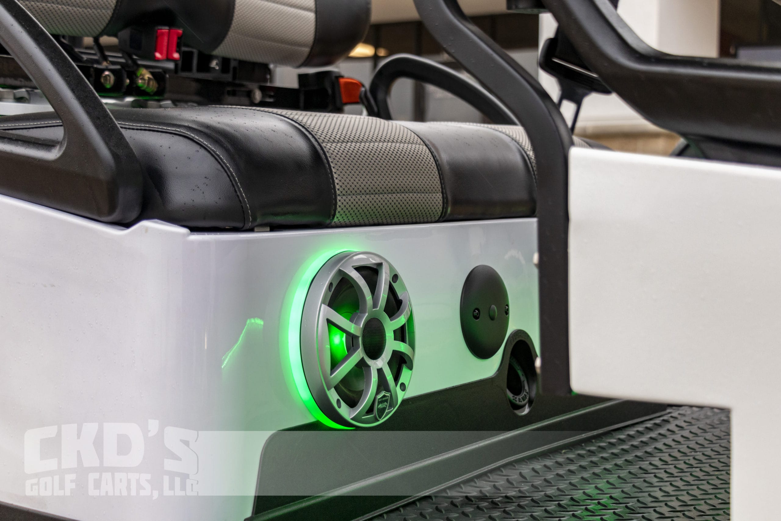 2017 Club Car Precedent, 6 Passenger stretched ‘Limo’, with new Trojan batteries! We custom-built this fine-looking machine for a customer and they barely used it! We built it with a like-new 2017 Club Car Precedent golf cart and we used the best of the best on this cart! The cart, when built, went through a fresh full reconditioning service. We installed a new 6-seater “stretch” conversion and installed the following accessories: new Trojan battery pack, high-speed code, high torque / high-speed motor, Glacier White Alpha bodies with custom front MadJax heavy-duty Alpha Armor winch-type brush guard with a 6″ RGB back-lit LED Light Bar, (can install a Warn 2000 pound remote-operated winch!), front color-matched white powder-coated seat pod with under-seat storage area, 112″ black extended top with built-in RGB LED accent lighting (change it to any color you’d like with an app on your phone.) 6″ All Sports heavy-duty USA-made A-Arm lift (for the smoothest ride!), heavy-duty rear leaf springs, super stylish 15″ MSA black wheels with 23×10-15 Black Trail tires, custom Black and Liquid Silver hand pleated seat upholstery, USA-made black Max 5 rear flip seat with stainless hardware, swivel cup-holders and black plastic (rust free) footpan! Custom-cut heavy black rubber style non-skid floor mat, RGB (color changing) accent light in the roof and underbody, Ultimate LED light kit (includes LED headlights, LED taillights and LED brake lights, turn signals, emergency flashers, daytime running lights and a horn), Wetsounds Bluetooth connection dongle, 600-watt Wetsounds HTX-6 amplifier, (4) Wetsounds Revo 6 marine speakers with color-changing RGB LED light rings, (2) Wetsounds REVO 8 speakers with RGB rings, trunk mounted 10″ powered Wetsounds AS-10 subwoofer, SMV sign and black powder coated nerf bars with diamond plate steps. This stereo system cranks super loud and sounds awesome!