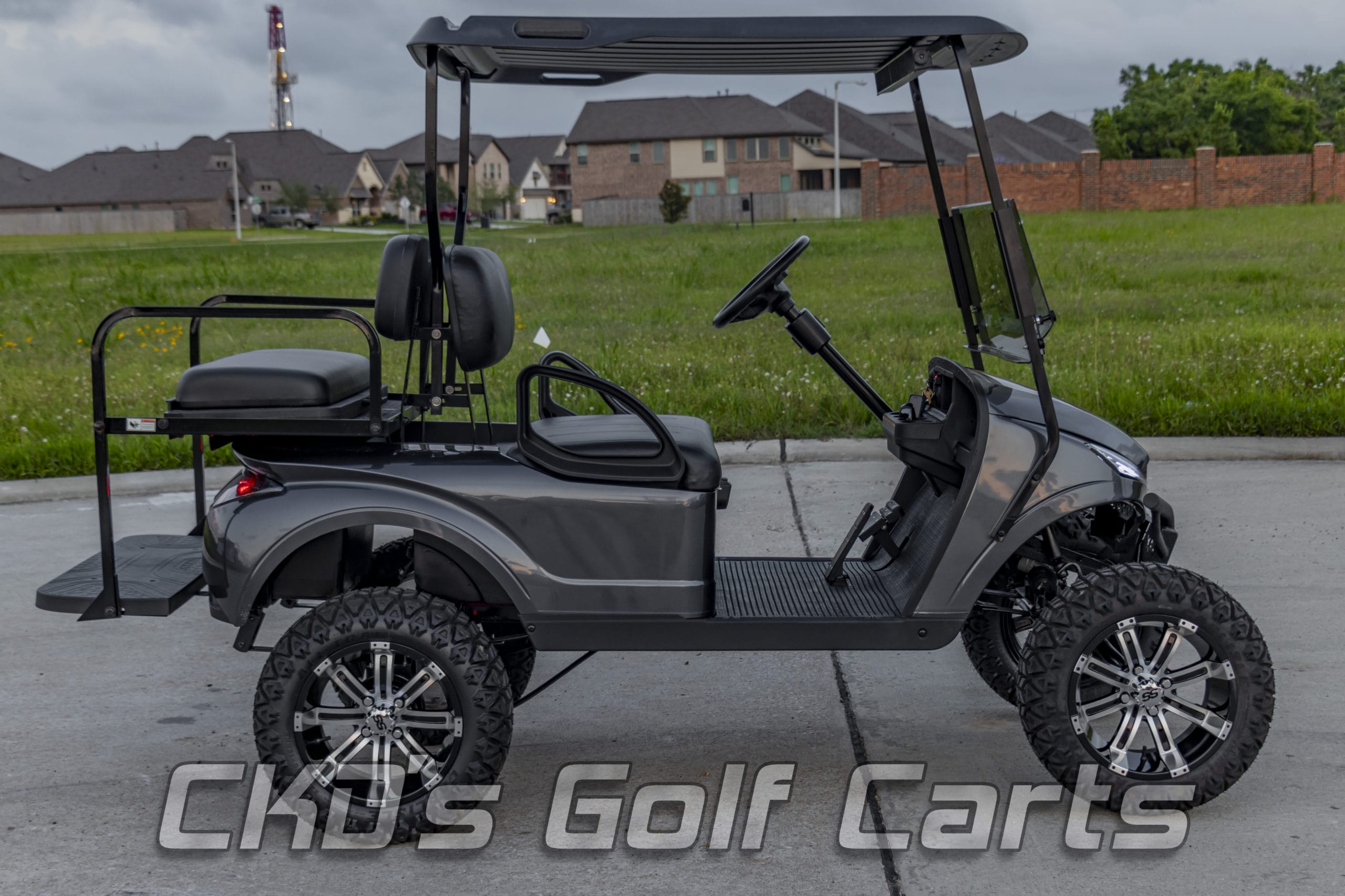 Selling a freshly refurbished 2017 EZGO TXT 48 Volt Storm body golf cart in Gun Metal Gray with 6″ lift, new US Batteries with a 1-year warranty, heavy-duty rear leaf springs, new style Storm Bodies with LED daytime running lights, LED headlights with low and high beam, horn, brake lights, turn signals, emergency flashers, 5-panel mirror, 54″ OEM blacktop, rear flip seat with under-seat storage, new Storm style brush guard, 14″ black and machined Tempest wheels with 23″ All Trail all-terrain tires, 4 gauge battery cables, high-speed program, OEM all-black upholstery, USA made tinted folding “magnetic latch” windshield, dual USB power-points, factory-style smart charger, and SMV sign.