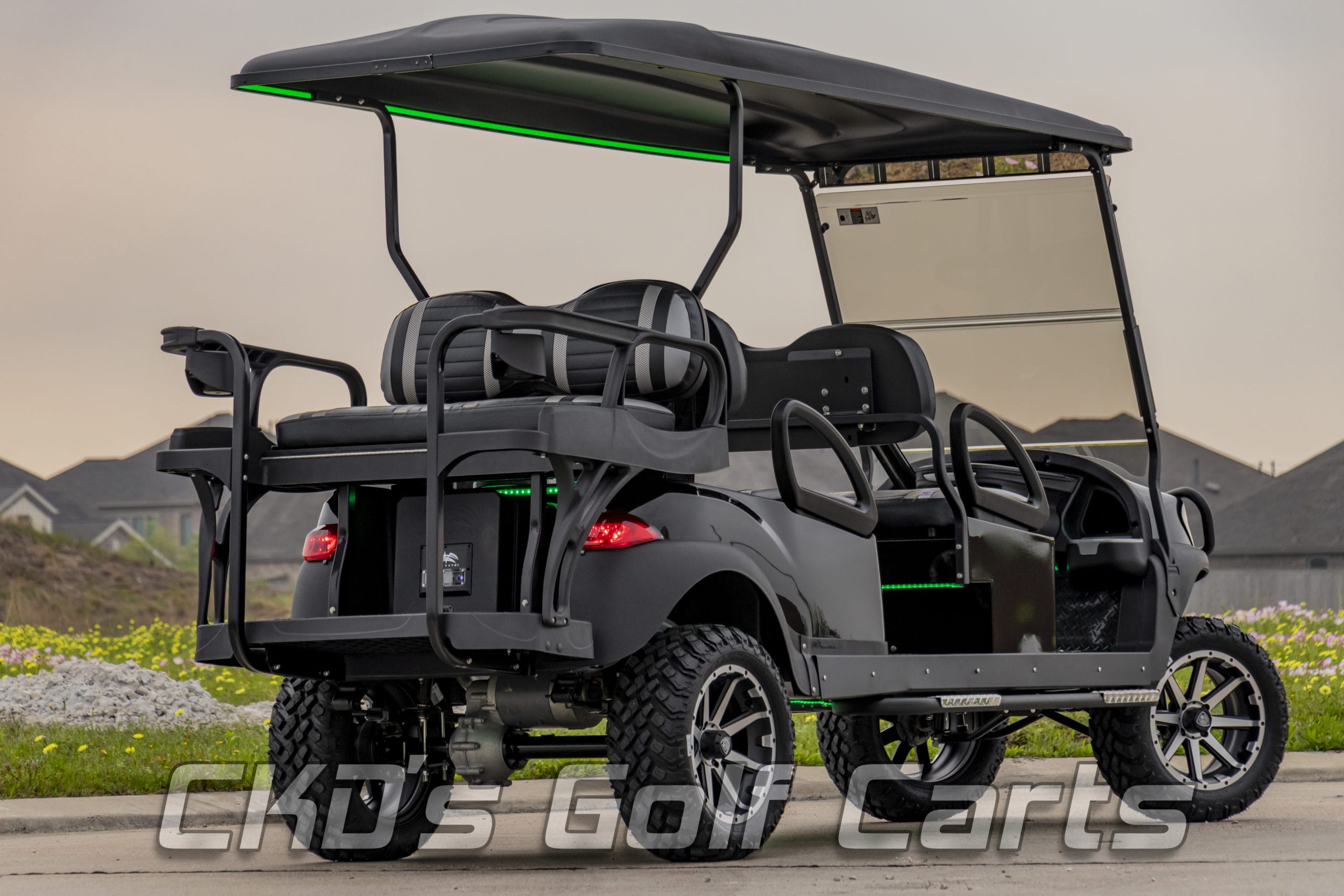 We have custom-built this fine-looking machine with a like-new 2018 Club Car Tempo golf cart and we used the best of the best on this cart! The cart has also had our fresh full reconditioning service. We’ve done a new 6-seater “stretch” conversion and installed the following accessories: new RoyPow 160 Ah Lithium-Ion battery pack with on-board charger, high speed code, high torque /high speed motor, brand new tough-looking OEM Black Tempo bodies with custom front MadJax heavy-duty Tempo winch-type brush guard (can install a Warn 2000 pound remote-operated winch!), front color-matched black powder-coated seat pod with under-seat storage area, 112″ black extended top with built-in RGB LED accent lighting (change it to any color you’d like with an app on your phone.) 6″ All Sports heavy-duty USA-made A-Arm lift (for the smoothest ride!), heavy-duty rear leaf springs, newest style 14″ Fairway Alloys Rebel machined and matte black wheels with 23×10-14 EFX Hammer tires, custom Black and Silver Extreme Striped seats, USA-made black Max 6 Helix rear flip seat (wrap-around style) with stainless hardware, swivel cup-holders and black plastic (rust free) footpad, and a combo ice chest/storage bin within the cargo deck! Custom-cut heavy black rubber style non-skid floor mat, RGB (color changing) accent light in the roof and underbody, Ultimate LED light kit (includes LED headlights, LED taillights and LED brake lights, tum signals, emergency flashers, daytime running lights, and a horn), Wetsounds Bluetooth connection dongle, 600-watt Wetsounds HTX-6 amplifier, (4) Wetsounds Revo 6 marine speakers with color-changing RGB LED light rings, (2) Wetsounds REVO 8 speakers with RGB rings, trunk­ mounted 10″ powered Wetsounds AS-10 subwoofer. This stereo system cranks super loud and sounds awesome!