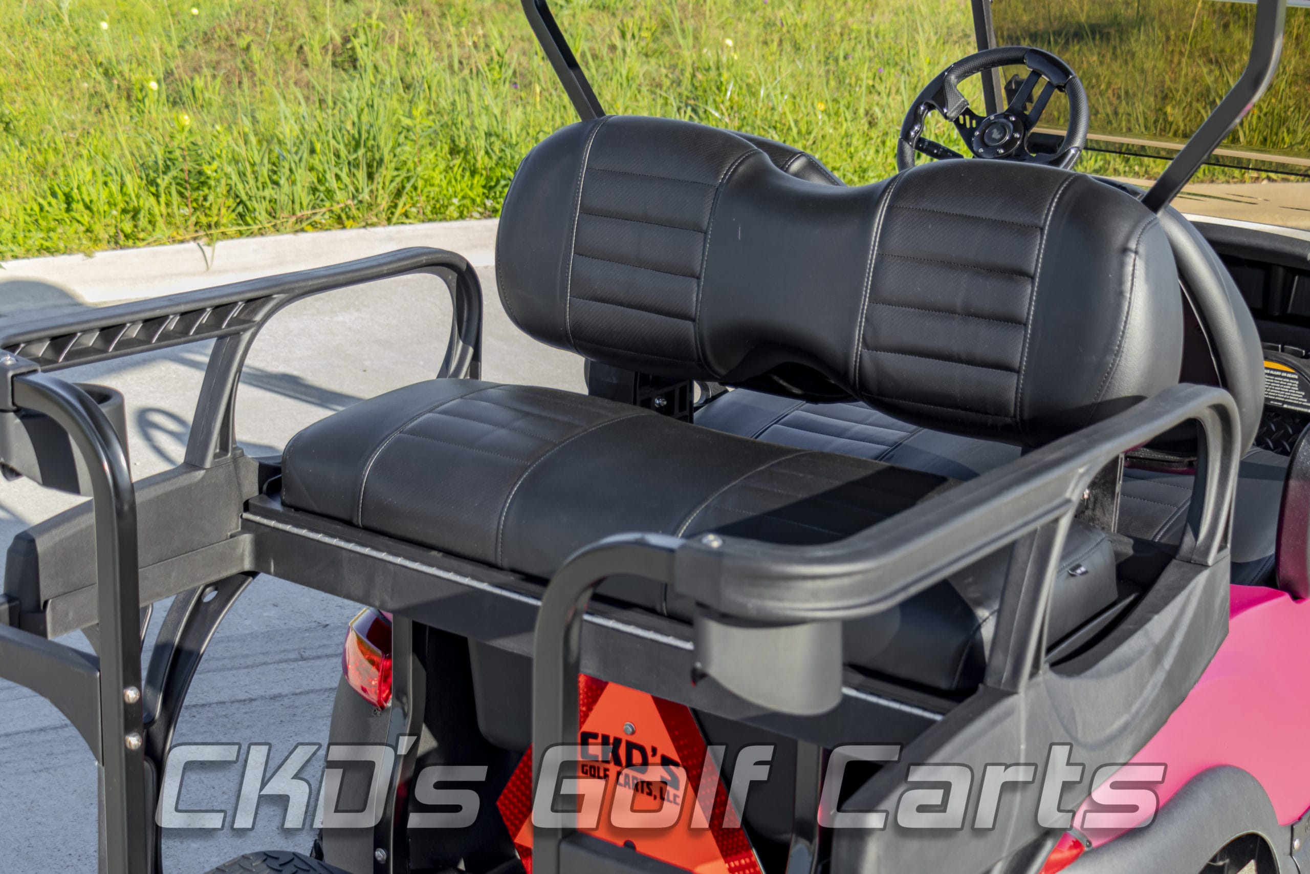 Like New Satin Pink Metallic 2018 Club Car Precedent Tempo golf cart with brand new Trojan batteries and as with all of our carts, it has had a fresh full reconditioning service! In customizing the cart we have installed the following accessories: New Trojan T-875 batteries, new 4 gauge battery cables, high-speed code (setting #4), dual USB charging ports, 6″ heavy duty USA-made All Sports A-Arm lift kit, heavy-duty rear leaf springs, newest style 14″ Rhox Gloss Black wheels with X-Trail 23×10-14″ tires, Tempo Ultimate LED light kit (includes LED headlights, LED taillights, LED brake lights, LED Daytime Running Lights, turn signals, emergency flashers, and a horn), extended 80″ black top with the built-in track in which we can install LED colored accent lights, new Black on Black Carbon pleated seat upholstery (super stylish), USA-made all-aluminum Max 6 Helix rear flip seat with stainless hardware and black plastic “no-rust” footpan. New black diamond plate rubber floor mat, custom steering wheel with black hub adapter, 5-panel mirror, tinted folding non-squeak windshield, and SMV sign. This cart is sweet! Ask about our extended warranty package and about financing!