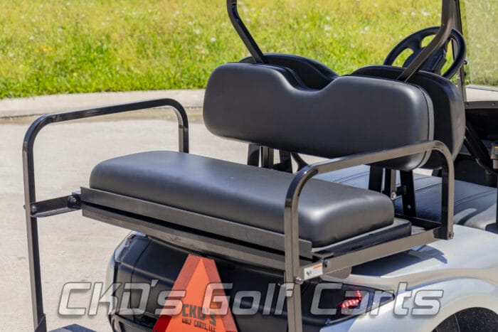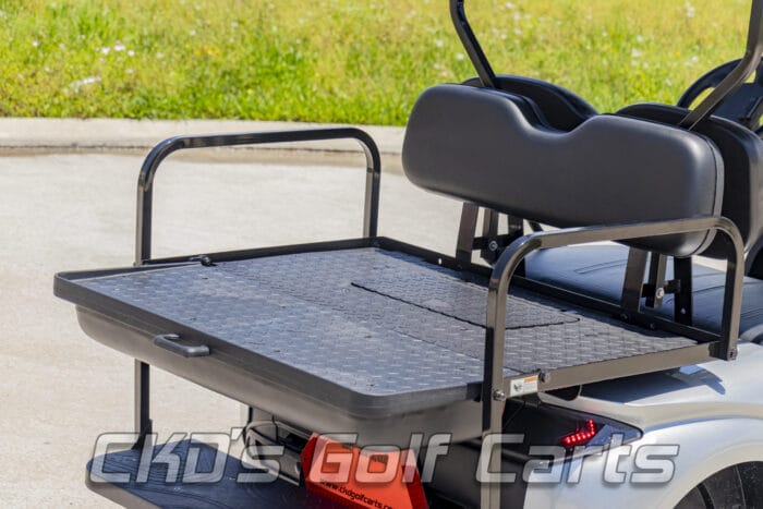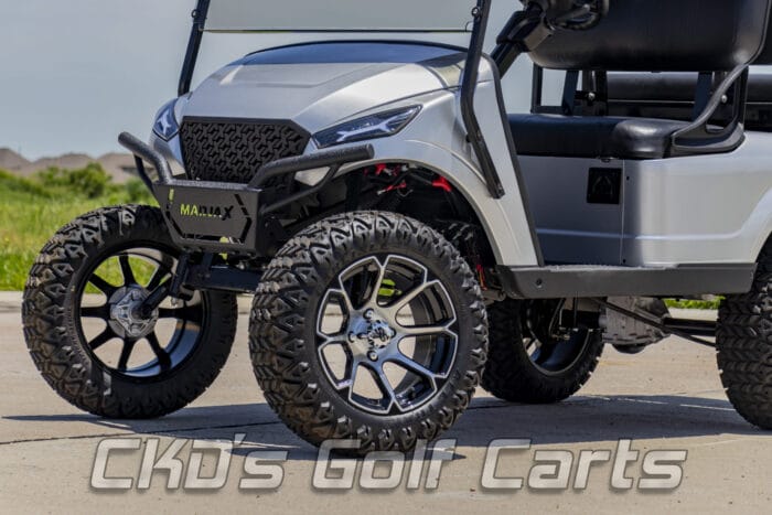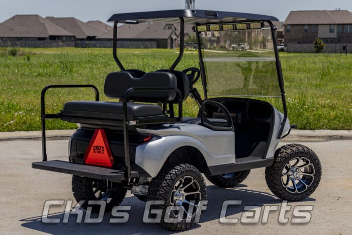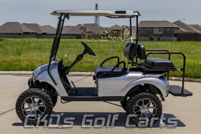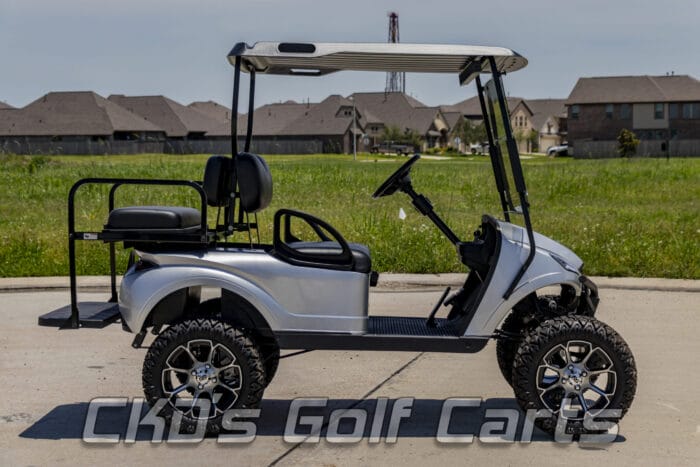Freshly Refurbished 2018 EZGO TXT 48 Volt Storm body golf cart in Silver Metallic Gray with 6″ lift, new US Batteries with a 1-year warranty, heavy-duty rear leaf springs, new style Silver Storm Bodies with LED daytime running lights, LED headlights with low and high beam, horn, brake lights, turn signals, emergency flashers, 5-panel mirror, 54″ OEM blacktop, rear flip seat with under-seat storage, new Storm style brush guard, 14″ black and machined wheels with 23″ All Trail all-terrain tires, 4 gauge battery cables, high-speed program, OEM all-black upholstery, USA made tinted folding “magnetic latch” windshield, dual USB power-points, factory-style smart charger, and SMV sign