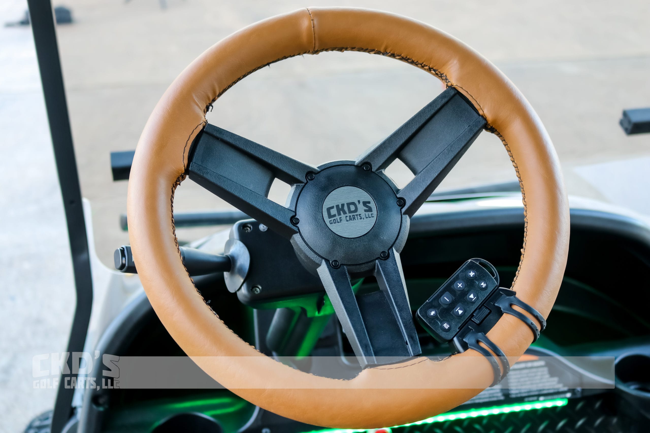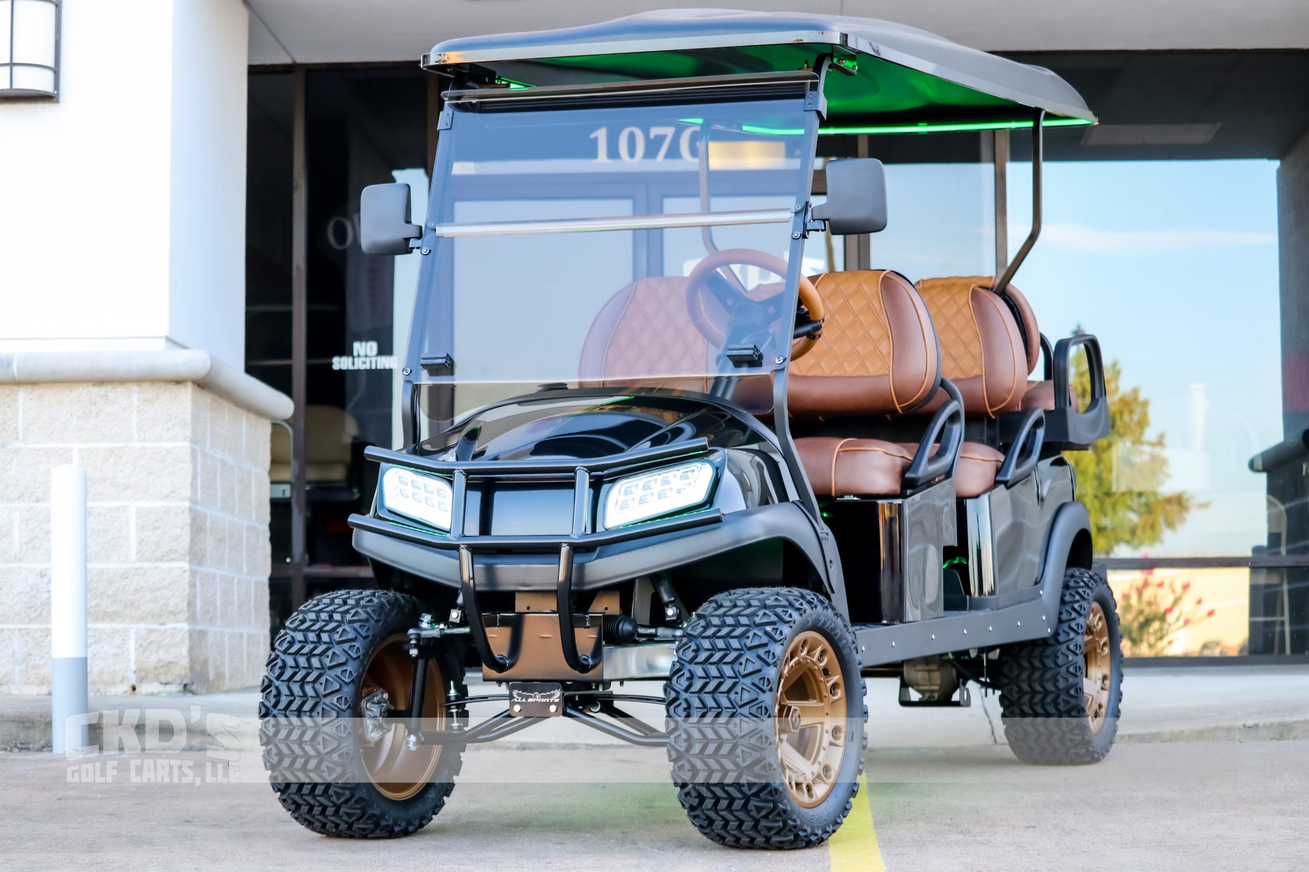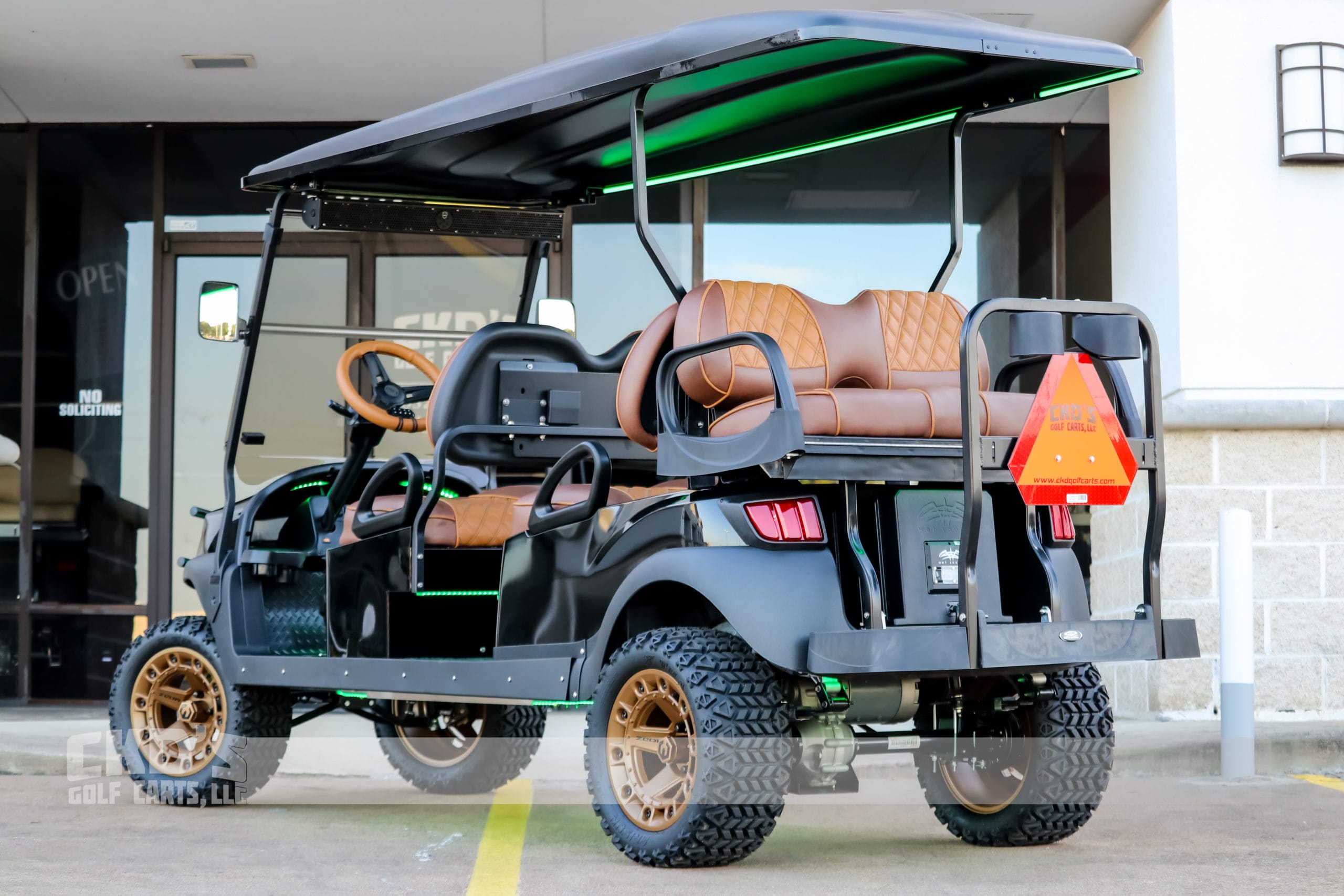 We have custom-built this fine-looking machine with a like-new 2019 Club Car Tempo golf cart and we used the best of the best on this cart! The cart has also had our fresh full reconditioning service. We’ve done a new 6-seater “stretch” conversion and installed the following accessories: new Trojan battery pack, high speed code, high torque /high speed motor, custom painted tough-looking Jet Black Tempo bodies, heavy-duty Tempo brush guard, front color-matched painted seat pod with under-seat storage area, 112″ black extended top with a track that we installed built-in Plashlights RGB LED accent lighting plus underbody RGB LED lights (change it to any color you’d like with an app on your phone), 6″ All Sports heavy-duty USA-made A-Arm lift (for the smoothest ride!), heavy-duty rear leaf springs, newest style 14” matte bronze (newest style) MODZ Defender wheels with 23×10-14 AriSun tires, uncommon key (so no one steals your ride!), RGB rocker switch, custom steering wheel with seat color matched trim, custom seat upholstery in saddle brown and King Ranch Brown double diamond stitching, USA-made black Max 5 rear flip seat with stainless hardware, swivel cup-holders and black plastic (rust free) footpan! Custom-cut heavy black rubber Diamond plate style non-skid floor mat, tinted folding “non-squeak” windshield, side view mirrors, Ultimate LED light kit (includes LED headlights, LED taillights and LED brake lights, tum signals, emergency flashers, daytime running lights and a horn), Wetsounds Stealth 10 Ultra Bluetooth Soundbar and we installed a trunk mounted 10″ powered Wetsounds AS-10 subwoofer (to give you some bump in your trunk!), huge AGM auxiliary battery system to power the 12 volt accessories and SMV sign. This stereo system sounds awesome and the cart is beautiful!