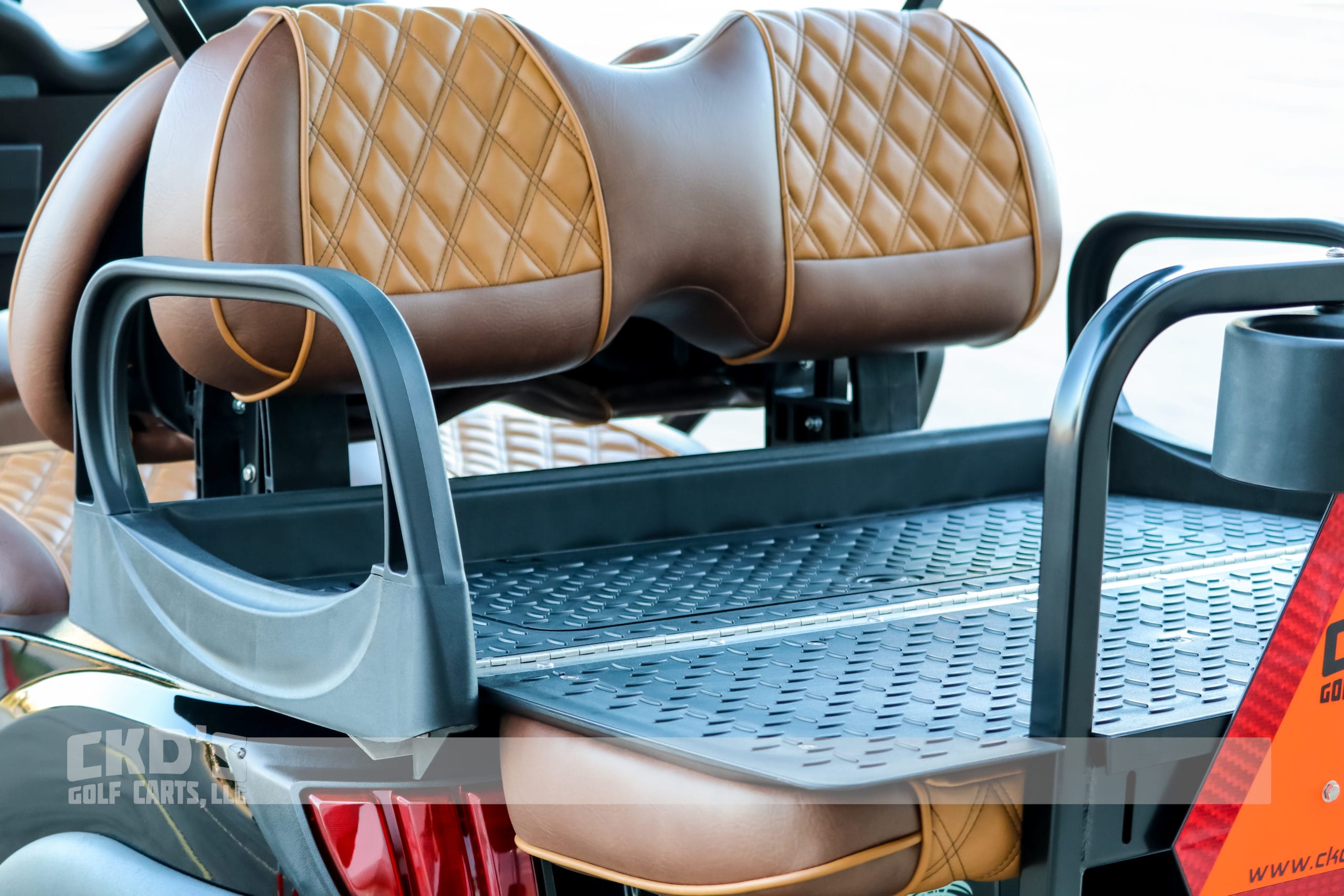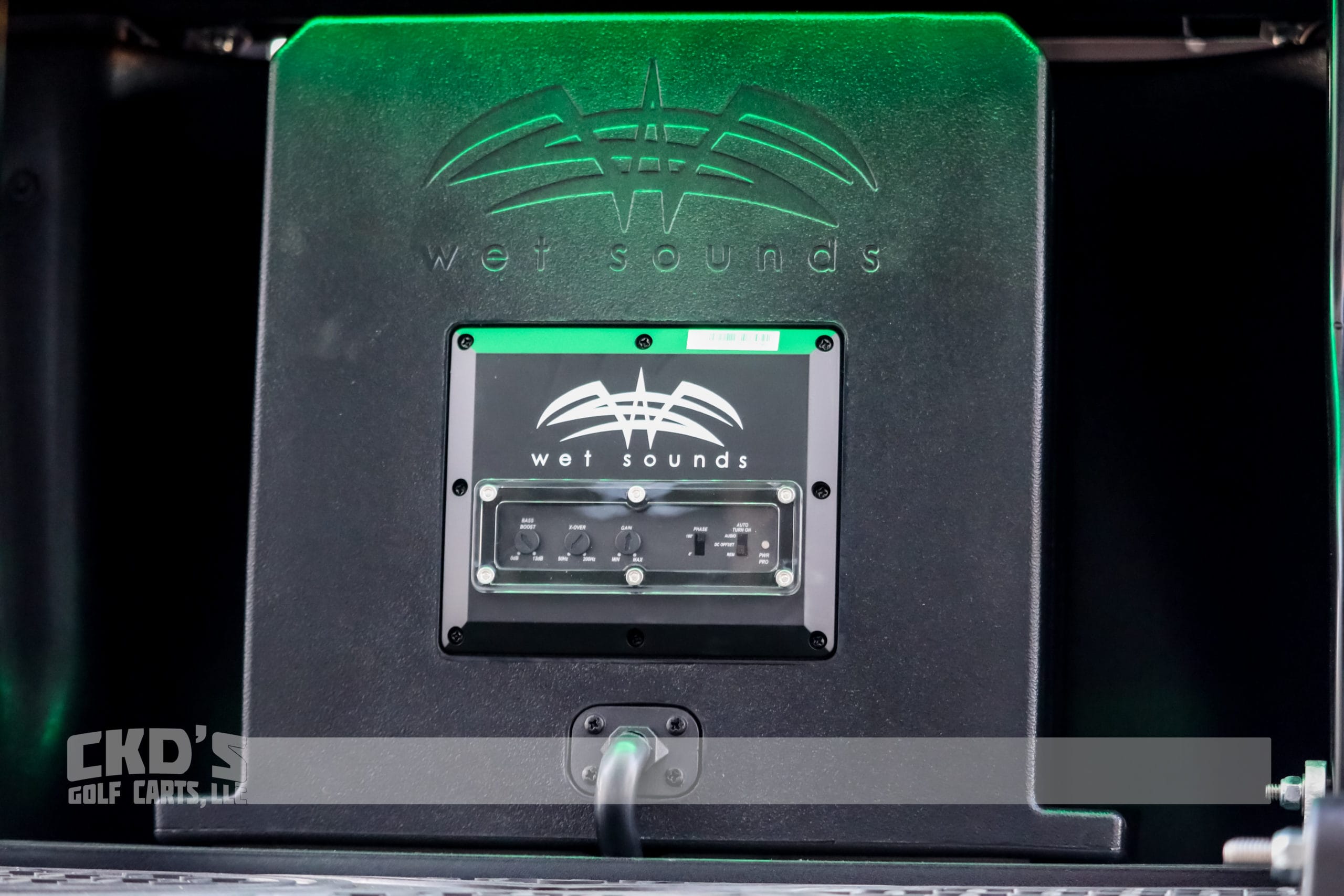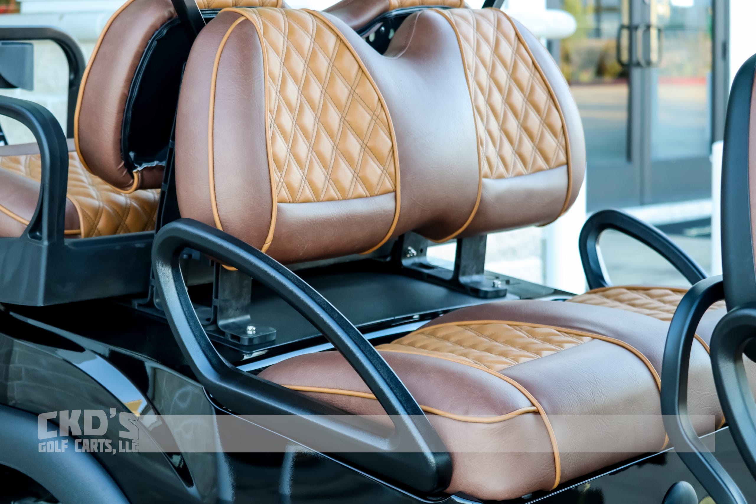 We have custom-built this fine-looking machine with a like-new 2019 Club Car Tempo golf cart and we used the best of the best on this cart! The cart has also had our fresh full reconditioning service. We’ve done a new 6-seater “stretch” conversion and installed the following accessories: new Trojan battery pack, high speed code, high torque /high speed motor, custom painted tough-looking Jet Black Tempo bodies, heavy-duty Tempo brush guard, front color-matched painted seat pod with under-seat storage area, 112″ black extended top with a track that we installed built-in Plashlights RGB LED accent lighting plus underbody RGB LED lights (change it to any color you’d like with an app on your phone), 6″ All Sports heavy-duty USA-made A-Arm lift (for the smoothest ride!), heavy-duty rear leaf springs, newest style 14” matte bronze (newest style) MODZ Defender wheels with 23×10-14 AriSun tires, uncommon key (so no one steals your ride!), RGB rocker switch, custom steering wheel with seat color matched trim, custom seat upholstery in saddle brown and King Ranch Brown double diamond stitching, USA-made black Max 5 rear flip seat with stainless hardware, swivel cup-holders and black plastic (rust free) footpan! Custom-cut heavy black rubber Diamond plate style non-skid floor mat, tinted folding “non-squeak” windshield, side view mirrors, Ultimate LED light kit (includes LED headlights, LED taillights and LED brake lights, tum signals, emergency flashers, daytime running lights and a horn), Wetsounds Stealth 10 Ultra Bluetooth Soundbar and we installed a trunk mounted 10″ powered Wetsounds AS-10 subwoofer (to give you some bump in your trunk!), huge AGM auxiliary battery system to power the 12 volt accessories and SMV sign. This stereo system sounds awesome and the cart is beautiful!