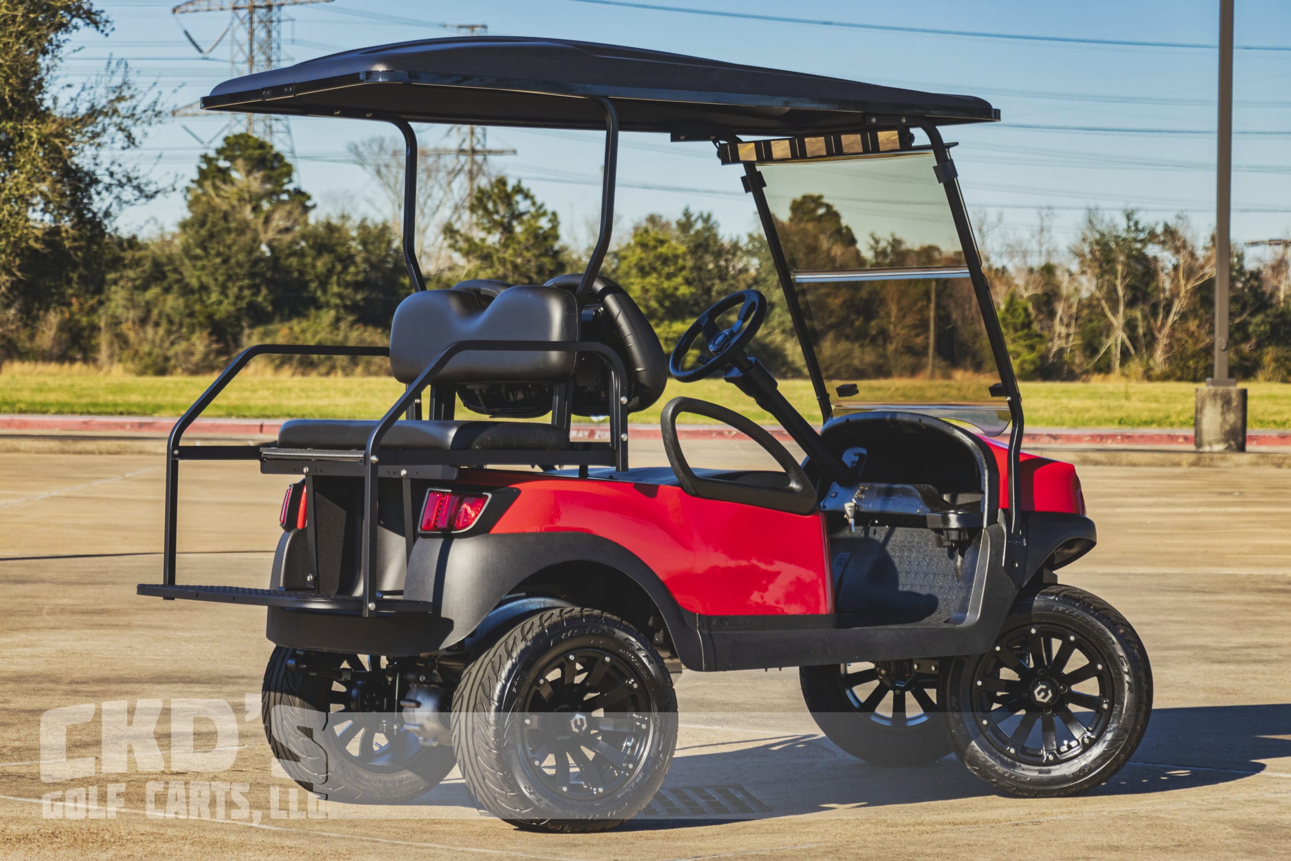 2020 Club Car Tempo with the new US 8 volt battery pack! We have custom-built this fine-looking machine with a like-new 2020 Club Car Tempo golf cart! The cart has also had our fresh full reconditioning service. We’ve installed the following accessories: new US 8 volt battery pack, high speed code, custom painted tough-looking Ferrari Red painted Tempo bodies, 6″ All Sports heavy-duty USA-made A-Arm lift (for the smoothest ride!), heavy-duty rear leaf springs, newest style 14″ black MODZ wheels with 23×10-14 Fusion street tires, black OEM seat upholstery, USA Made All-Sports Aluminum Rear flip seat (can add swivel cup-holders), tinted folding “non-squeak” windshield, 5 panel rear view mirror, Ultimate LED light kit (includes LED headlights, LED taillights and LED brake lights, tum signals, emergency flashers, daytime running lights and a horn), carbon fiber dash kit with locking glove box, state of charge meter and SMV sign.