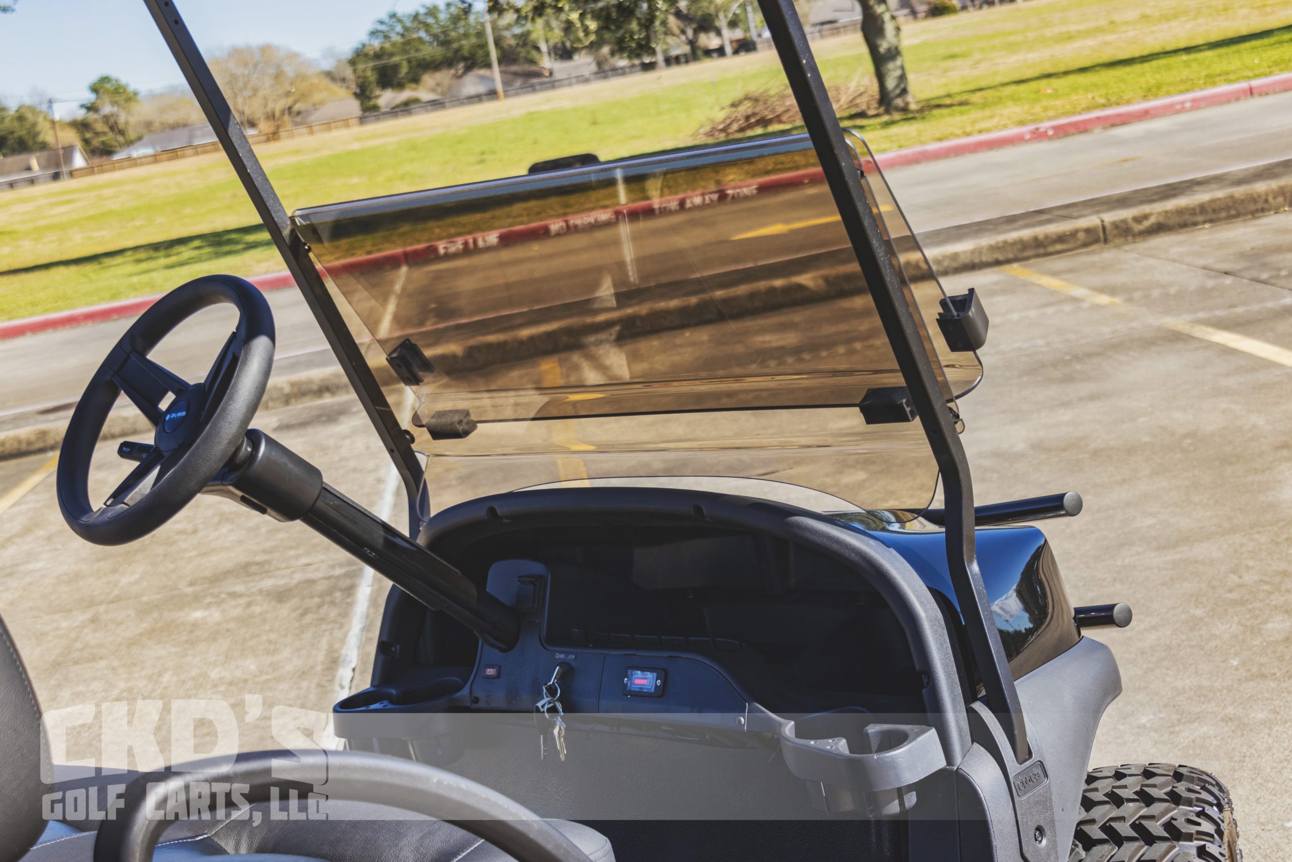 2020 Club Car Tempo with the new RoyPow 105Ah Lithium battery pack! (There are many advantages to a lithium battery pack, several of which are: No maintenance required (no batteries to fill with water), no corrosion, no acid leaking onto the floor or smelling up the garage, extended run-time (up to 40 miles on a charge!), super-fast charge time (2 to 4 hours total) and a 5-year battery pack warranty with an expected lifespan of 10 to 15 years!). We have custom-built this fine-looking machine with a like-new 2020 Club Car Tempo golf cart! The cart has also had our fresh full reconditioning service. We’ve installed the following accessories: new RoyPow 105Ah battery pack with state of charge meter and on-board charger, high speed code, custom painted tough-looking Jet Black Tempo bodies, 6″ All Sports heavy-duty USA-made A-Arm lift (for the smoothest ride!), heavy-duty rear leaf springs, newest style 14″ black Vampire wheels with 23×10-14 Sierra Classic tires, new black Veranda style custom seats, USA Made Max 5 Rear flip seat with black powder coated aluminum and plastic frame and “no-rust plastic footpan, (with swivel cup-holders), tinted folding “non-squeak” windshield, 5 panel rear view mirror, Ultimate LED light kit (includes LED headlights, LED taillights and LED brake lights, tum signals, emergency flashers, daytime running lights and a horn), state of charge meter and SMV sign.