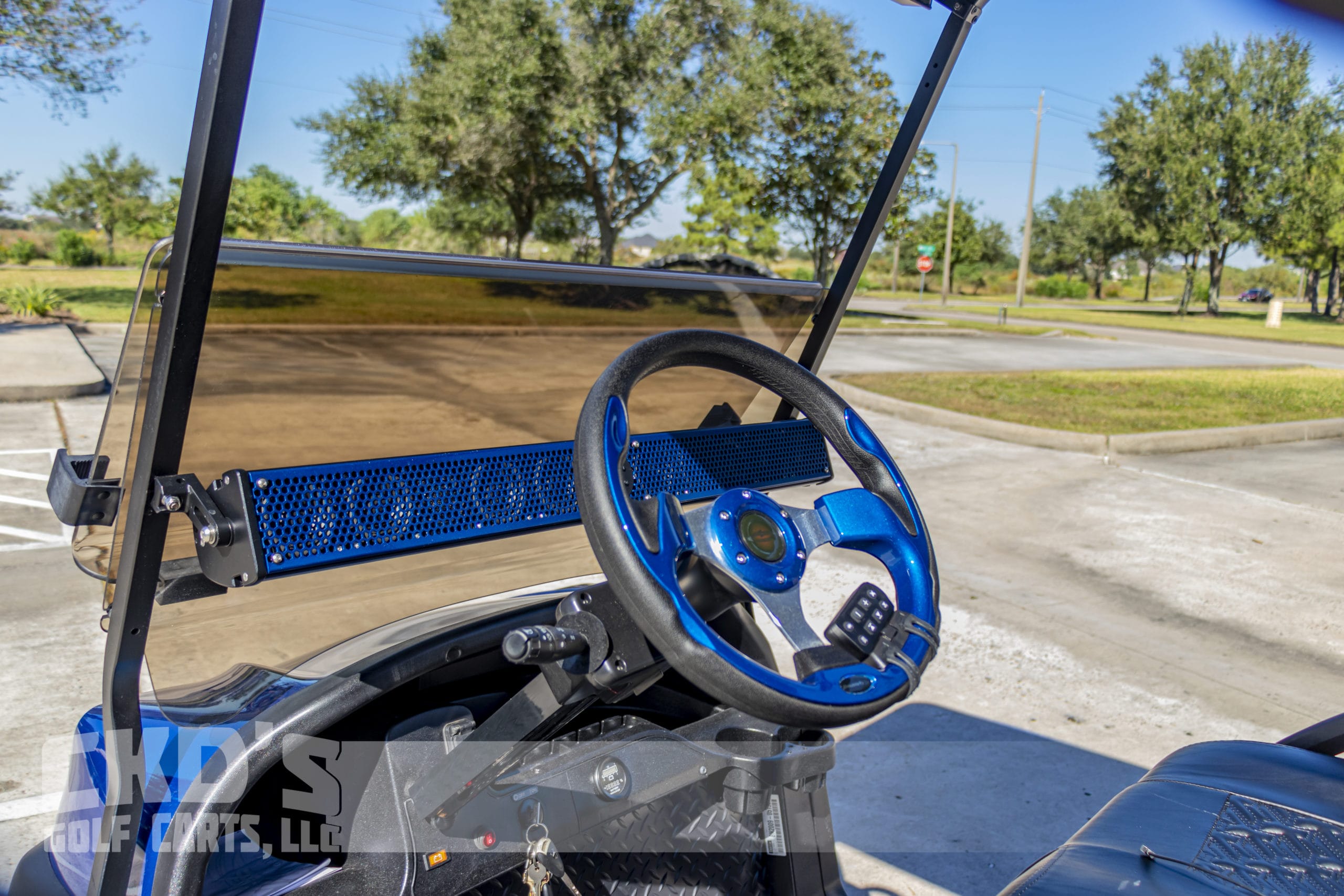 We have custom-built this fine-looking machine with a like-new 2020 Club Car Tempo golf cart and we used the best of the best on this cart! The cart has also had our fresh full reconditioning service. We’ve done a new 6-seater “stretch” conversion and installed the following accessories: new Evolution 180 Ah Lithium-Ion battery pack with on-board charger and state of charge meter, high speed code, high torque /high speed motor, custom painted tough-looking OEM Ford lightning Blue Tempo bodies, (can install a custom front MadJax heavy-duty Tempo winch-type brush guard with a Warn 2000 pound remote-operated winch!), front color-matched painted seat pod with under-seat storage area, 112″ black extended top with a track that we can install built-in RGB LED accent lighting (change it to any color you’d like with an app on your phone.) 6″ All Sports heavy-duty USA-made A-Arm lift (for the smoothest ride!), heavy-duty rear leaf springs, newest style 15″ MSA M31 Lok 2 matte black wheels with 23×10-15 Black Trail tires and custom painted body color matched bead lock rings, custom MadJax Tuxedo Executive seats, USA-made black Max 5 rear flip seat with stainless hardware, swivel cup-holders and black plastic (rust free) footpan with a combo ice chest/storage bin within the cargo deck! Custom-cut heavy black rubber style non-skid floor mat, tinted folding “non-squeak” windshield, overhead 5-panel mirror, Ultimate LED light kit (includes LED headlights, LED taillights and LED brake lights, tum signals, emergency flashers, daytime running lights, and a horn), Wetsounds Stealth 10 Ultra Bluetooth Soundbar with body-color-matched grill and we can install a trunk mounted 10″ powered Wetsounds AS-10 subwoofer to give you some bump in your trunk! This stereo system sounds awesome!