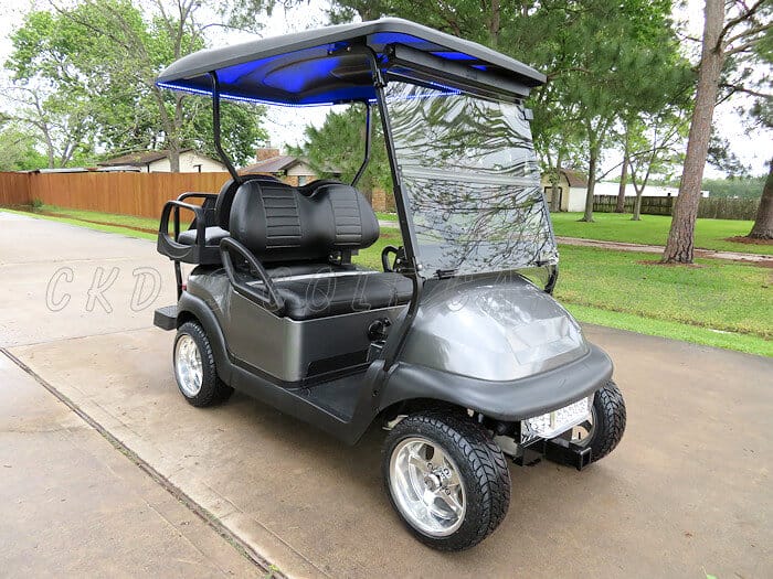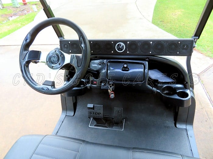 Custom built 2015 Club Car Precedent gas golf cart with the newer style Subaru fuel injected gas engine! Like all of our carts, this cart has had our fresh full reconditioning service, and the following accessories have been installed: heavy duty rear leaf springs, 12″ Polished Rallye wheels with low profile tires, Charcoal Grey Metallic OEM style bodies, 80″ black extended top with built-in Blue LED’s in the track, USA-made Max 5 rear flip seat with stainless hardware, unique built-in combination concealed ice chest/storage box under the seat, and black plastic (rust free) footpan and rear safety bar! Ultimate LED light kit (includes LED headlights, LED taillights and LED brake lights, turn signals, emergency flashers; and a horn), tinted folding windshield, 5-panel mirror, custom Black and Black Carbon Fiber Wave hand-pleated upholstery (we can add matching rear seat armrest/cup holders), carbon fiber dash with locking glove box, Powerbass XL-1000 10-speaker Bluetooth sound bar, custom black and carbon fiber steering wheel with black hub adapter, pre-wired for LED light bar and colored LED underbody lights, front hitch receiver, and slow moving vehicle (SMV) sign. This cart is sweet!