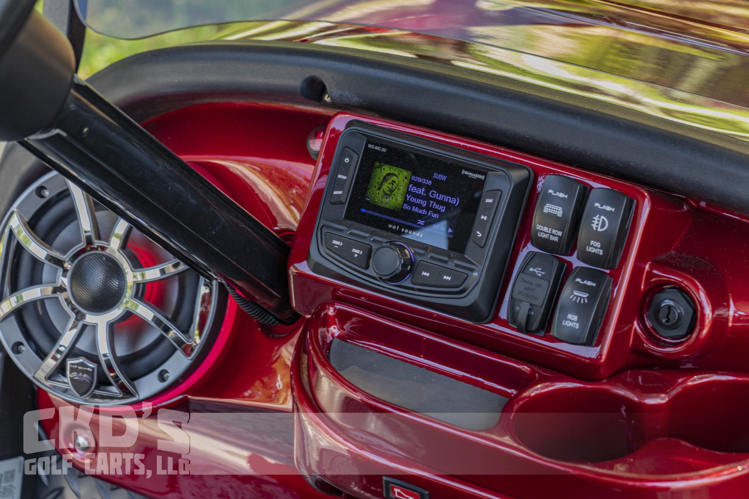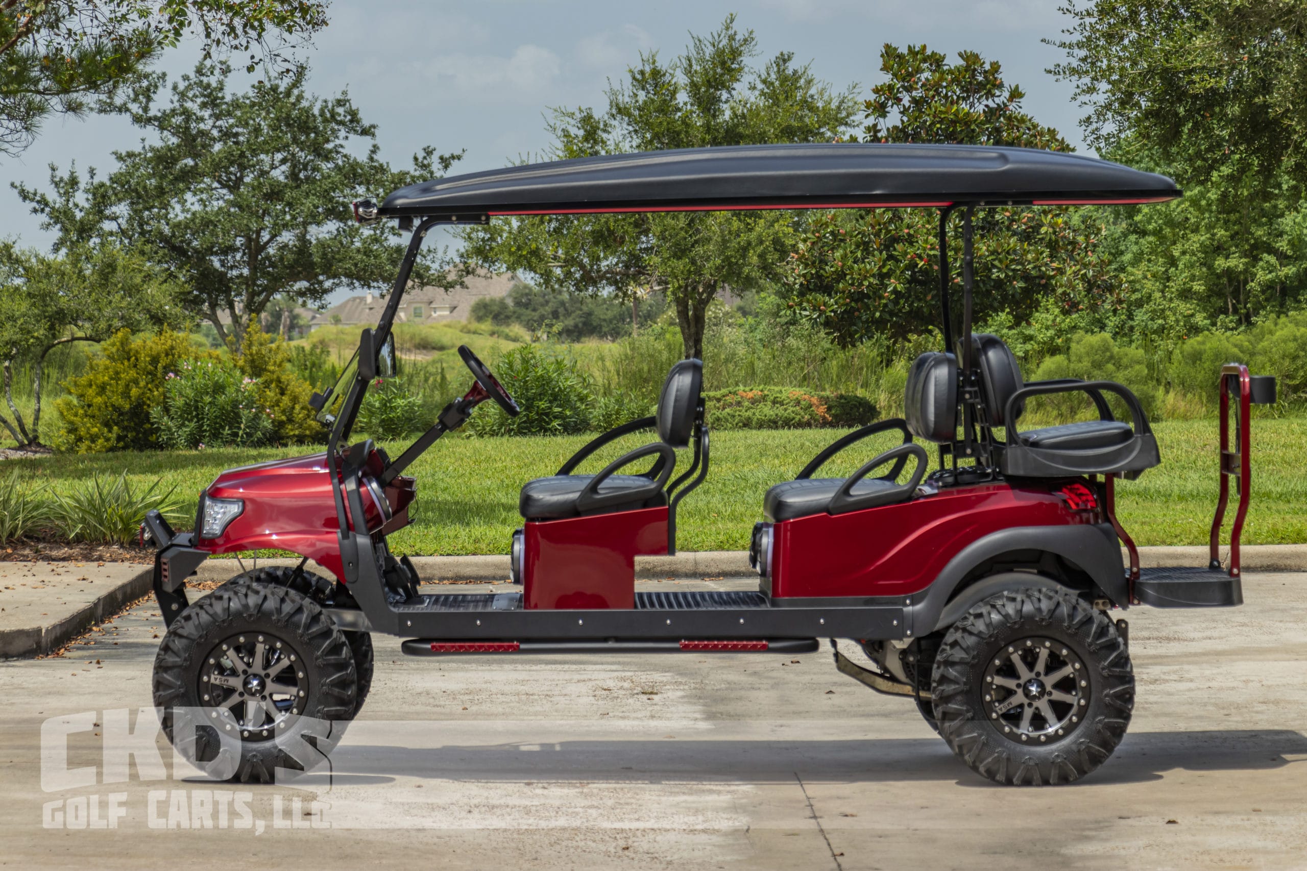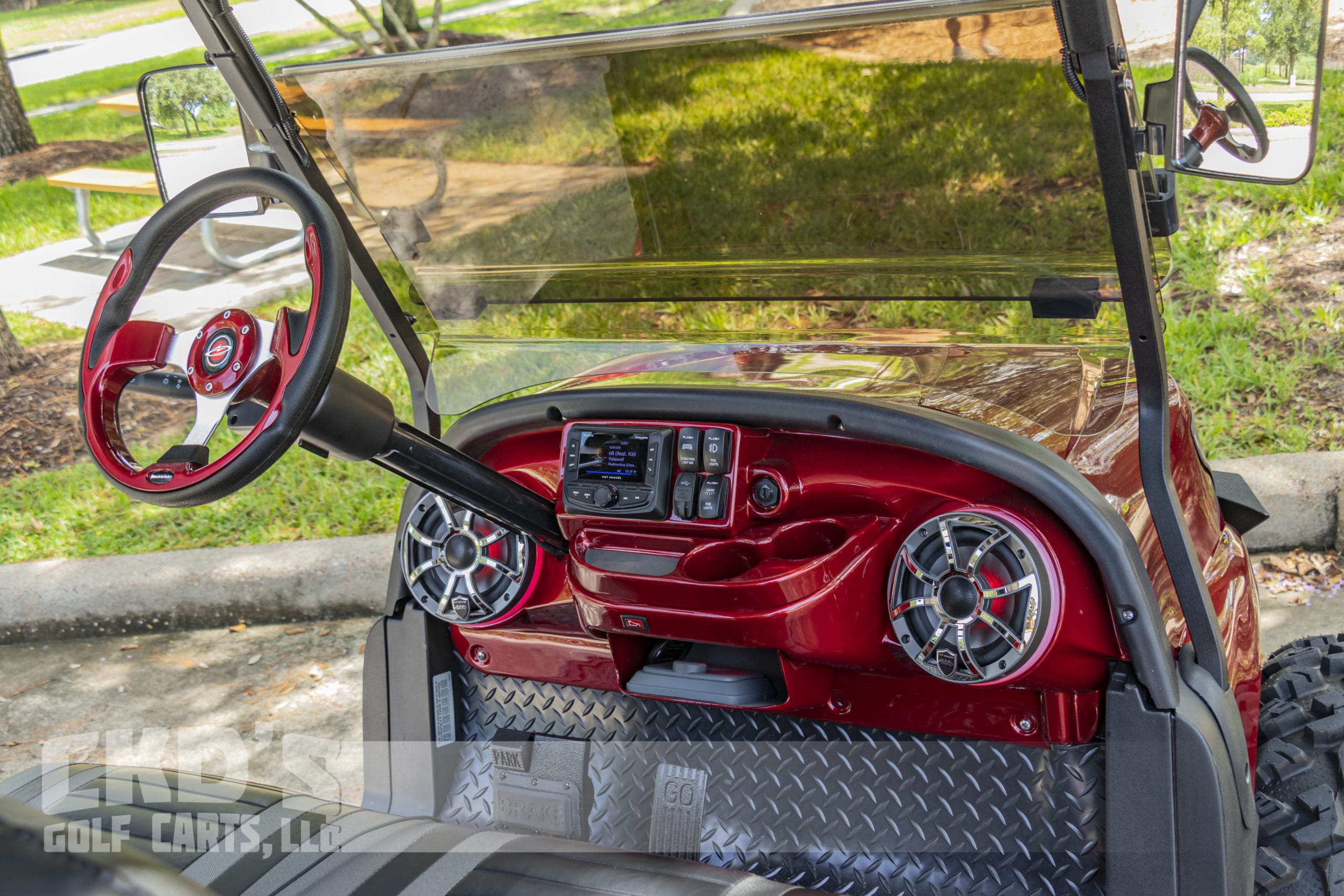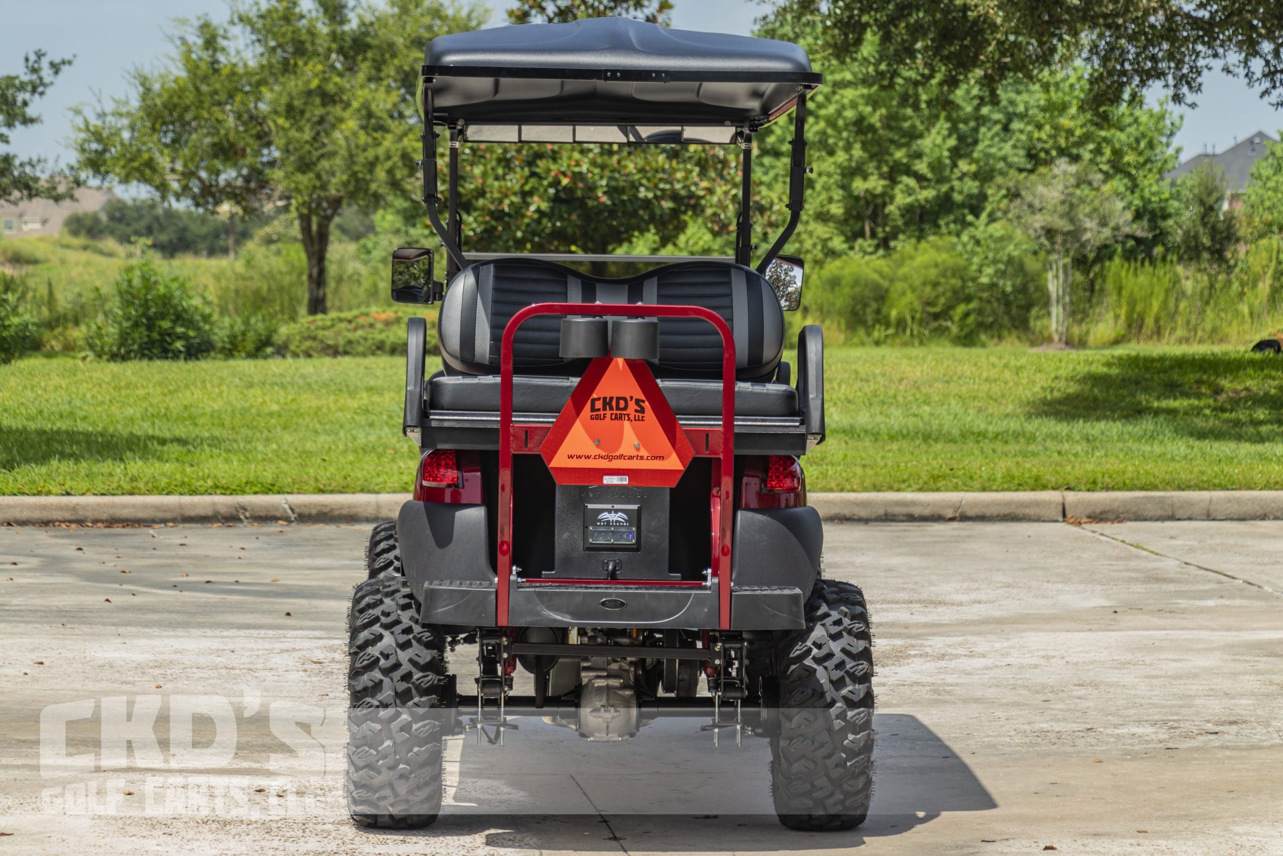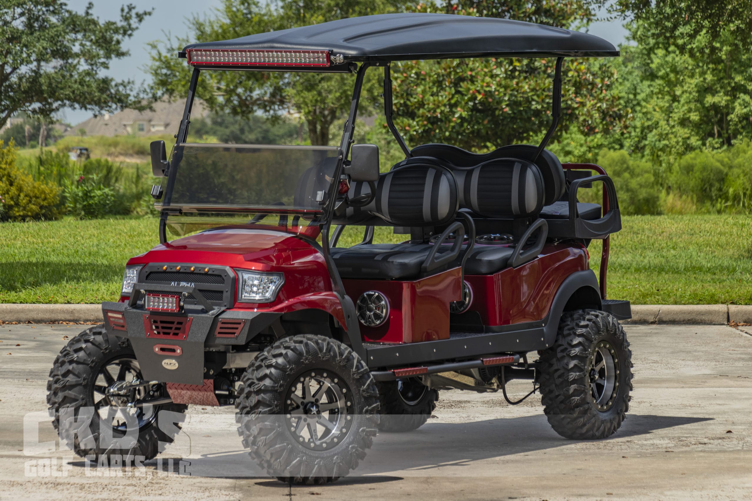 Custom-built 2016 Club Car Alpha 6-passenger stretched “Mini-Monster” EFI gas-powered ‘limo’ golf cart! We have custom-built this fine-looking machine using a like new 2016 Club Car Precedent golf cart with the Subaru 14 HP EFI gas engine and we’ve used the best of the best on this cart! The cart has had our fresh full reconditioning service and the engine has been serviced as well! We’ve done a new 6-seater “stretch” conversion and installed the following accessories: the exciting tough-looking and unique custom painted Alpha bodies and the proven 8″ heavy duty USA-made All Sports Long Travel lift (for the smoothest ride!), Heavy-duty rear leaf springs, newest style 15″ MSA M21 LOK wheels with huge 28″ EFX MotoClaw radial tires, custom black powder-coated drop-down style nerf bars with body color-matched diamond plate steps, custom black and graphite Extreme Striped seats, custom front MadJax heavy-duty brush guard with body color-matched accent pieces, 6″ RGB back-lit Plashlights LED light bar, winch mount (and we can add a Warn 2000 pound remote-operated winch)! Front color-matched seat pod with under-seat storage area, 112″ black extended top with built-in RGB LED accent lighting (change it to any color you’d like with an app on your phone.) This cart also features our new fold-down top system so you can fit it in your toy hauler or even your standard garage!
