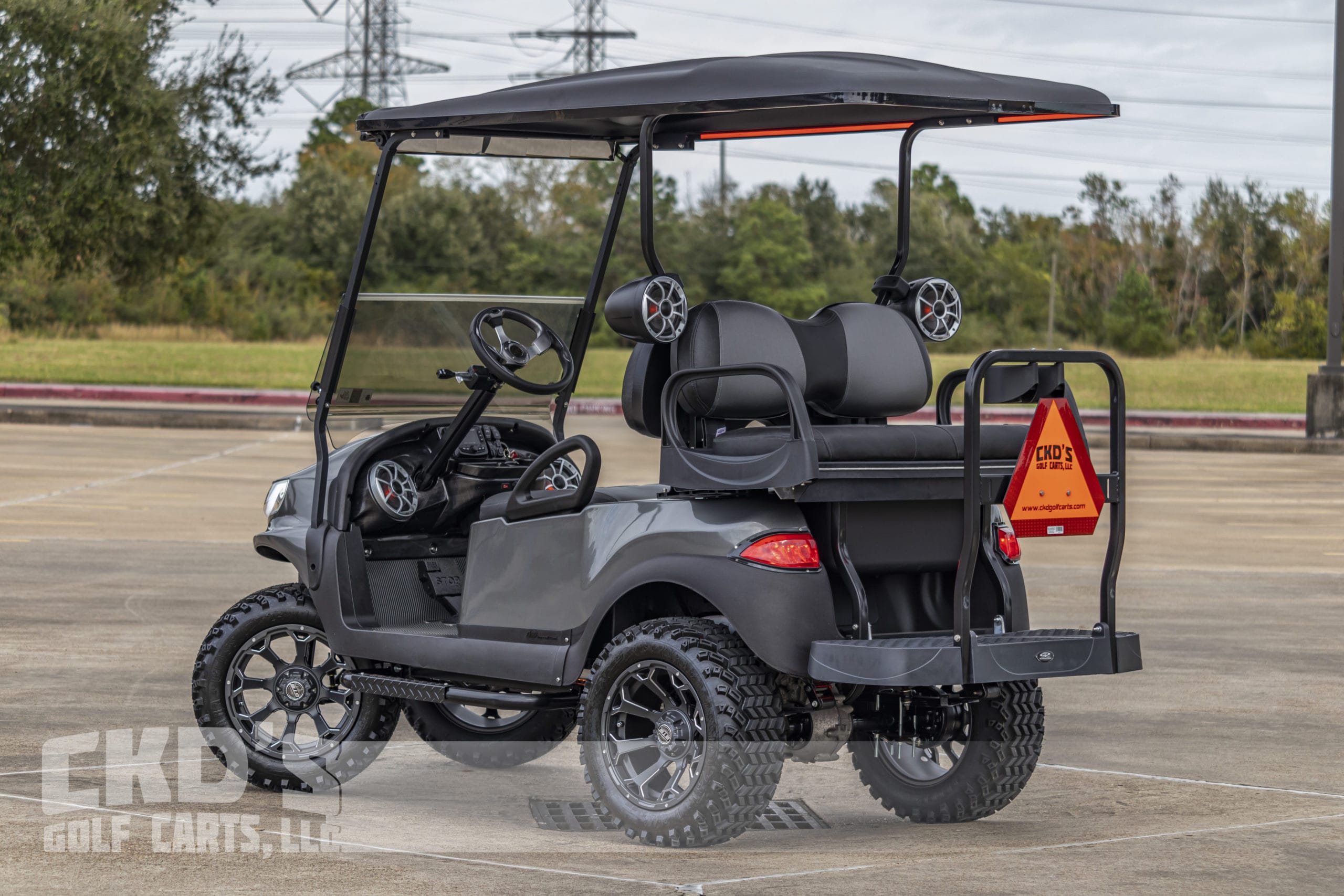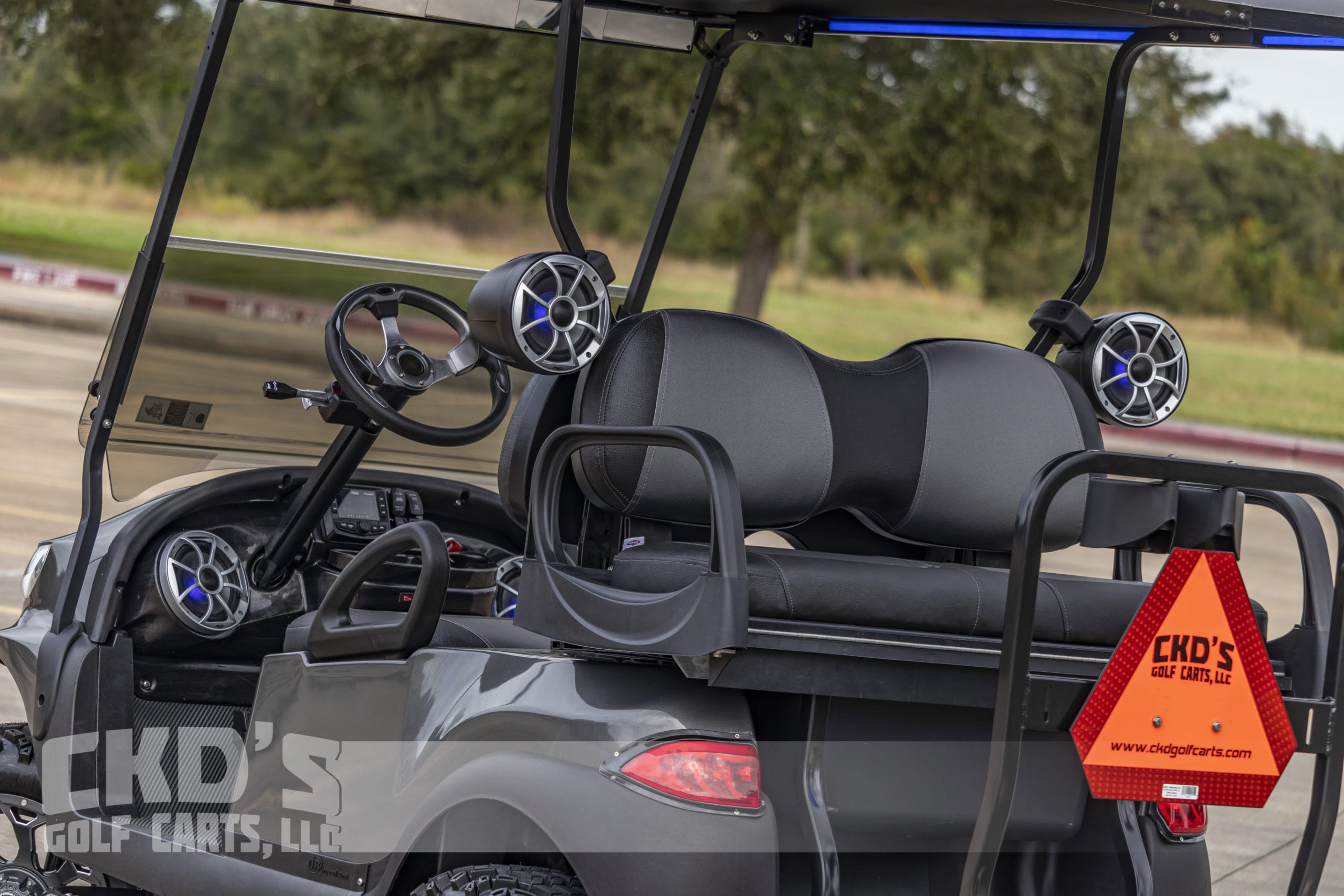 Custom built 2016 Club Car Phoenix body fuel-injected, lifted gas golf cart, with the newer Subaru electronic fuel injected gas engine! Like all of our carts, this cart has had a fresh full reconditioning service and the following accessories have been installed: huge Trojan AGM starter battery, All Sports 6″ A-Arm lift kit, heavy-duty rear leaf springs, 23″ tires mounted on 14″ matte grey Raven wheels, Graphite Grey Metallic bodies, new style black carbon floor mat, black 80″ top with the built-in track in which we installed RGB (color-changing) LED lights and then also RGB underbody lights. New style grey woodgrain VIP dash with (2) Revo 6 speakers, Wetsounds MC-20 head unit, dual USB charging ports, garage door opener, accessory switches for the LED light bars and the RGB lights, and uncommon key (so no one steals your ride!), Wetsounds Recon pod speakers and we can also add a Wetsounds AS-10 powered Subwoofer (for that extra bump in your trunk!), New style Black and Grey Veranda seats, black powder-coated USA-made Max 5 rear flip seat with stainless hardware, black plastic (no-rust) footpan, hidden storage compartment (ice chest) and swivel cup-holders. Custom black and grey steering wheel with black hub adapter, hazard light switch, Ultimate LED light kit (includes LED headlights, daytime running lights, taillights, brake lights, emergency flashers, turn signals, and horn), custom made black powder coated nerf bars with black diamond plate steps. The cart also has a tinted folding “magnetic mount” windshield, 5-panel mirror, and SMV (slow-moving vehicle) sign.