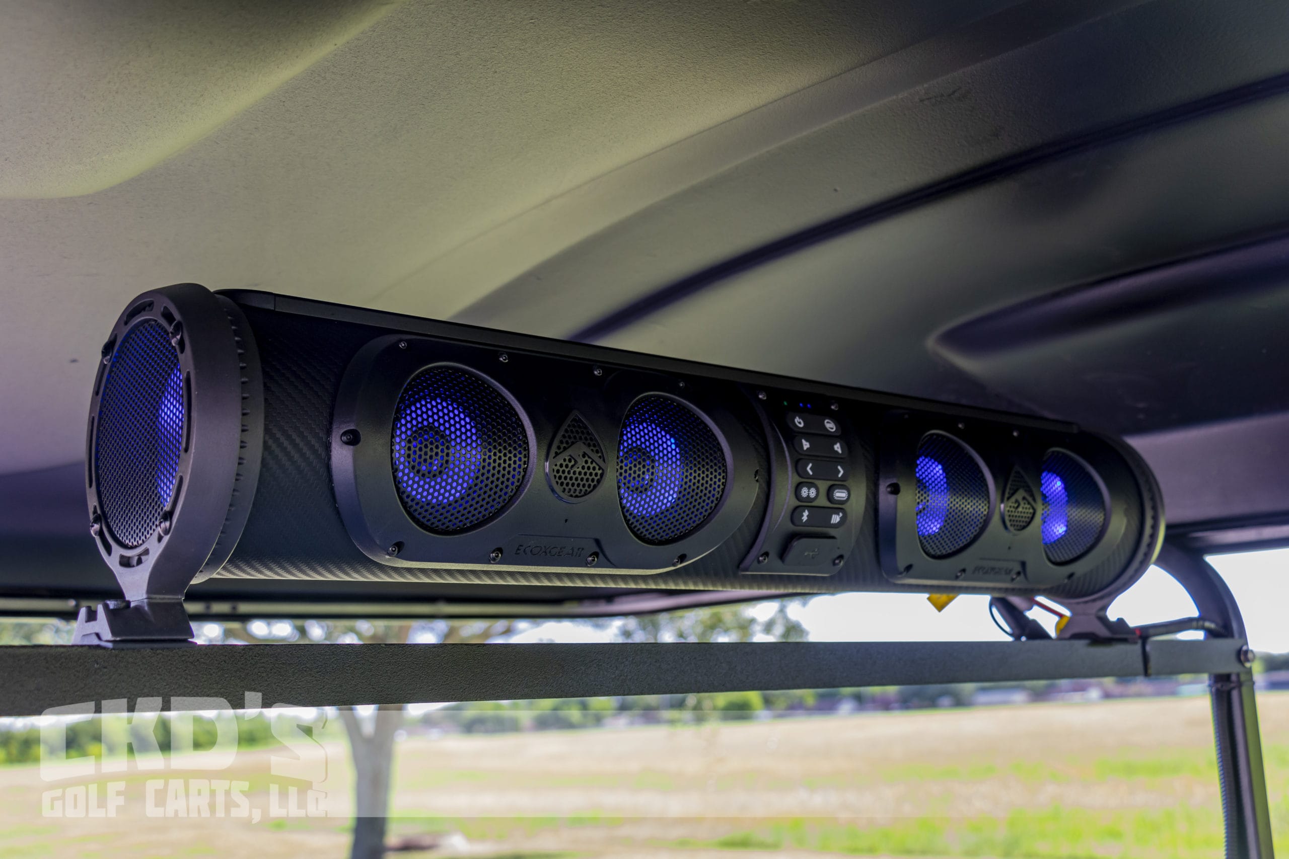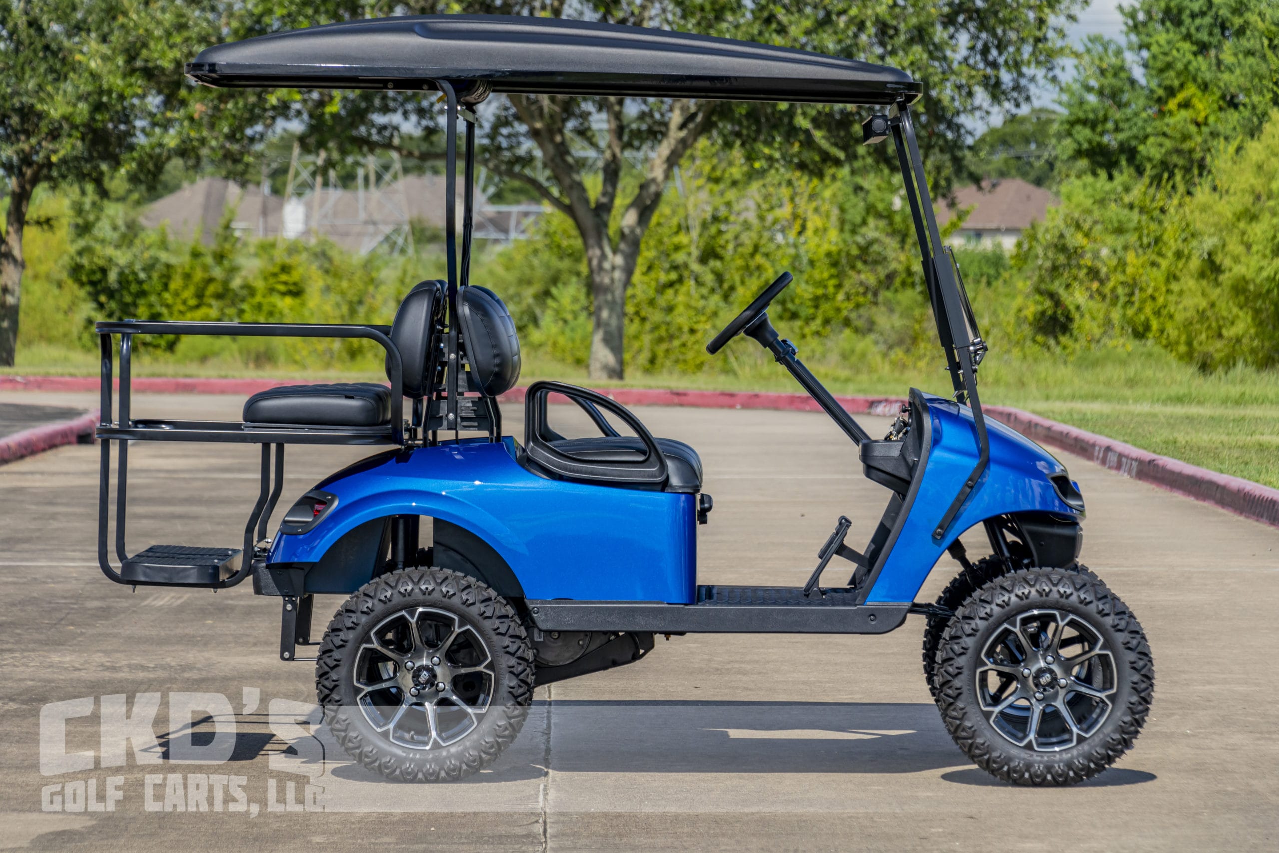 Like New Ford Lightning Blue Metallic 2017 EZGO TXT Gas golf cart with the renowned Kawasaki FJ400 engine and as with all of our carts, it has had a fresh full reconditioning service! In customizing the cart we have installed the following accessories: 5″ heavy duty USA-made All Sports 5″ axle type lift kit, heavy-duty rear leaf springs, 14″ Black and machined wheels with the 23×10-14″ Carlisle All-Trail all-terrain tires, FORD Lightning Blue Metallic OEM style painted bodies, Ultimate LED light kit (includes LED headlights, LED taillights, LED brake lights, turn signals, emergency flashers, and a horn), extended 80″ blacktop with built-in track in which we can install LED colored RGB accent lights, Black and grey hand-pleated custom seat upholstery, USA made Guardian black powder-coated aluminum rear flip seat with stainless hardware and black plastic “no-rust” footpan. New black diamond plate rubber floor mat, custom black steering wheel and black hub adapter, 5-panel mirror, tinted folding magnetic latch windshield, EcoXGear Bluetooth Powersports soundbar, and SMV sign. This cart is sweet! Ask about our extended warranty package and about financing!