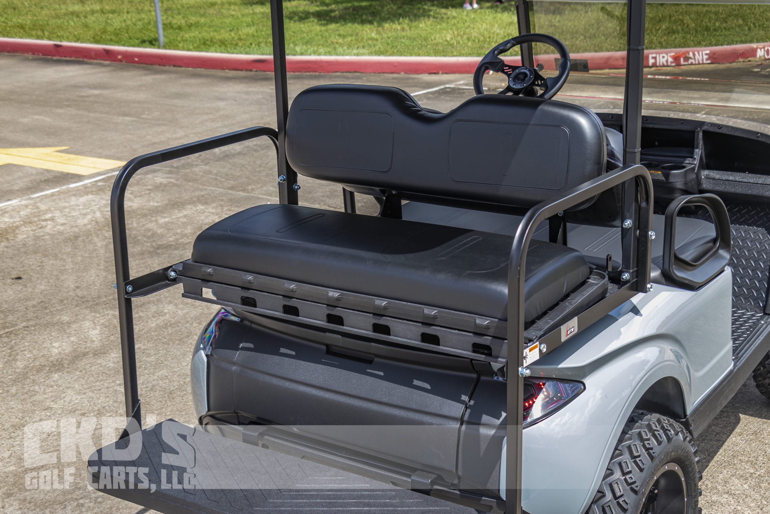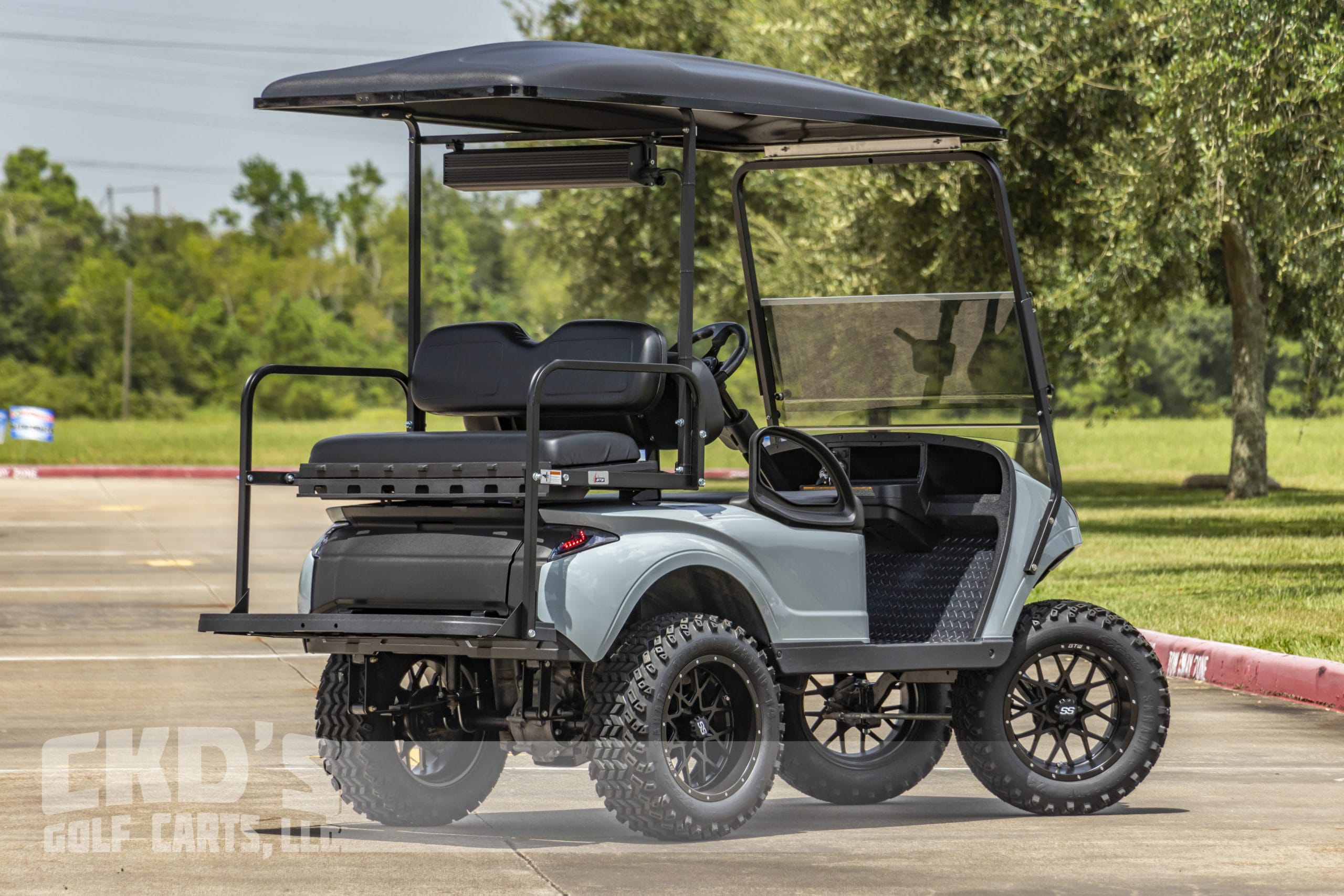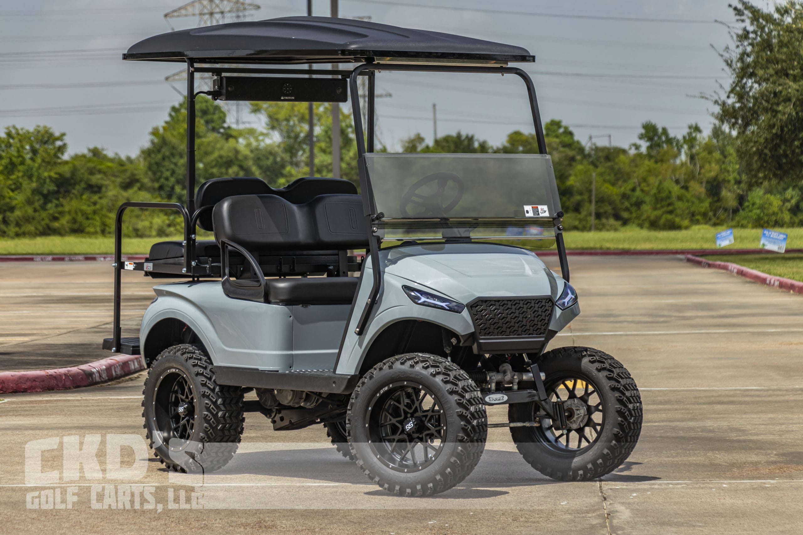 Like New Storm Body 2017 EZGO TXT Gas golf cart with the renowned Kawasaki FJ400 engine and as with all of our carts, it has had a fresh full reconditioning service! In customizing the cart we have installed the following accessories: New Cement Grey Storm Body Kit, 5″ heavy duty USA-made All Sports 5″ axle type lift kit, heavy-duty rear leaf springs, 14″ Black and machined Vortex wheels with the 23×10-14″ Sahara Classic all-terrain tires, Ultimate LED light kit (includes LED headlights, LED taillights, LED brake lights, turn signals, emergency flashers, and a horn), extended 80″ blacktop with built-in track in which we can install LED colored RGB accent lights, Black OEM seat upholstery, Mach 3 black rear flip seat with black plastic “no-rust” footpan. New black diamond plate rubber floor mat, custom carbon fiber steering wheel and black hub adapter, 5-panel mirror, tinted folding magnetic latch windshield, Triton Bluetooth Powersports soundbar, and SMV sign. This cart is sweet! Ask about our extended warranty package and about financing!